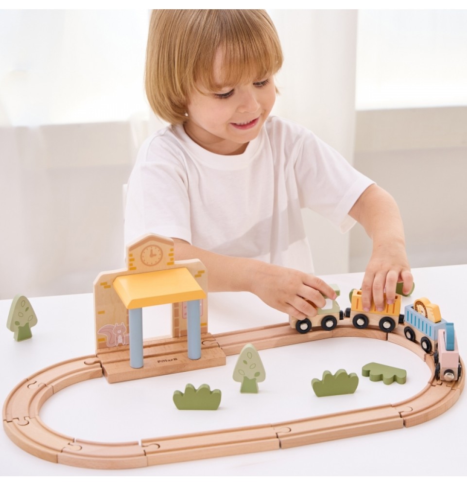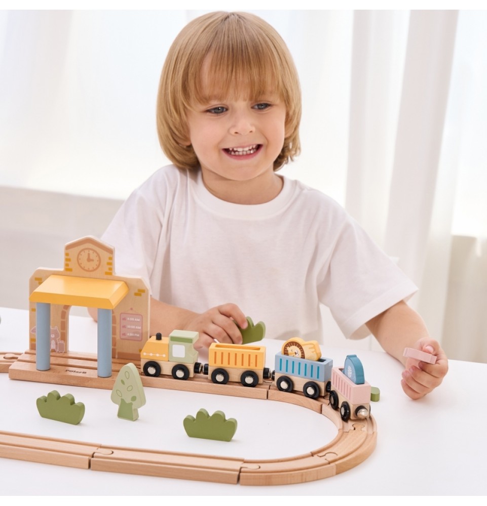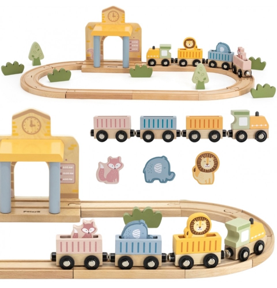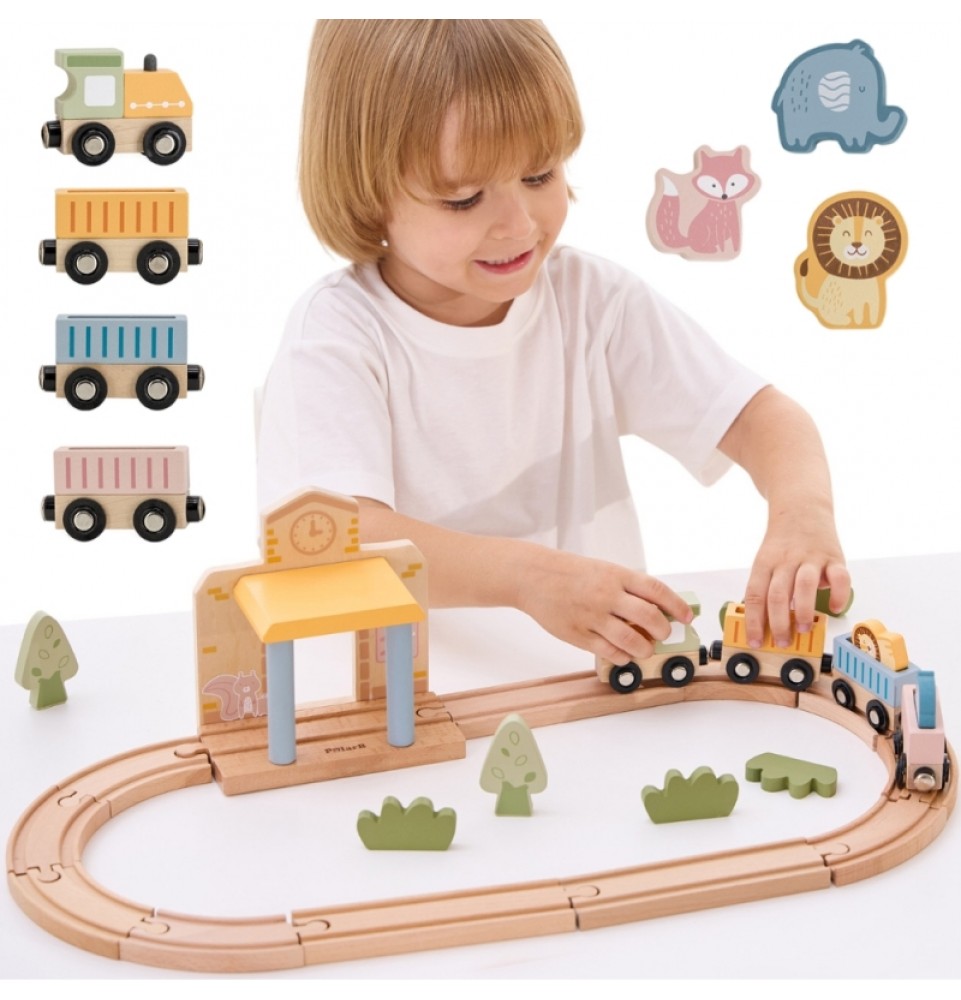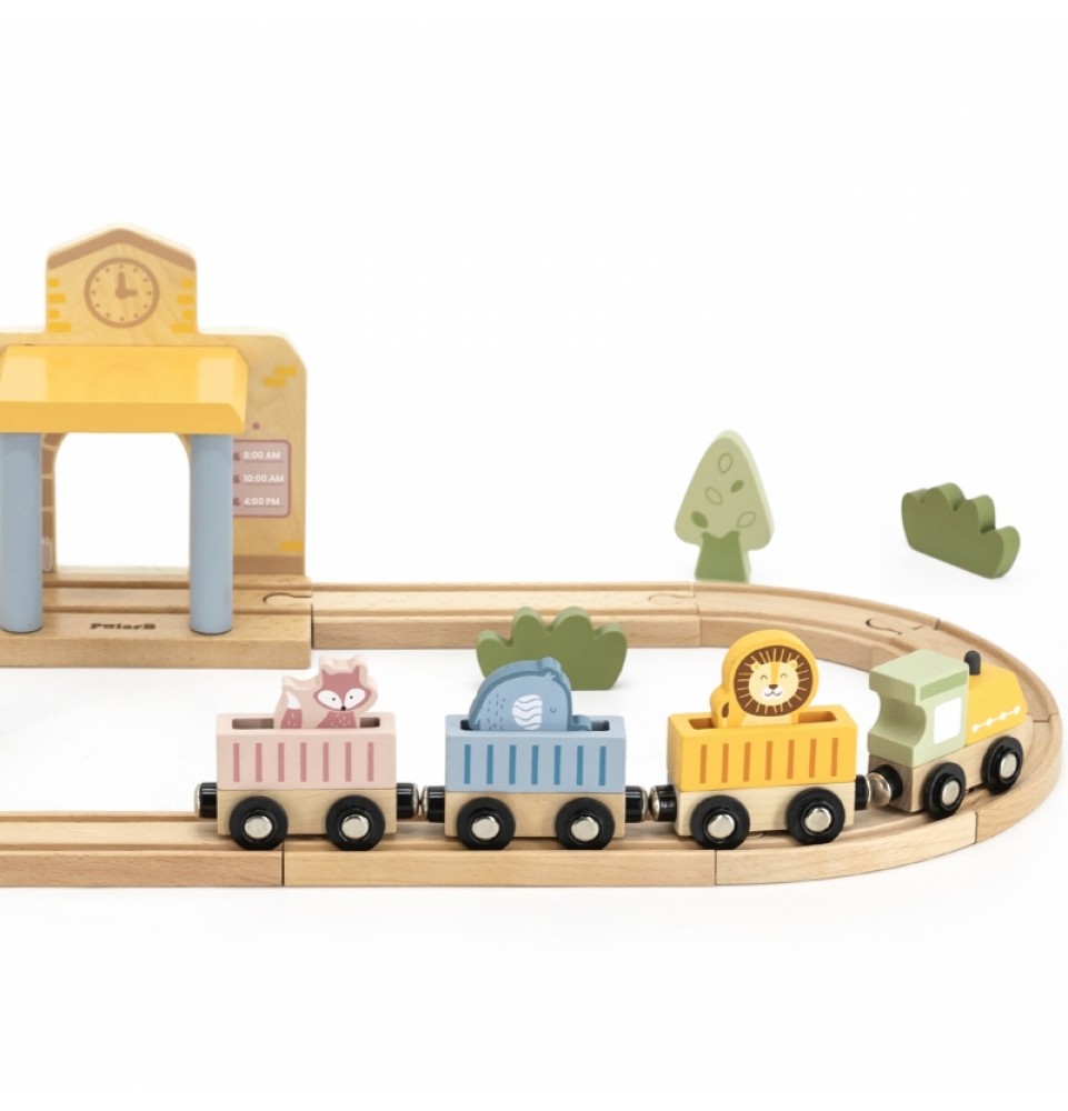 „PolarB“ medinis traukinių rinkinys (30 dalių) – puikus pasirinkimas mažiesiems traukinių entuziastams! Jį sudaro 30 dalių, įskaitant įvairius bėgius, interaktyvią stotį ir priedus, leidžiančius vaikams kurti savo žaidimo scenarijus. Pridedamas vadovas leidžia lengvai sukurti realistišką traukinių stoties aplinką. Magnetiniu būdu aktyvuojama garso funkcija, kuri įsijungia traukiniui pravažiuojant pro stotį, daro žaidimą dar įdomesnį. Medinės dalys yra tvirtos ir patvarios, o jų universalumas skatina vaikus leistis į nevaržomą ir kūrybišką žaidimą.