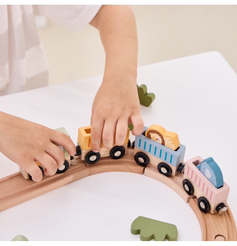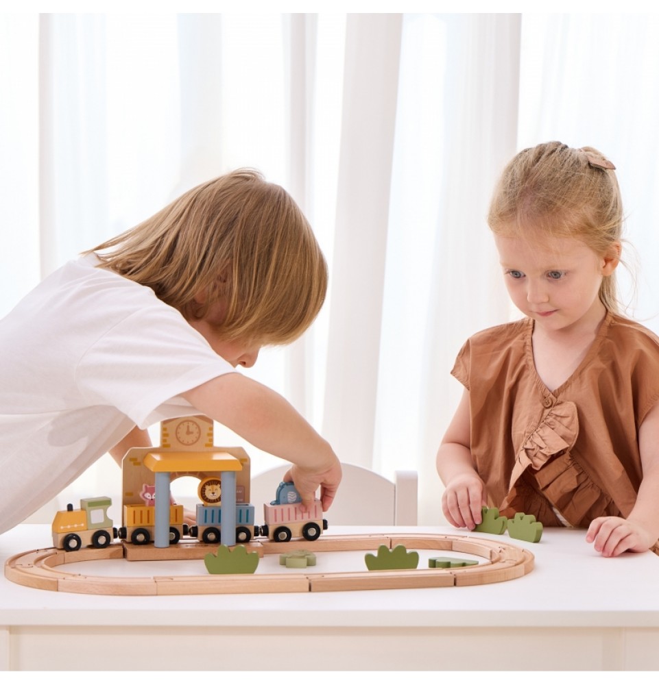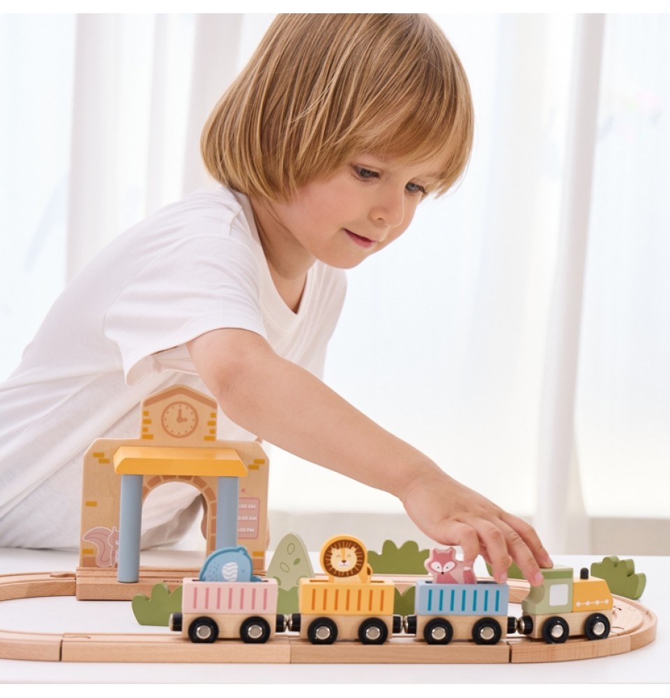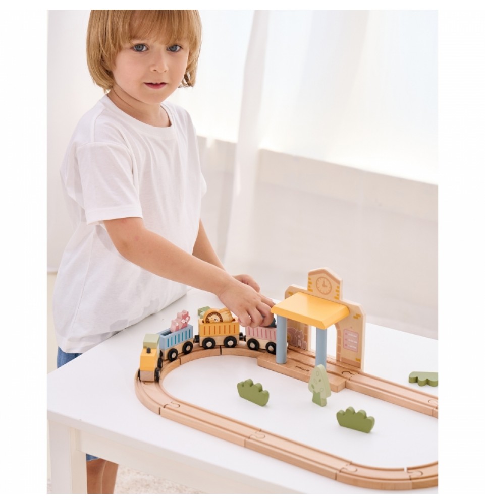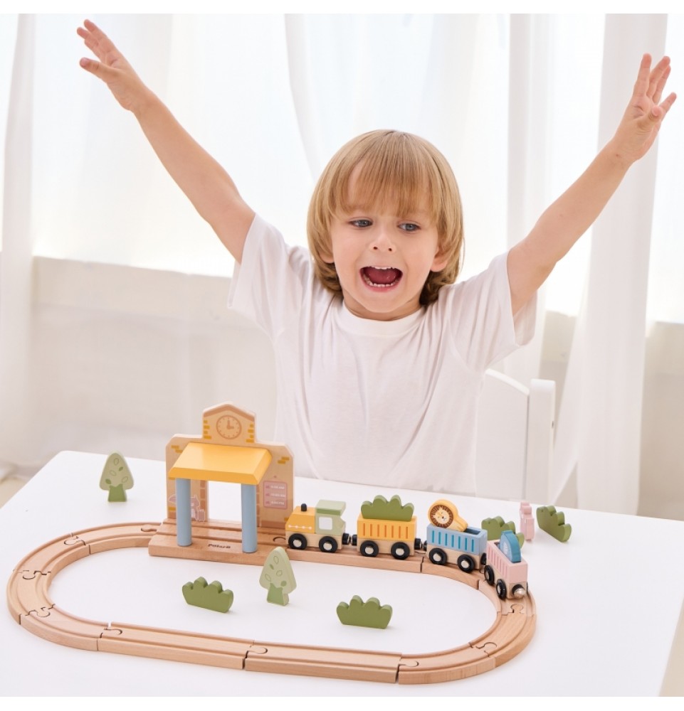 „PolarB“ medinis traukinių rinkinys (30 dalių) – puikus pasirinkimas mažiesiems traukinių entuziastams! Jį sudaro 30 dalių, įskaitant įvairius bėgius, interaktyvią stotį ir priedus, leidžiančius vaikams kurti savo žaidimo scenarijus. Pridedamas vadovas leidžia lengvai sukurti realistišką traukinių stoties aplinką. Magnetiniu būdu aktyvuojama garso funkcija, kuri įsijungia traukiniui pravažiuojant pro stotį, daro žaidimą dar įdomesnį. Medinės dalys yra tvirtos ir patvarios, o jų universalumas skatina vaikus leistis į nevaržomą ir kūrybišką žaidimą.