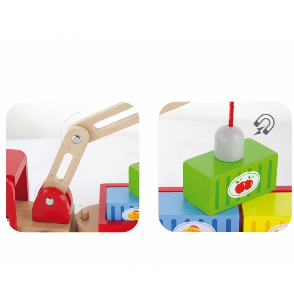 Medinis kranas turi judančią rankeną ir keturis medinius konteinerius su magnetais, kuriuos galima pakelti. Krano pagrindas yra pasukamas. Spalvingas kranas su konteineriais yra vizualiai patrauklus ir skatina žaisti. Priekabą galima nuimti nuo transporto priemonės nutraukiant ją nuo medinio kaiščio.
