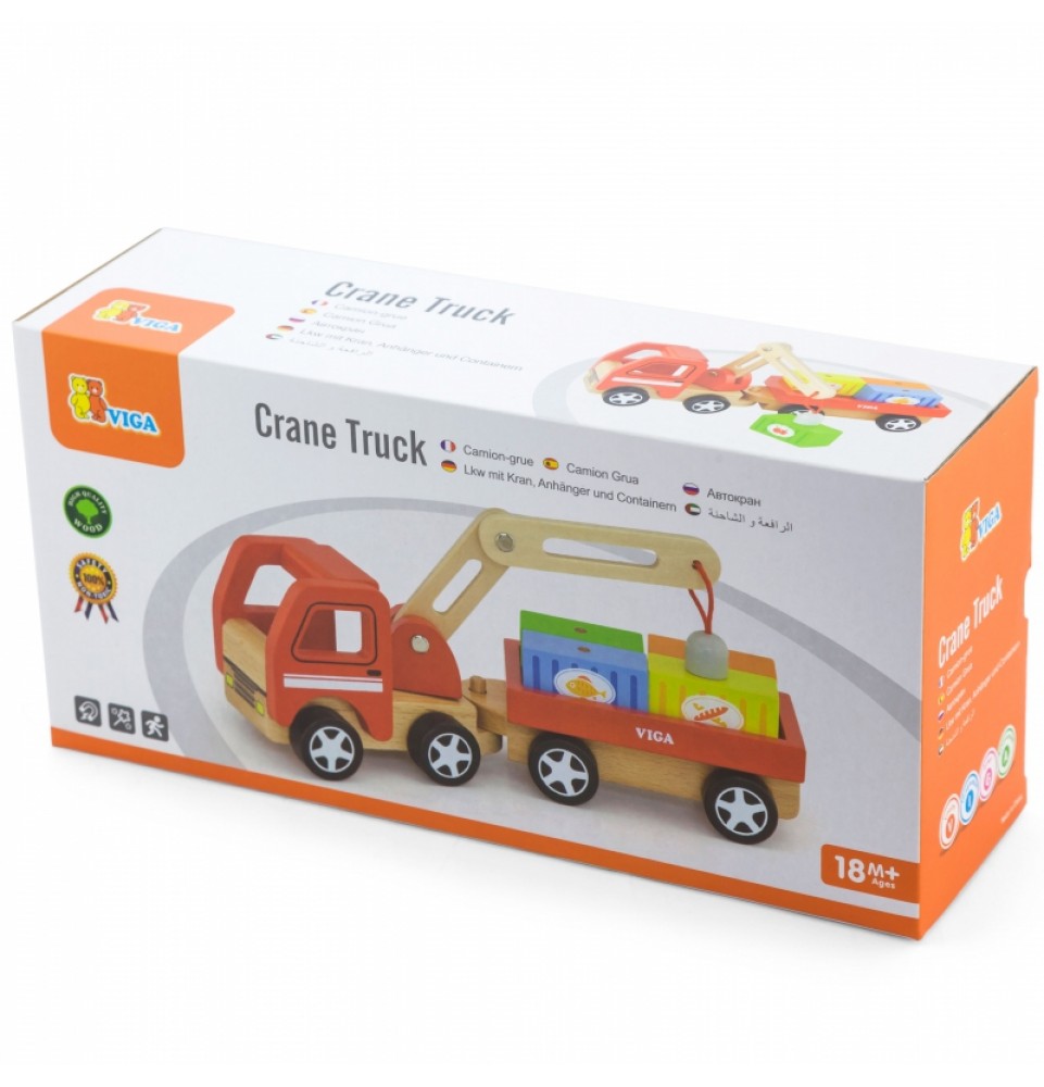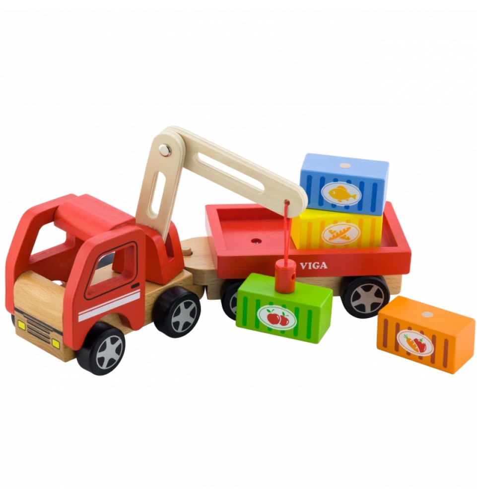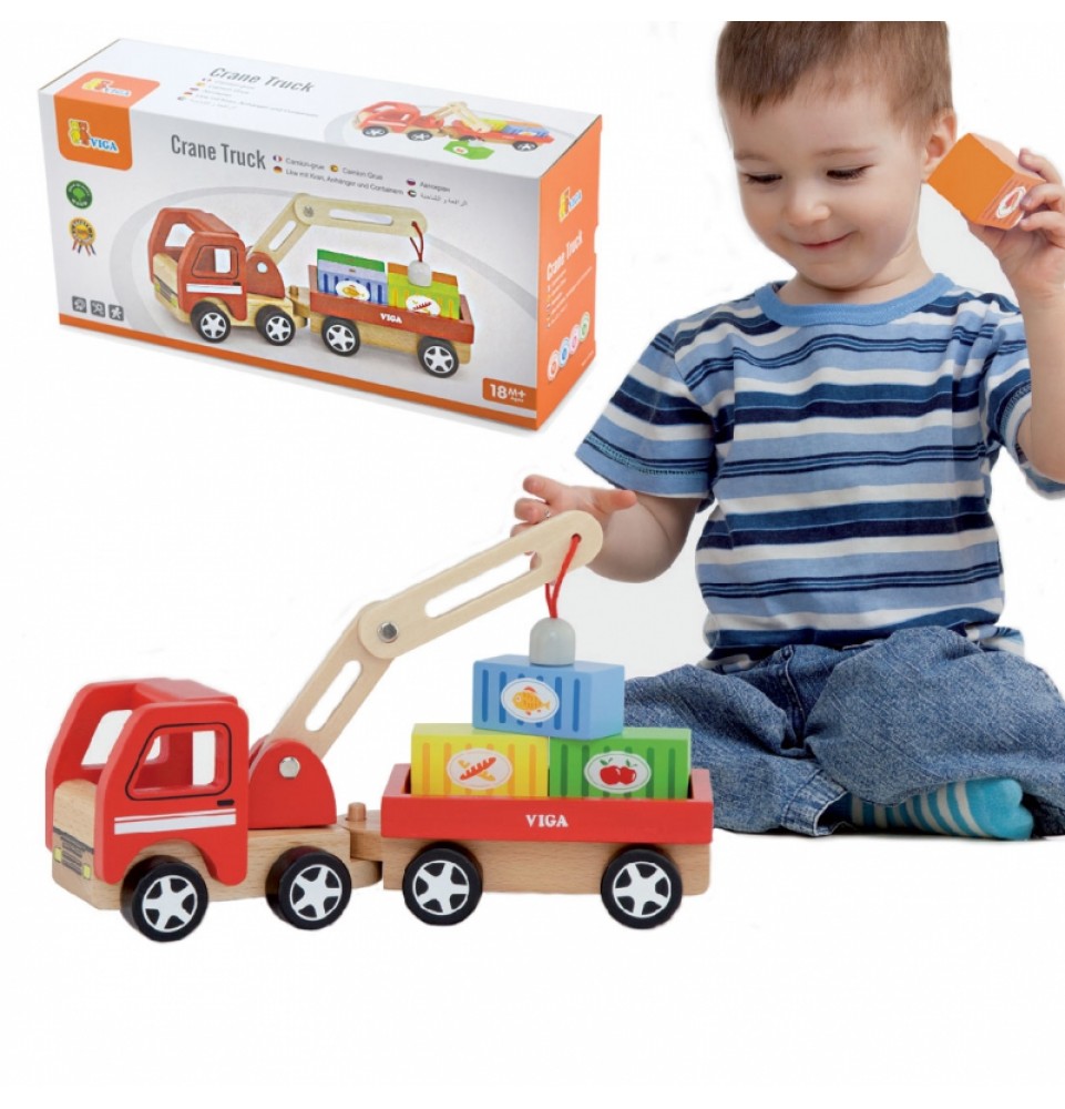 Medinis kranas su konteineriais iš žinomo žaislų gamintojo „Viga Toys“ vaikams nuo 18 mėnesių amžiaus, idealiai tinka darželiui ir namams.