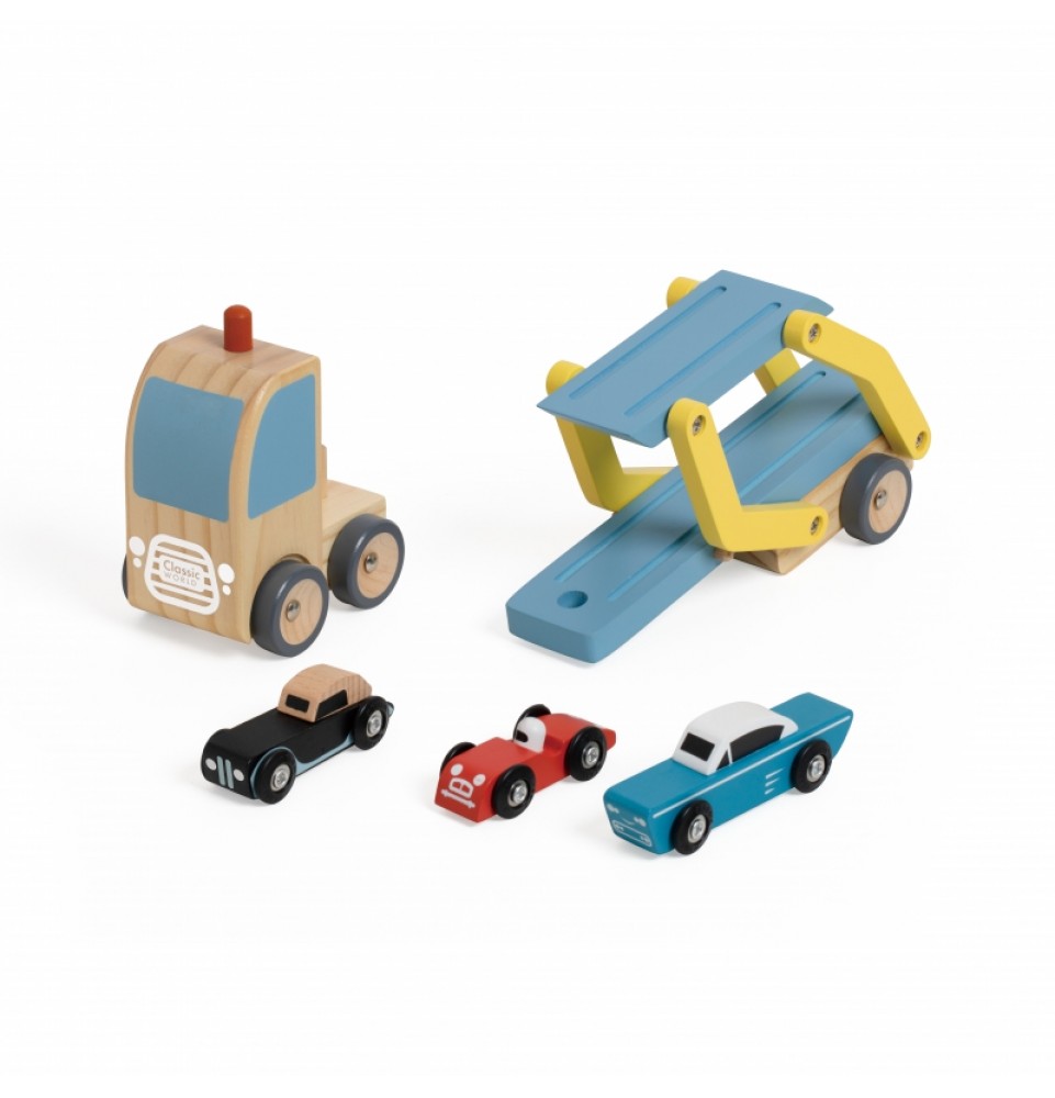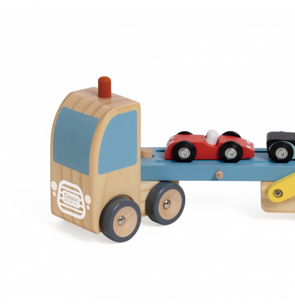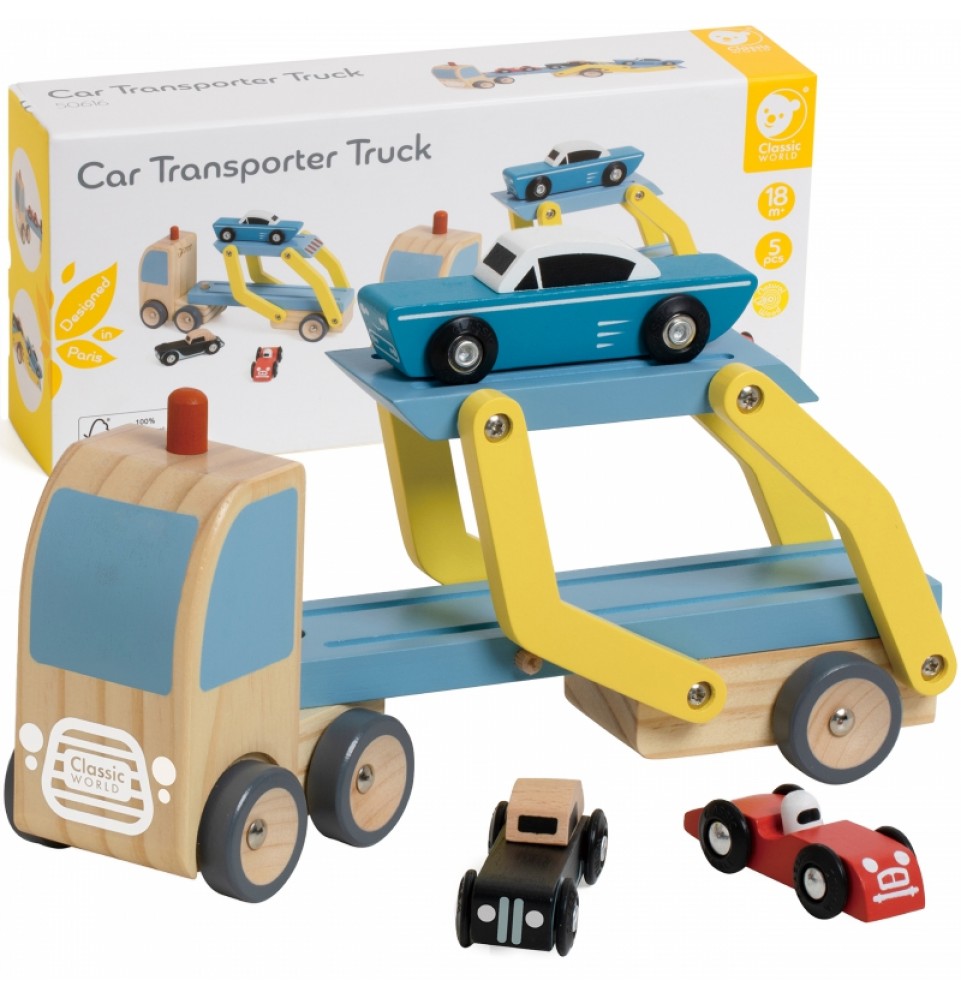 Medinis automobilių transporteris iš CLASSIC WORLD yra patvarus ir aukštos kokybės žaislų rinkinys, kurį sudaro vienas sunkvežimis, rampa su platforma ir trys transporto priemonės. Šis žaislas padeda vaikams lavinti smulkiąją motoriką ir akių bei rankų koordinaciją, tuo pačiu suteikdamas valandų valandas linksmybių pakrovimo ir iškrovimo metu.