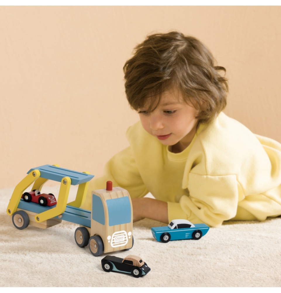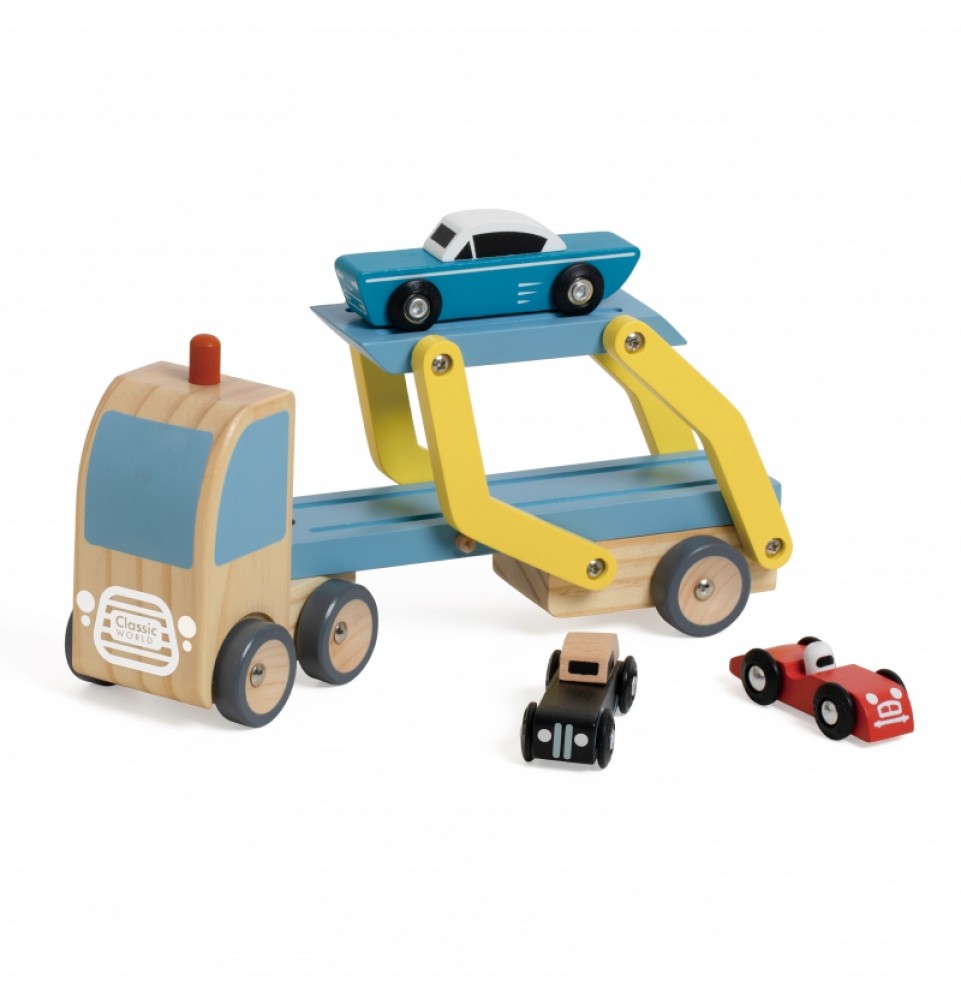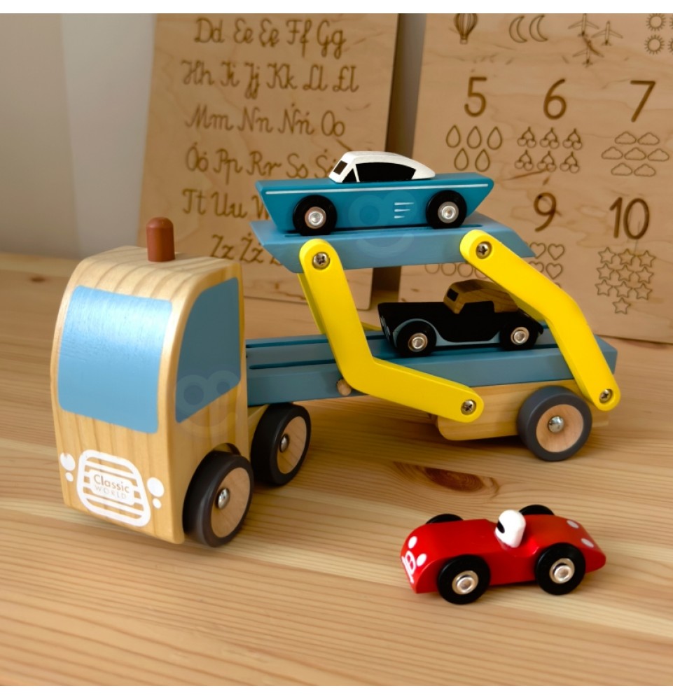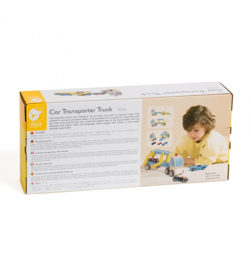 Medinis automobilių transporteris iš CLASSIC WORLD yra patvarus ir aukštos kokybės žaislų rinkinys, kurį sudaro vienas sunkvežimis, rampa su platforma ir trys transporto priemonės. Šis žaislas padeda vaikams lavinti smulkiąją motoriką ir akių bei rankų koordinaciją, tuo pačiu suteikdamas valandų valandas linksmybių pakrovimo ir iškrovimo metu.