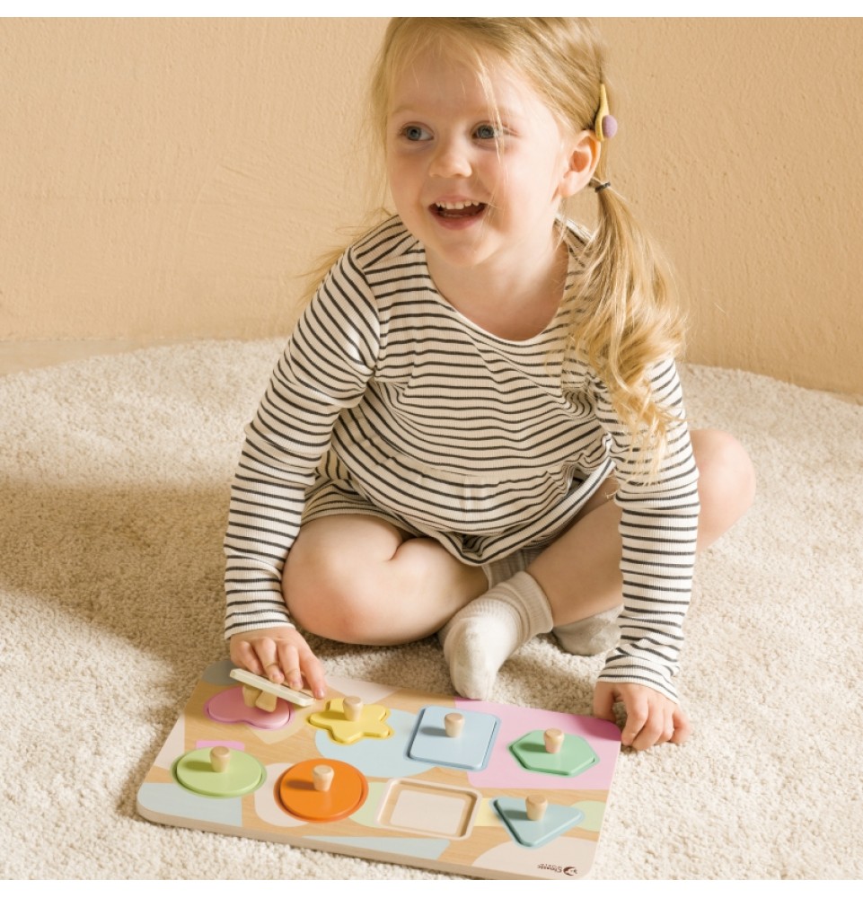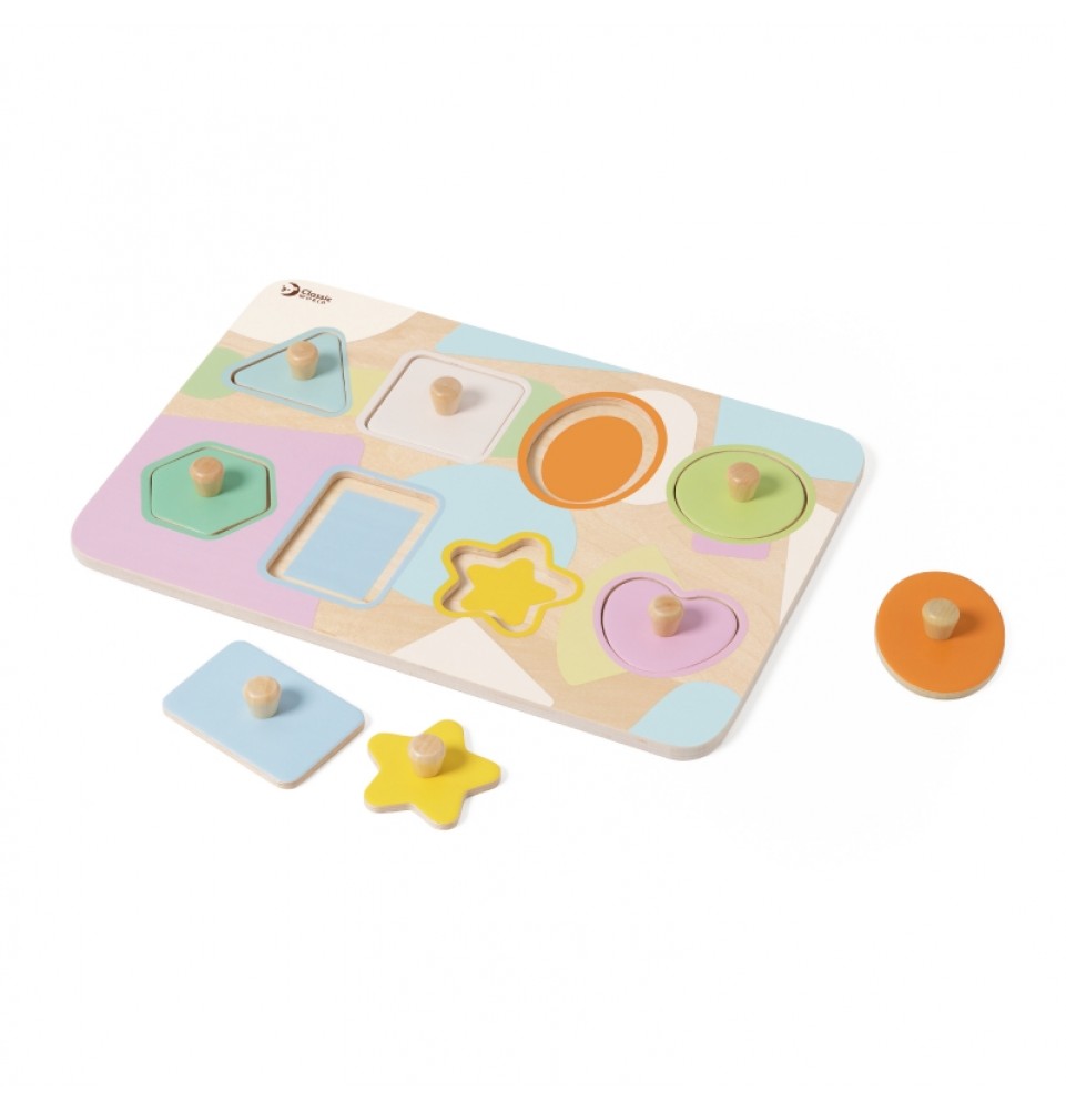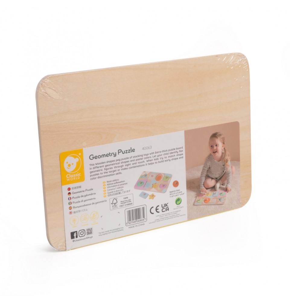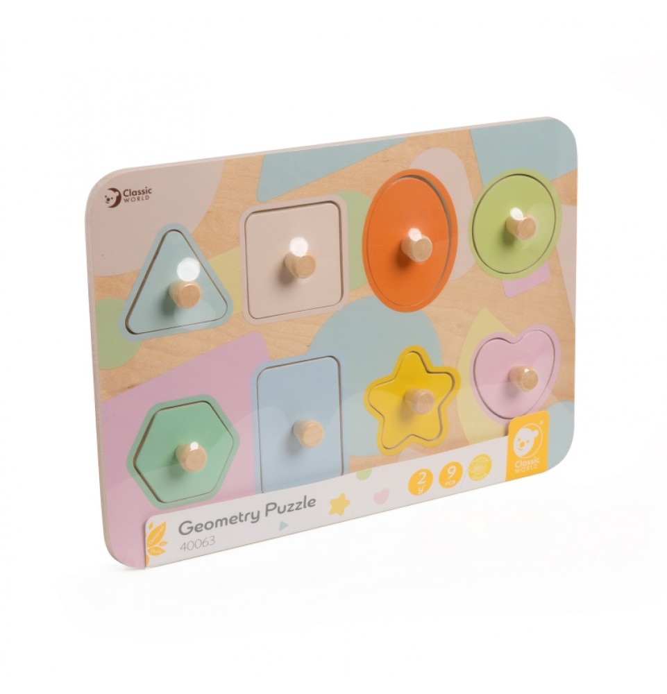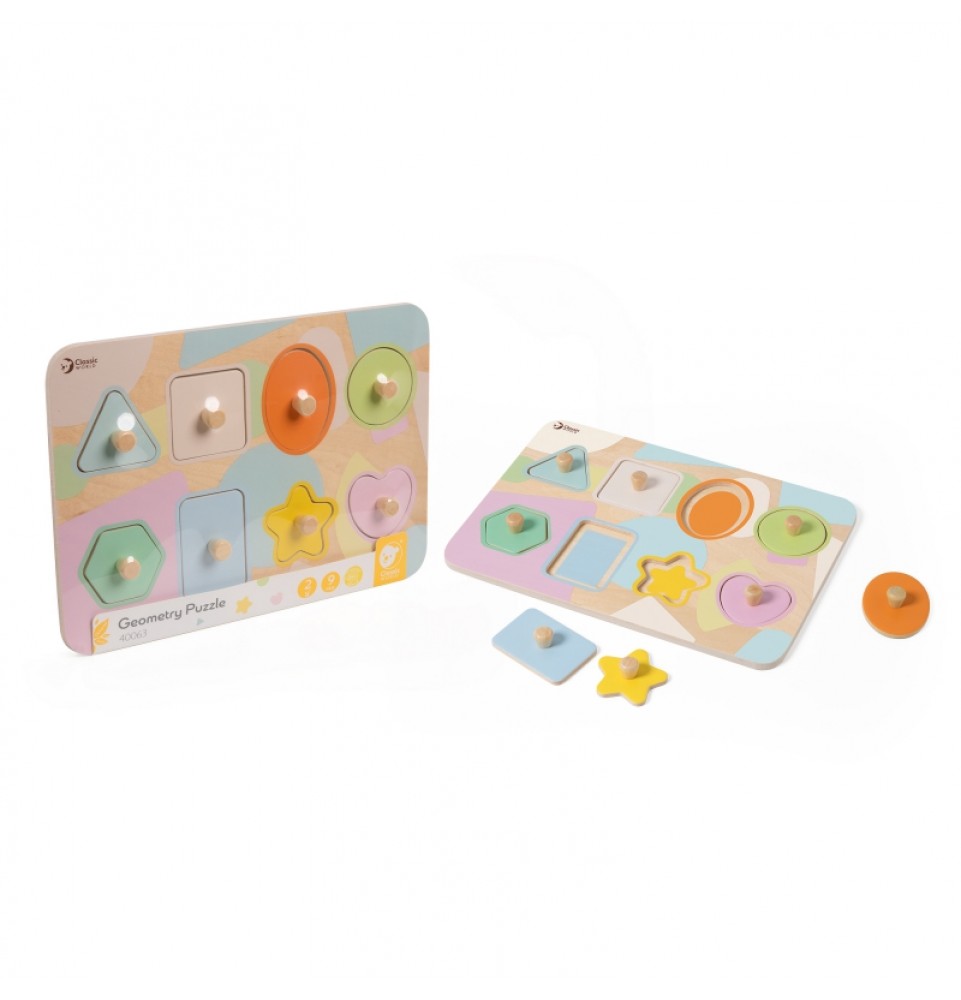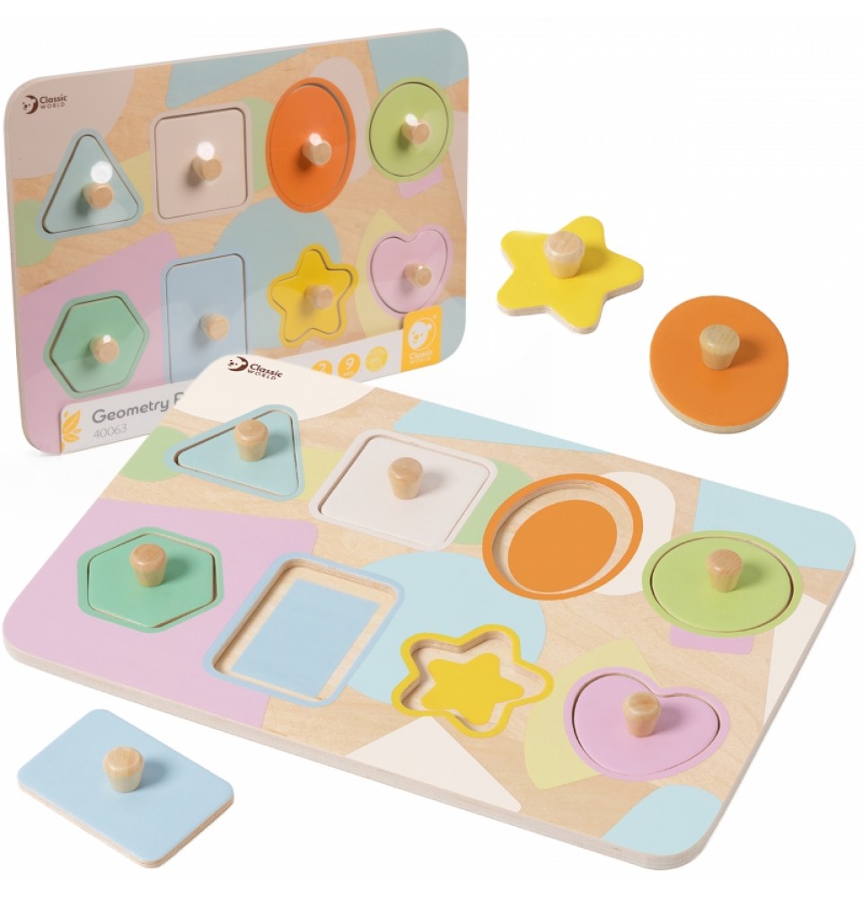 Ši medinė „CLASSIC WORLD“ dėlionė su kaiščiais pasižymi stora lenta su įvairiomis geometrinėmis figūromis pastelinėmis spalvomis. Ji padeda vaikams atpažinti plokščias geometrines figūras tiek vizualiai, tiek lytėjimo būdu. Vaikams bandant sutalpinti dėlionės detales į teisingas vietas arba kurti derinius, jie ankstyvame amžiuje lavina formų ir spalvų skyrimo įgūdžius .