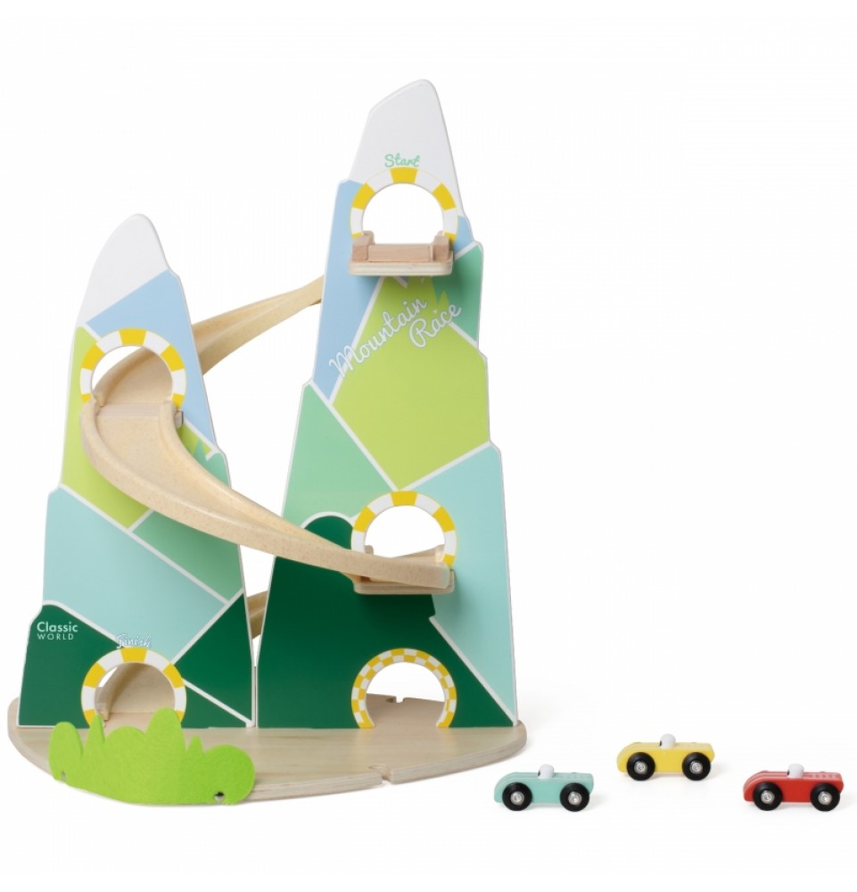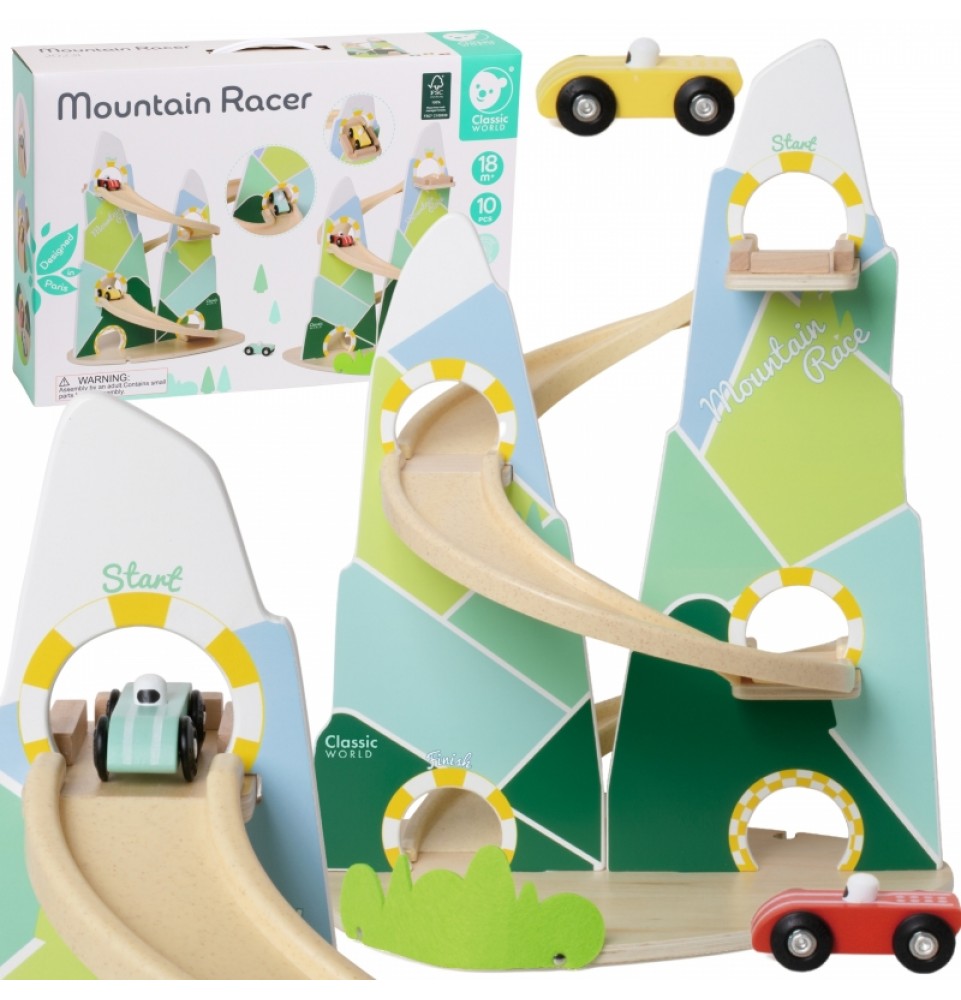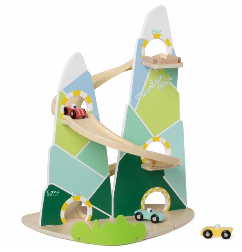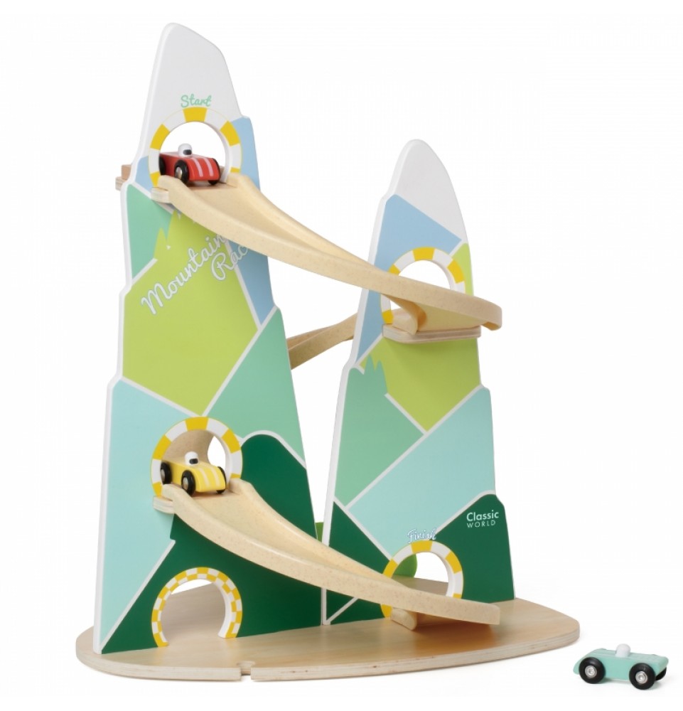 Medinė lenktynių trasa iš „Classic World“ – tai unikalus žaislas, nukelsiantis vaikus į lenktynių azarto kupiną pasaulį! Įkvėpta gražaus kalnų kraštovaizdžio, unikali dviejų kalnų forma pradžiugins kiekvieną vaiką, o kruopščiai pagaminta medinė konstrukcija ir pastelinės spalvos pritrauks akį. Rinkinį sudaro trys spalvingi automobiliai, kurie varžysis vingiuotoje trasoje. Dėl saugaus, be briaunų dizaino trasa puikiai tinka net ir patiems mažiausiems. Tai žaidimas, kuris ne tik linksmina, bet ir lavina loginį mąstymą, padeda lavinti akių ir rankų koordinaciją bei skatina konkurenciją sveikoje atmosferoje.