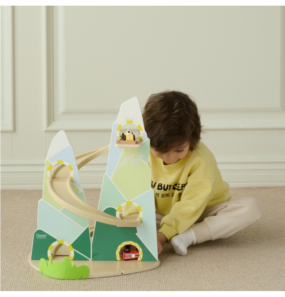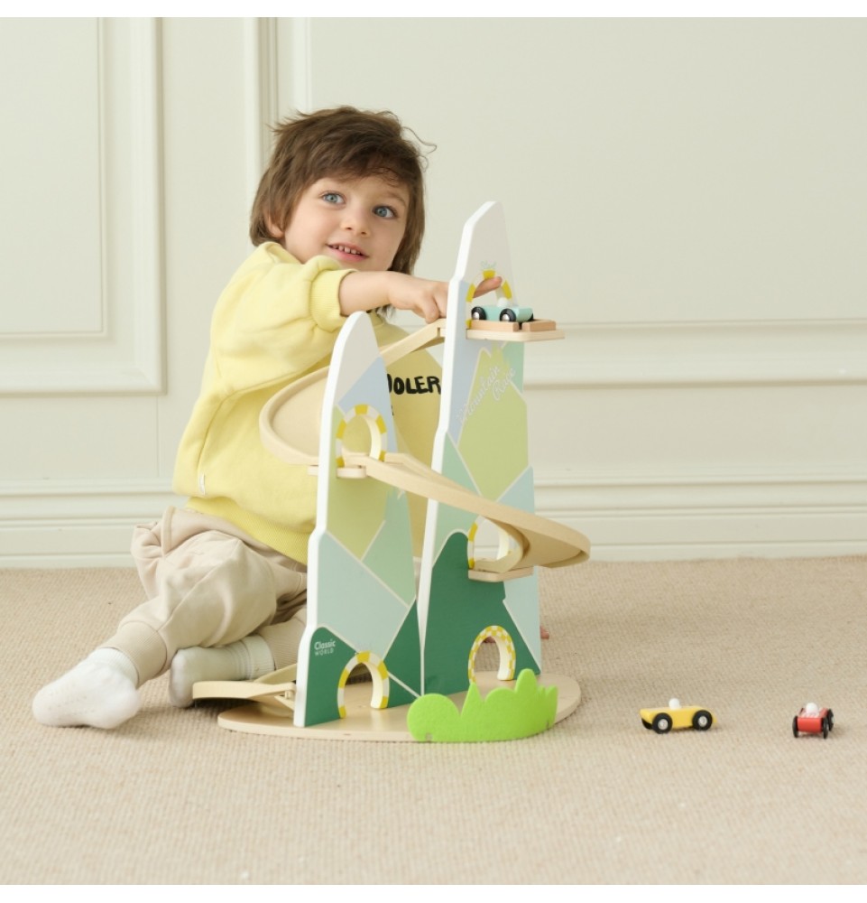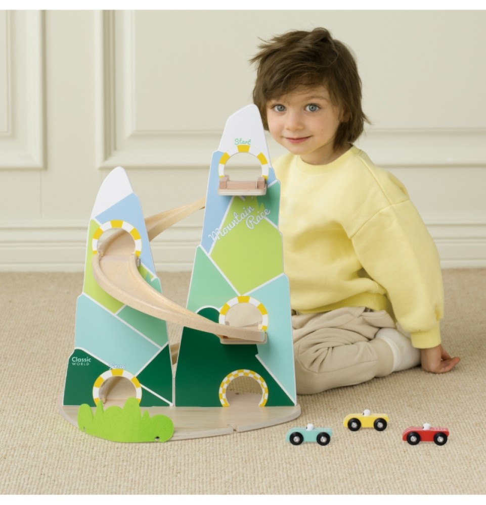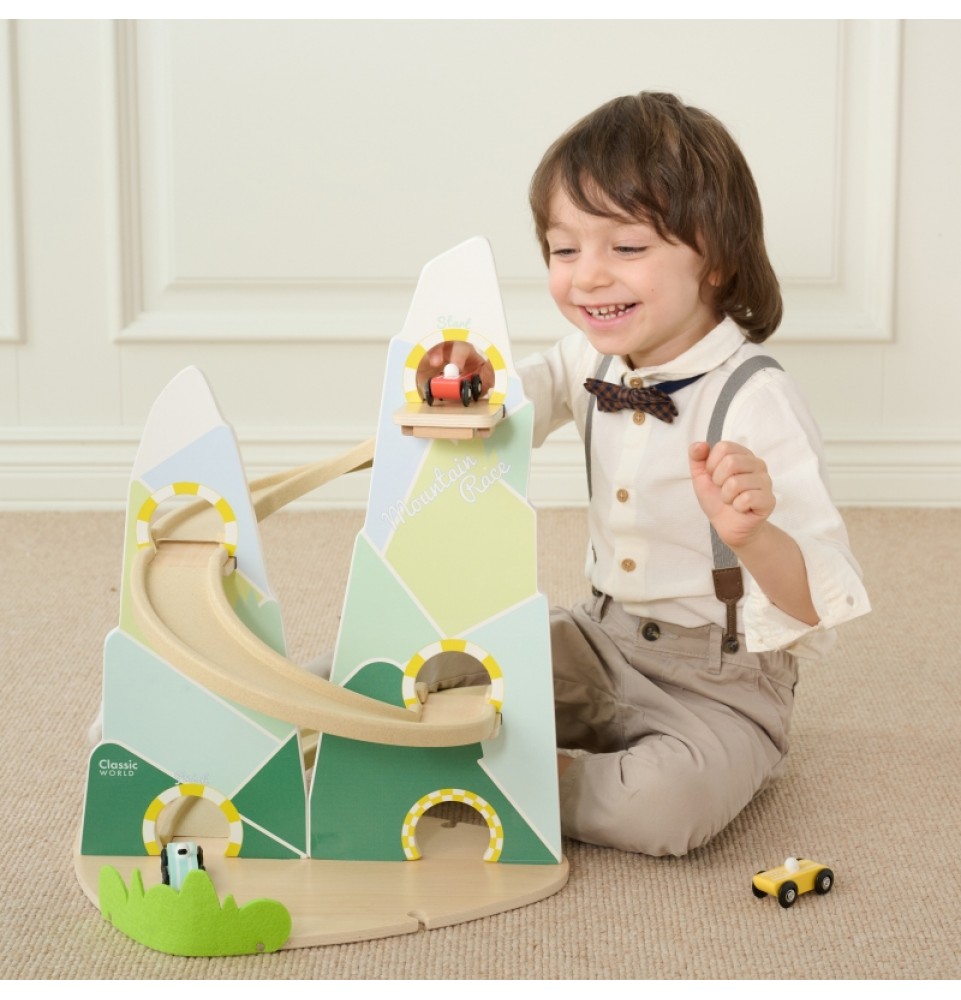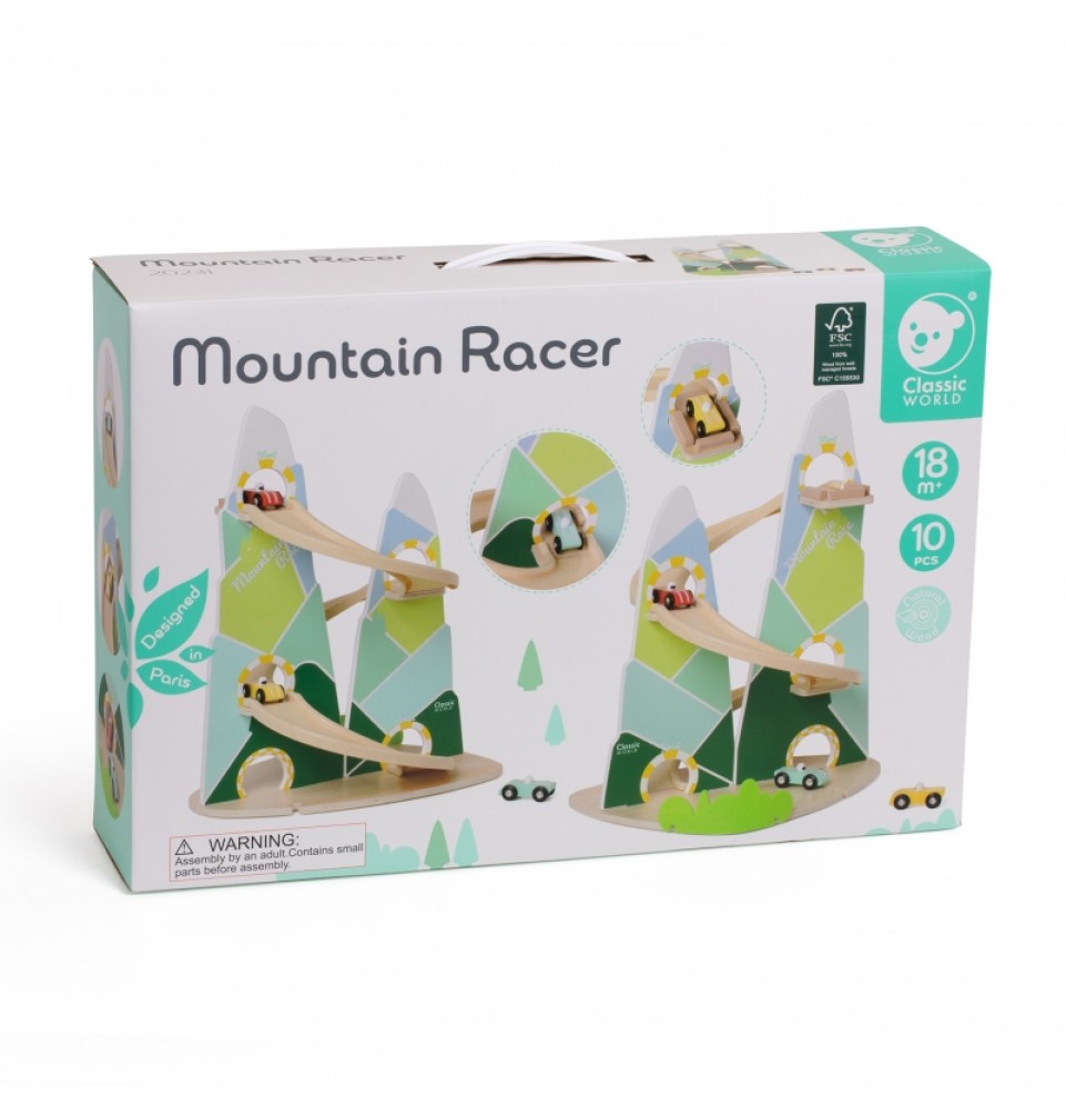 Medinė lenktynių trasa iš „Classic World“ – tai unikalus žaislas, nukelsiantis vaikus į lenktynių azarto kupiną pasaulį! Įkvėpta gražaus kalnų kraštovaizdžio, unikali dviejų kalnų forma pradžiugins kiekvieną vaiką, o kruopščiai pagaminta medinė konstrukcija ir pastelinės spalvos pritrauks akį. Rinkinį sudaro trys spalvingi automobiliai, kurie varžysis vingiuotoje trasoje. Dėl saugaus, be briaunų dizaino trasa puikiai tinka net ir patiems mažiausiems. Tai žaidimas, kuris ne tik linksmina, bet ir lavina loginį mąstymą, padeda lavinti akių ir rankų koordinaciją bei skatina konkurenciją sveikoje atmosferoje.