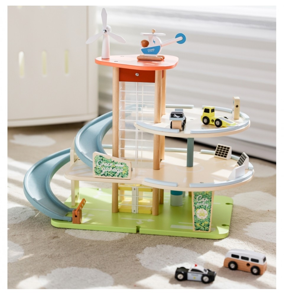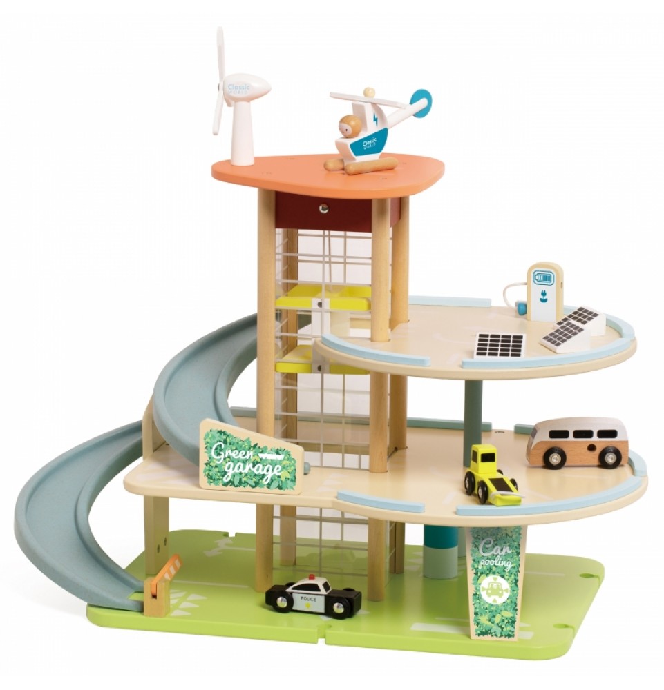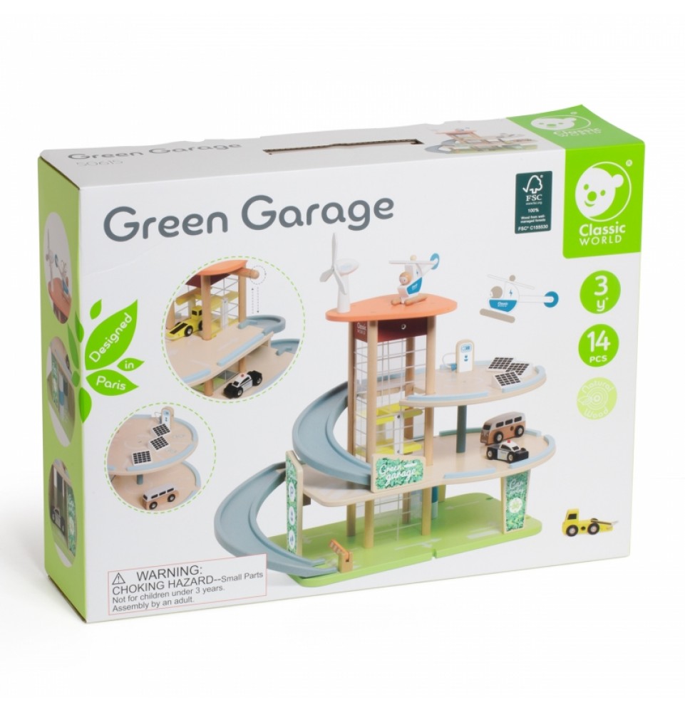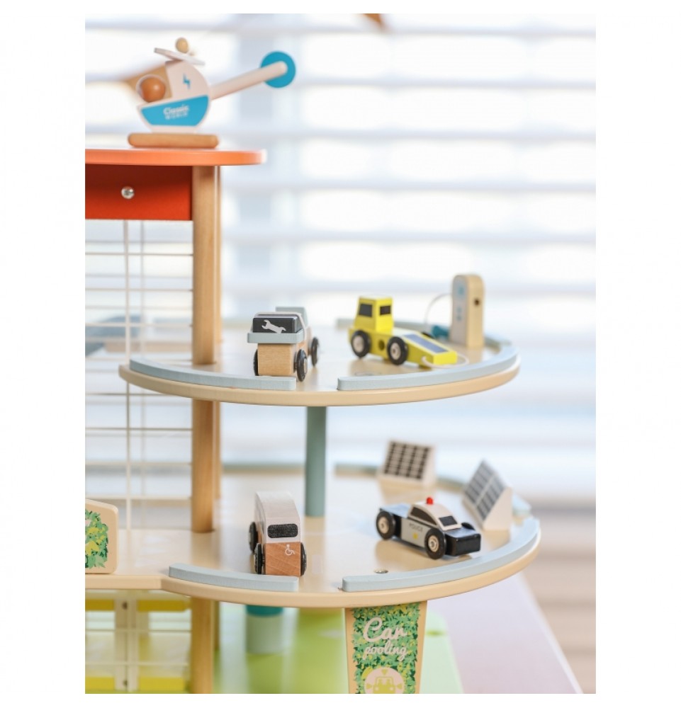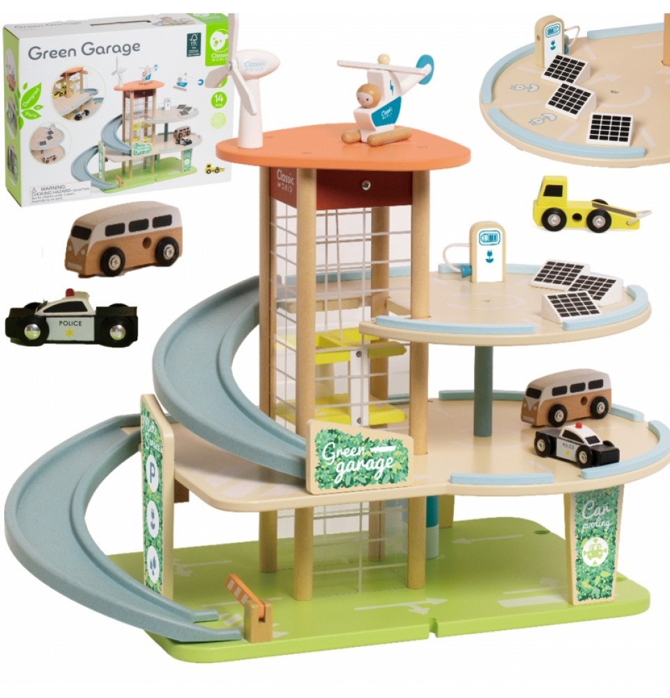 Šis medinis kelių aukštų „Classic World“ automobilių stovėjimo garažas su elektromobilių įkrovimo stotele, liftu, fotovoltinėmis plokštėmis, vėjo malūnu ir sraigtasparnio nusileidimo aikštele sužadins kiekvieno automobilio ir transporto entuziasto vaizduotę. Norint įvažiuoti į automobilių stovėjimo aikštelę arba išvažiuoti iš jos, reikia pakelti užtvarą. Rankiniu būdu valdomas liftas leidžia transporto priemonėms judėti tarp aukštų. Speciali vingiuota rampa leidžia greitai išvažiuoti tarp aukštų. Garaže taip pat įrengta elektromobilių įkrovimo stotelė. Rinkinį taip pat sudaro trys žaisliniai automobiliai ir sraigtasparnis.