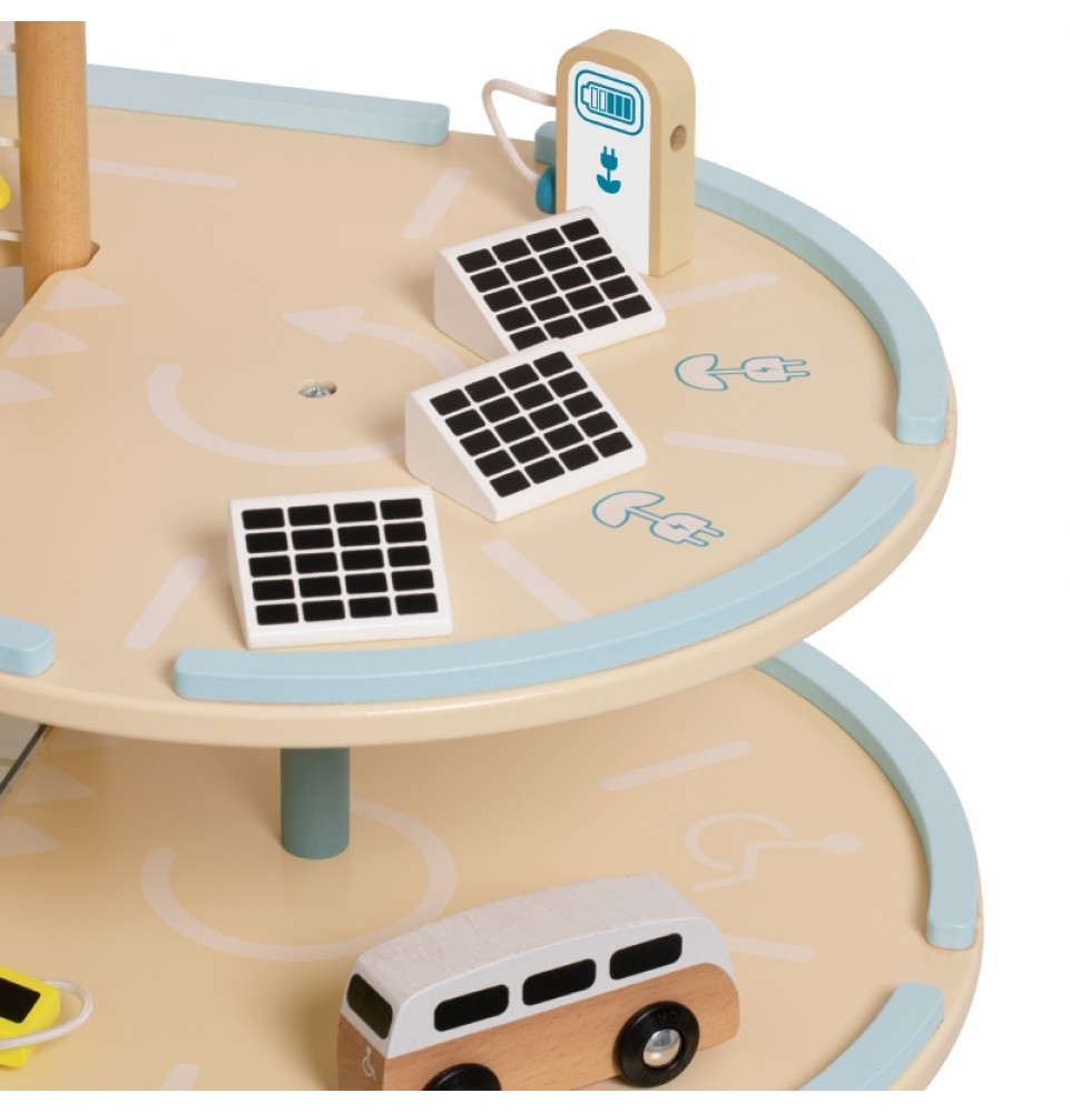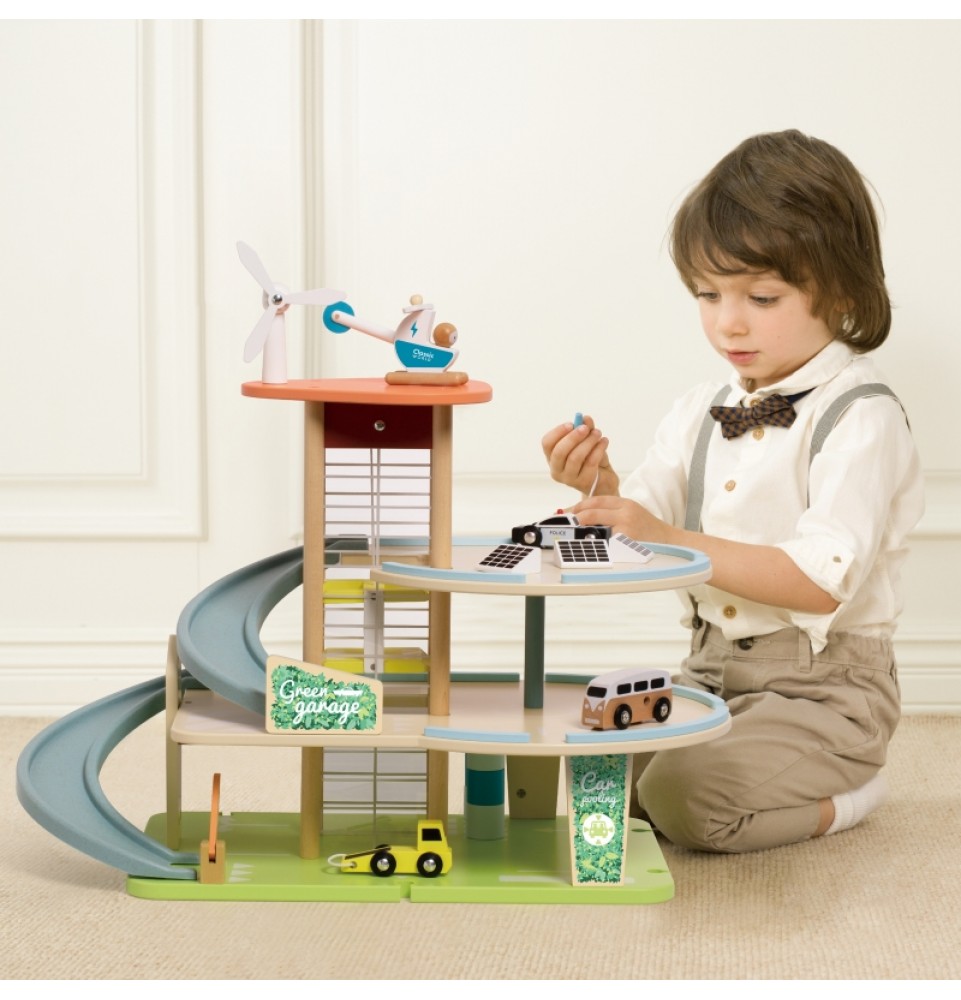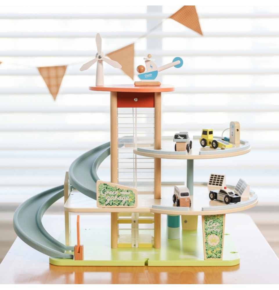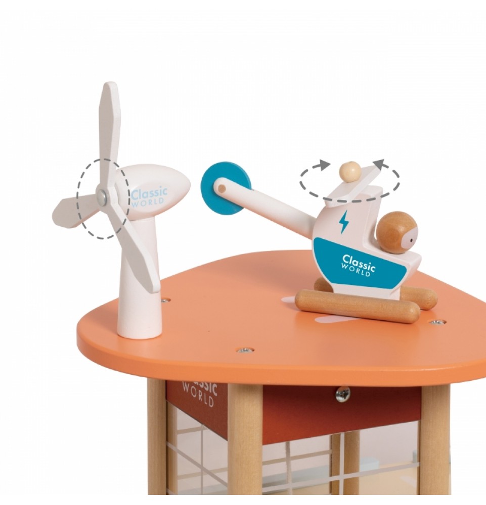 Šis medinis kelių aukštų „Classic World“ automobilių stovėjimo garažas su elektromobilių įkrovimo stotele, liftu, fotovoltinėmis plokštėmis, vėjo malūnu ir sraigtasparnio nusileidimo aikštele sužadins kiekvieno automobilio ir transporto entuziasto vaizduotę. Norint įvažiuoti į automobilių stovėjimo aikštelę arba išvažiuoti iš jos, reikia pakelti užtvarą. Rankiniu būdu valdomas liftas leidžia transporto priemonėms judėti tarp aukštų. Speciali vingiuota rampa leidžia greitai išvažiuoti tarp aukštų. Garaže taip pat įrengta elektromobilių įkrovimo stotelė. Rinkinį taip pat sudaro trys žaisliniai automobiliai ir sraigtasparnis.