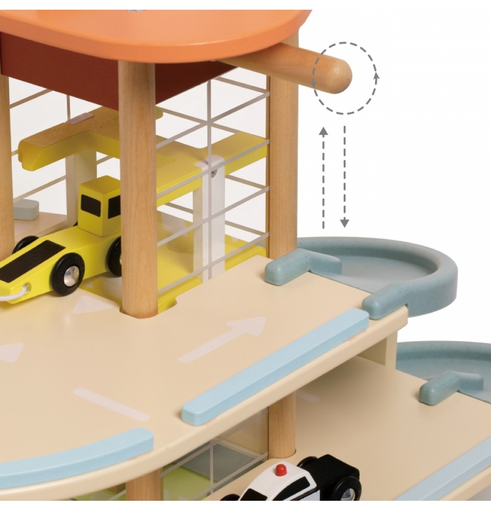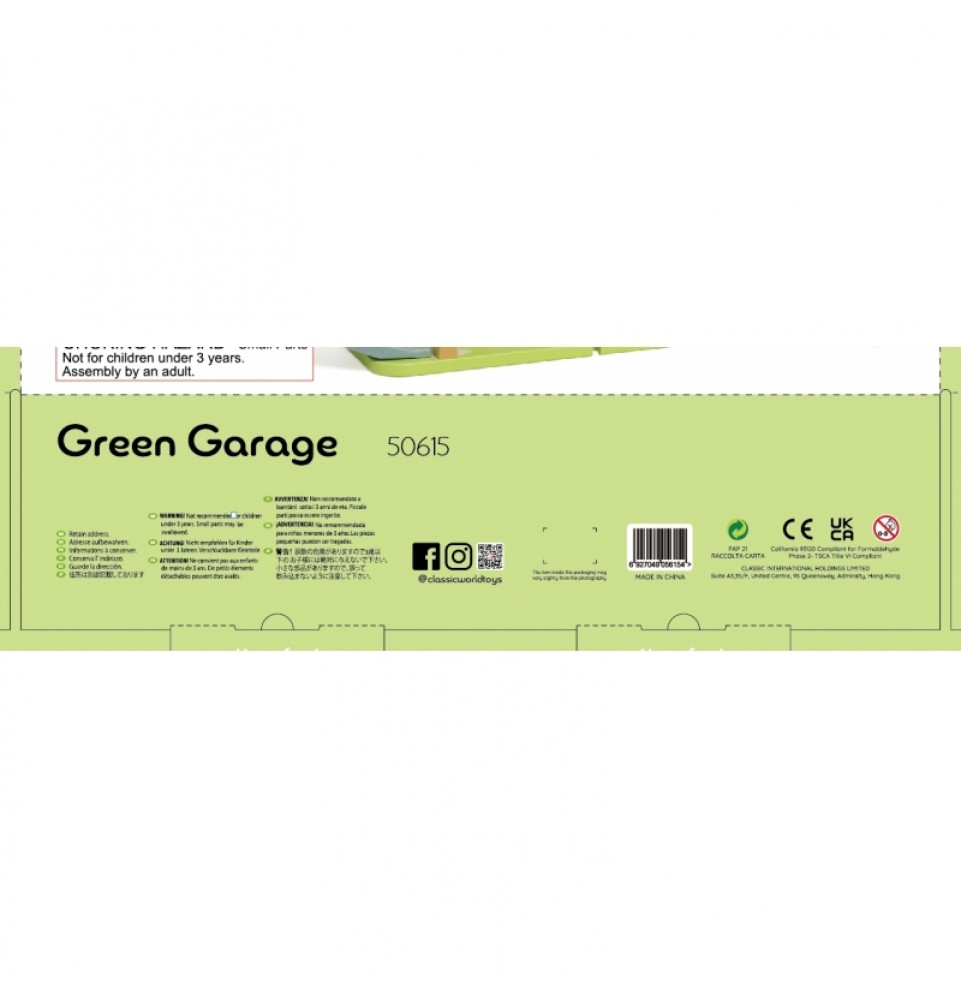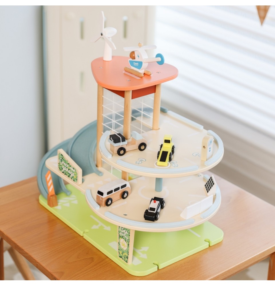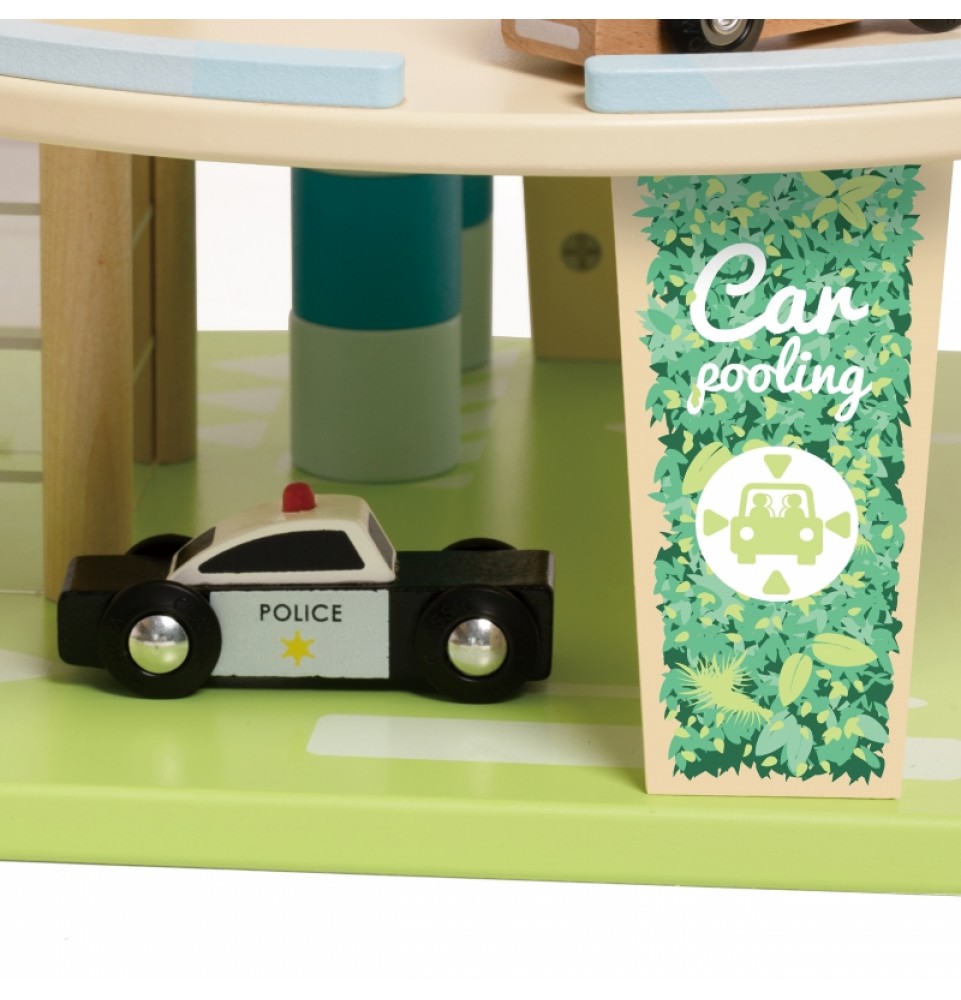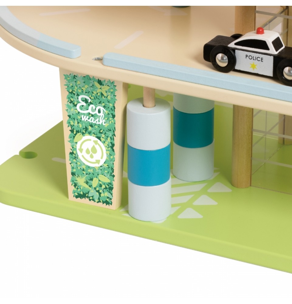 Šis medinis kelių aukštų „Classic World“ automobilių stovėjimo garažas su elektromobilių įkrovimo stotele, liftu, fotovoltinėmis plokštėmis, vėjo malūnu ir sraigtasparnio nusileidimo aikštele sužadins kiekvieno automobilio ir transporto entuziasto vaizduotę. Norint įvažiuoti į automobilių stovėjimo aikštelę arba išvažiuoti iš jos, reikia pakelti užtvarą. Rankiniu būdu valdomas liftas leidžia transporto priemonėms judėti tarp aukštų. Speciali vingiuota rampa leidžia greitai išvažiuoti tarp aukštų. Garaže taip pat įrengta elektromobilių įkrovimo stotelė. Rinkinį taip pat sudaro trys žaisliniai automobiliai ir sraigtasparnis.