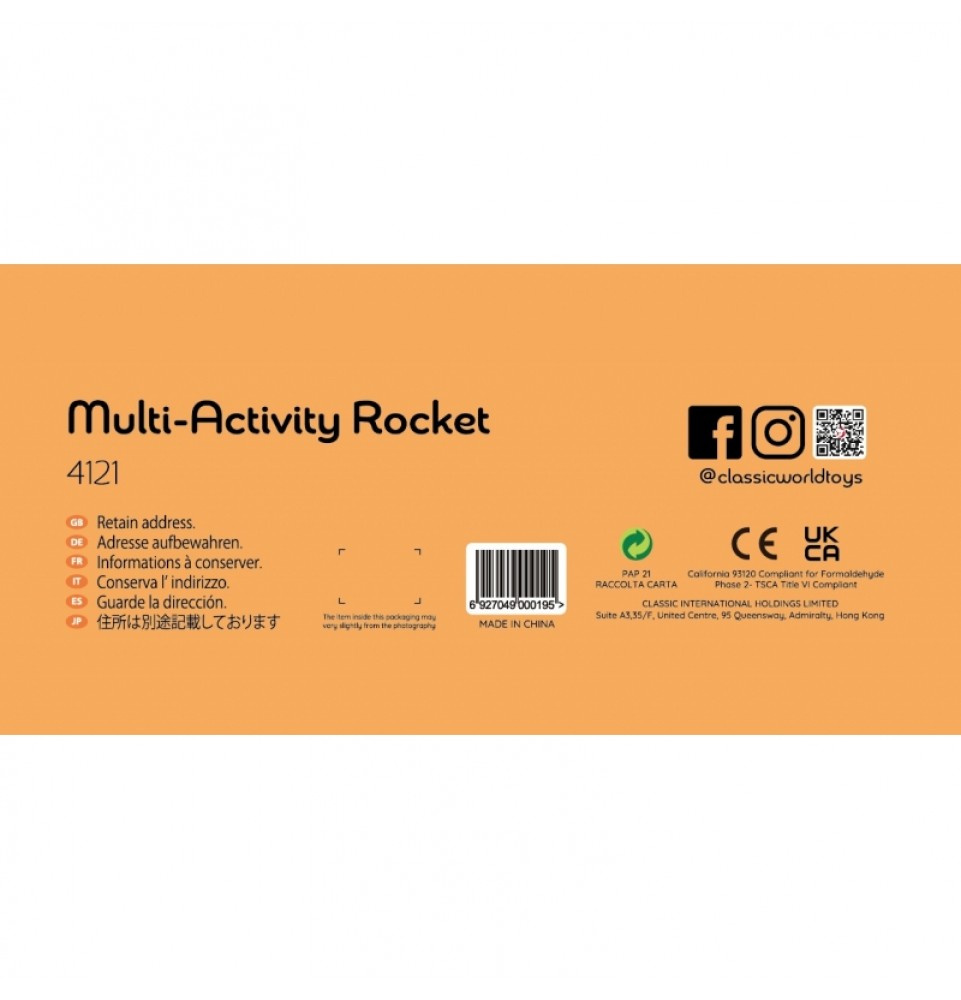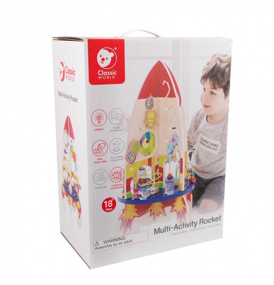 Ši nuostabi, spalvinga, didelė „Classic World“ raketa yra puikus žaislas bet kuriam smalsiam mažyliui. Šis žaislas derina pramogas ir mokymąsi . Kiekviena pusė siūlo skirtingą veiklą, kad būtų užtikrintas ilgalaikis susidomėjimas ir vystymasis. Sukurta galvojant apie mažas rankeles , dėl aštrių briaunų trūkumo ji yra visiškai saugi vaikams. Ši raketa neliks abejinga nė vienam mažyliui. Žaidimas su šia raketa praplės ribas. Pramogos garantuotos!