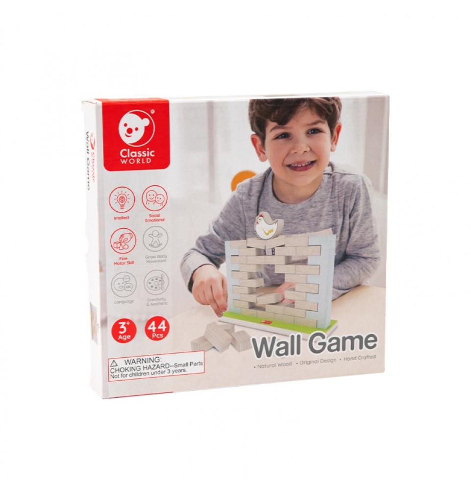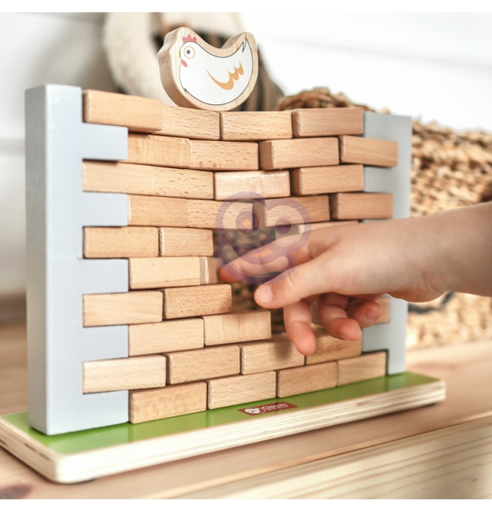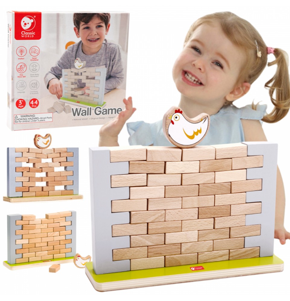 Puikus medinis žaidimas visai šeimai iš garsaus „Classic World“ prekės ženklo. Paprastos taisyklės, loginis mąstymas ir pramogos visoms amžiaus grupėms – tai pagrindiniai šio žaidimo bruožai. Pastatykite sieną iš specialiai paruoštų kaladėlių. Uždėkite ant viršaus vištą , tada po vieną traukite kaladėles iš sienos. Kai siena sugriūva, žaidimas baigiasi. Žaisdami vaikai mokysis susikaupimo , strategijos ir problemų sprendimo , lavins rankų ir akių koordinaciją .