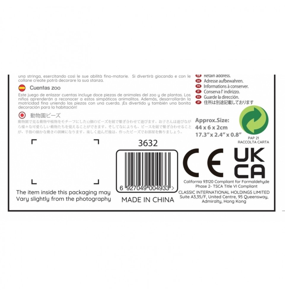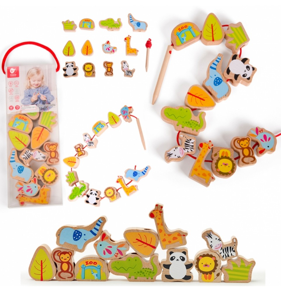 „Classic World Zoo“ mediniai karoliukai vėrimui yra puikus žaislas vaikams, kuris padės jiems lavinti miklumą, tikslumą ir akių bei rankų koordinaciją, taip pat leis jiems sužinoti apie skirtingas zoologijos sode gyvenančias gyvūnų rūšis. Mediniai karoliukai vėrimui pasižymi formomis ir motyvais, susijusiais su zoologijos sodo gyvūnais. Vaikams užduotis – vėrti įvairių formų karoliukus ant virvelės. Žaislą sudaro 12 kaladėlių, vaizduojančių pandą, liūtą, žirafą, krokodilą ir kitus zoologijos sodo elementus. Žaislas taip pat lavina kantrybę ir ryžtą, nes visų detalių suvėrimas tikrai užims vaikus valandų valandas.
