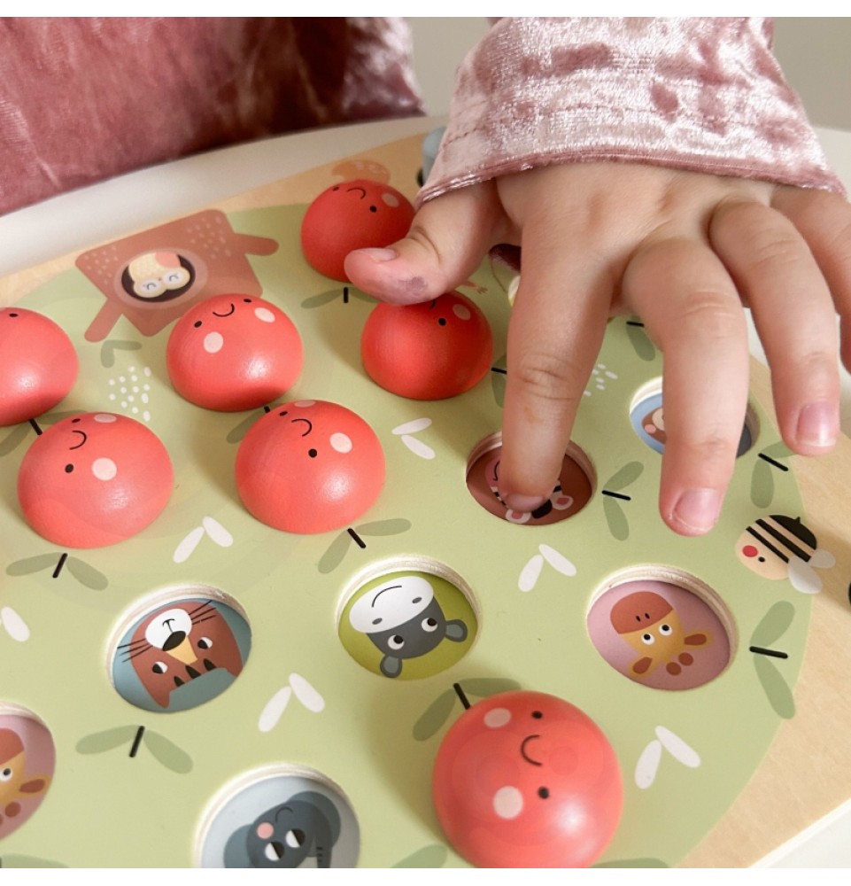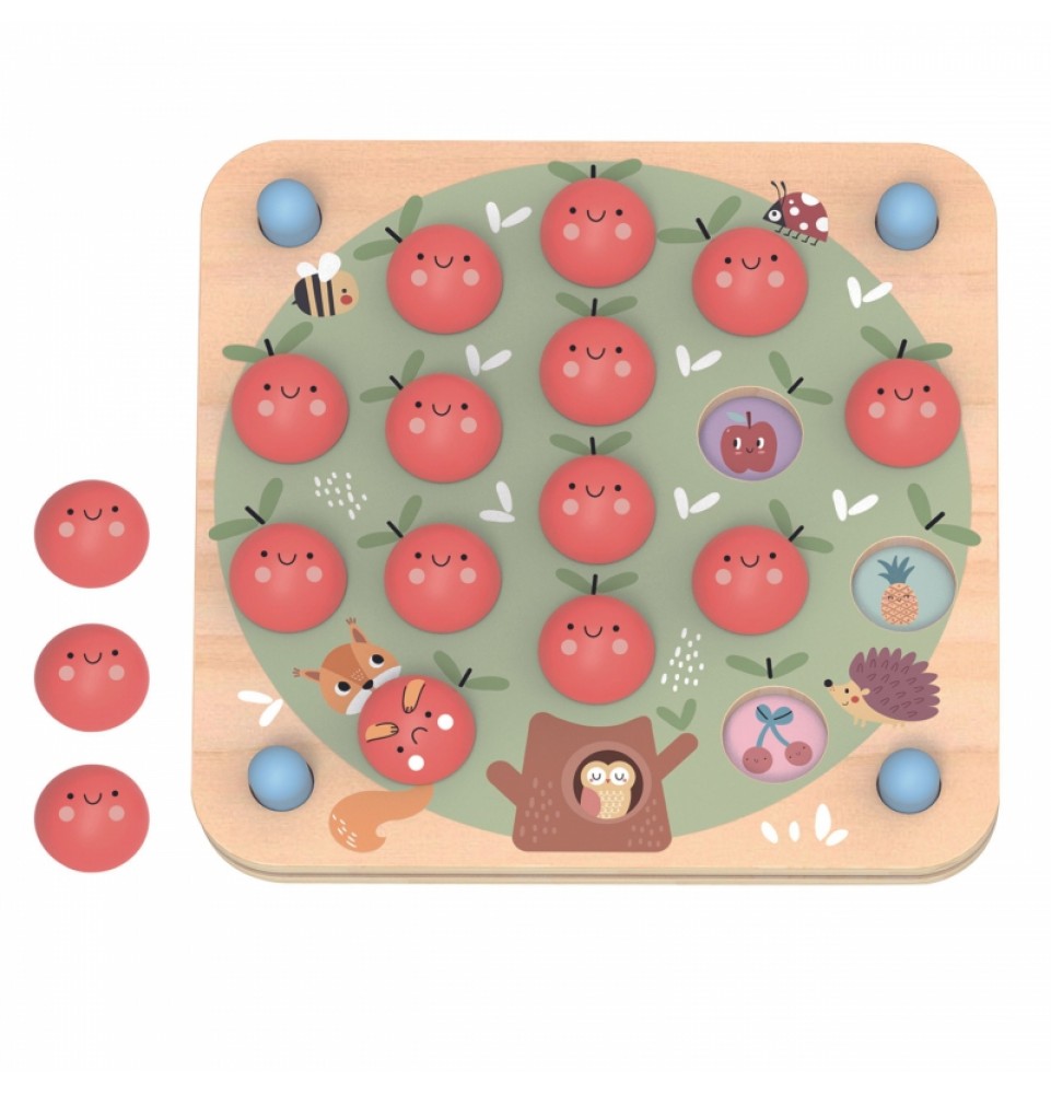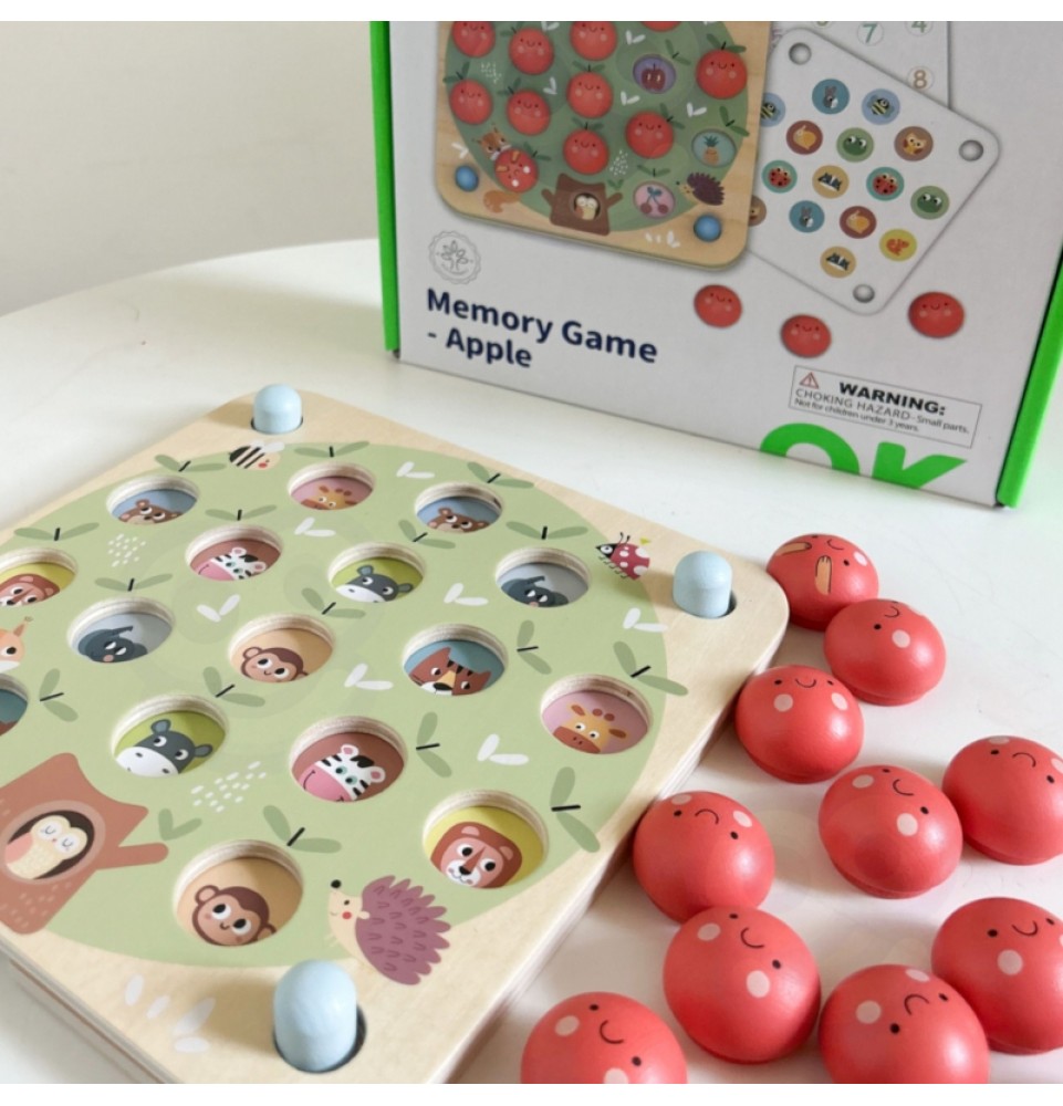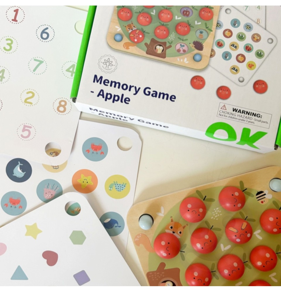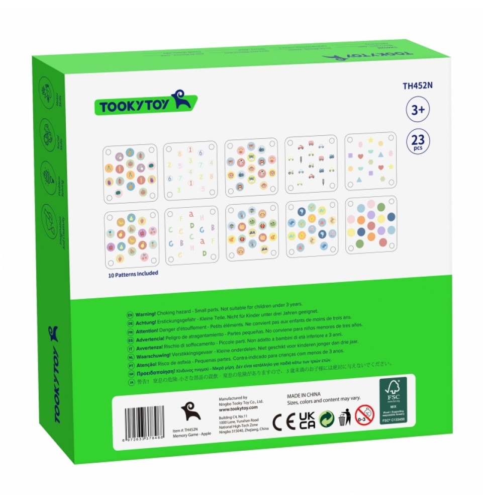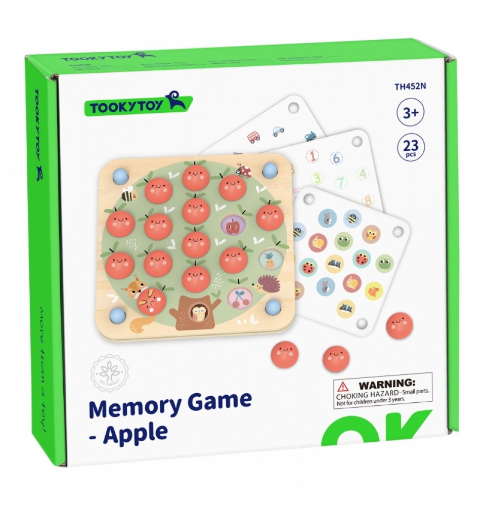 Šis atminties žaidimas yra smagi gerai žinomo žaislų gamintojo „Tooky Toy“ atminties žaidimo versija. Tai puikus būdas praleisti laiką kartu. Žaidimo metu vaikai lavina atmintį ir susikaupimo įgūdžius . Rinkinį sudaro 10 kortelių su įvairiomis temomis ir skirtingais sudėtingumo lygiais. Pagamintos iš aukščiausios kokybės medžiagų, saugios vaikams ir aplinkai. Paimkite obuolį, įsiminkite paveikslėlį po juo ir raskite kitą identišką! Laimi tas, kuris suranda daugiausiai porų. Smagiai praleiskite laiką!