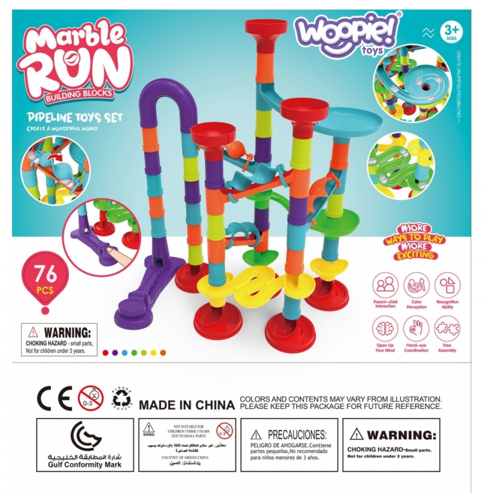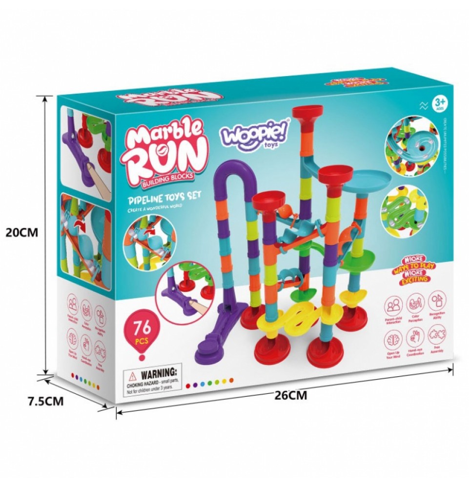 WOOPIE kamuoliukų takelis yra spiralinis takelis , teikiantis begalę pramogų. Šis spalvingas rinkinys susideda iš daugybės skirtingų spalvų detalių , kurias mažyliai gali lengvai sukrauti ir sujungti , kad sukurtų išradingus takelius. Be to, pakuotės gale yra instrukcijos, kuriose parodytas takelio pavyzdys, naudojant visas dalis. Paleiskite kamuoliukus ir stebėkite, kaip jie rieda vienas po kito. Rinkinį sudaro 76 detalės , įskaitant paleidimo įrenginį ir 20 kamuoliukų takeliui . Dydis puikiai tinka mažoms rankytėms ir padeda lavinti akių ir rankų koordinaciją .