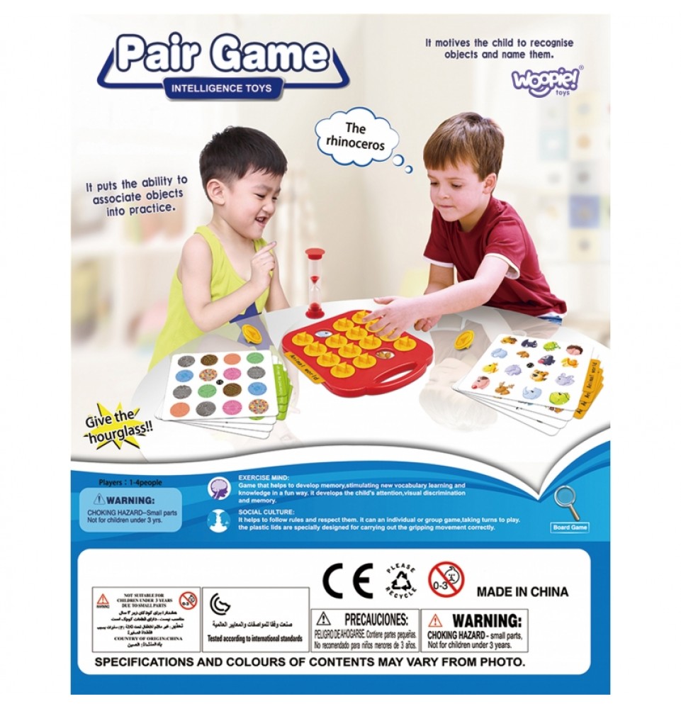 „WOOPIE“ žaidimas „Suderink savo poras“ yra puikus ir smagus, ir atmintį lavinantis žaidimas! Paprastos taisyklės : lentoje yra 16 duobučių, po kiekviena po dviem vienodais paveikslėliais. Kiekvienas žaidėjas turi jas atidengti per vieną ėjimą. Kiekviena pora verta taško – laimi žaidėjas, surinkęs daugiausiai porų! Kiekvieno ėjimo laikas žymimas smėlio laikrodžiu; kai baigiasi smėlis, ėjimas baigiasi. Žaidime yra 10 teminių kortų . Garantuoju valandų valandas pramogų!