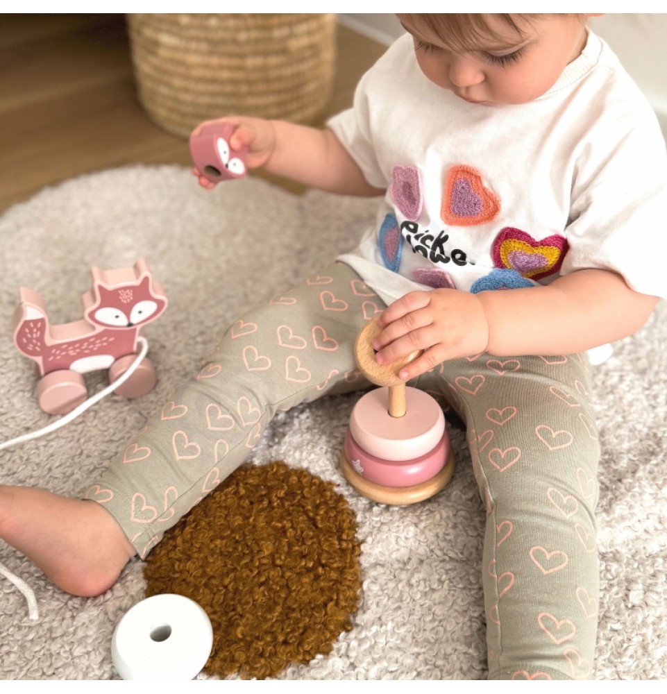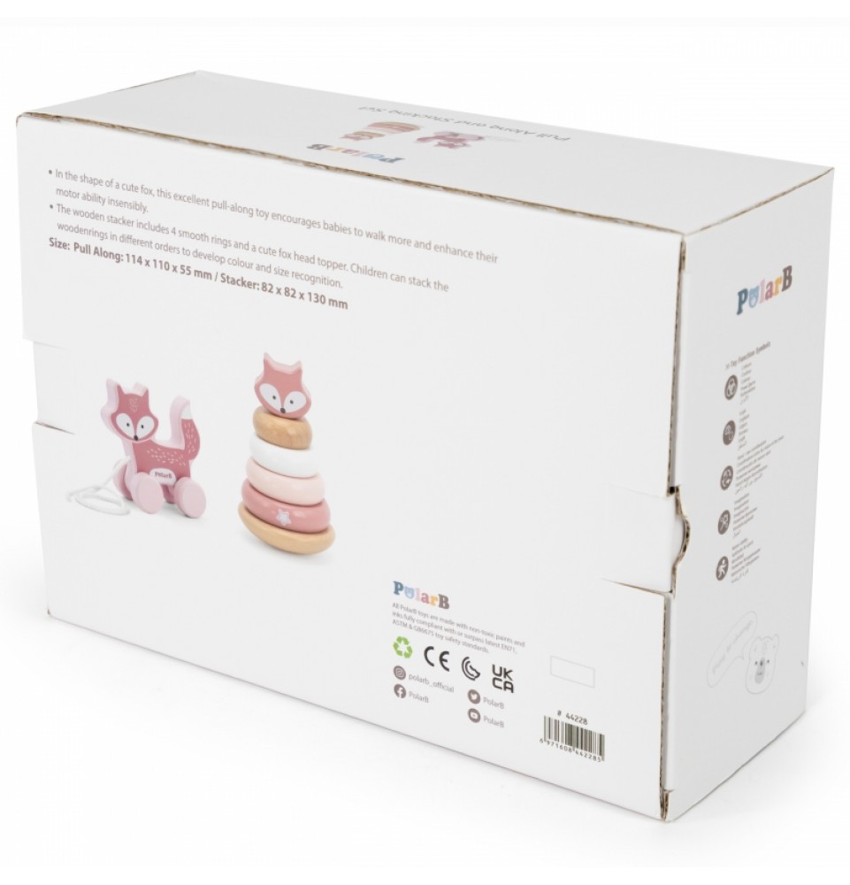 Šis „Viga“ prekės ženklo, priklausančio „PolarB“ kolekcijai, rinkinys apima du pastelinių spalvų medinius žaislus: lavinamąją piramidę „Fox“ ir tempiamą „Fox“ . Abu žaislai ne tik pralinksmins jūsų vaiką, bet ir padės lavinti smulkiąją motoriką , loginį mąstymą ir spalvų pojūtį.