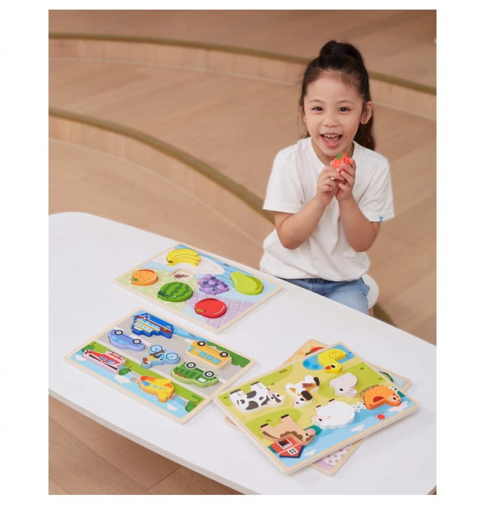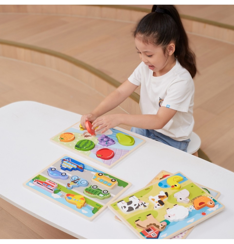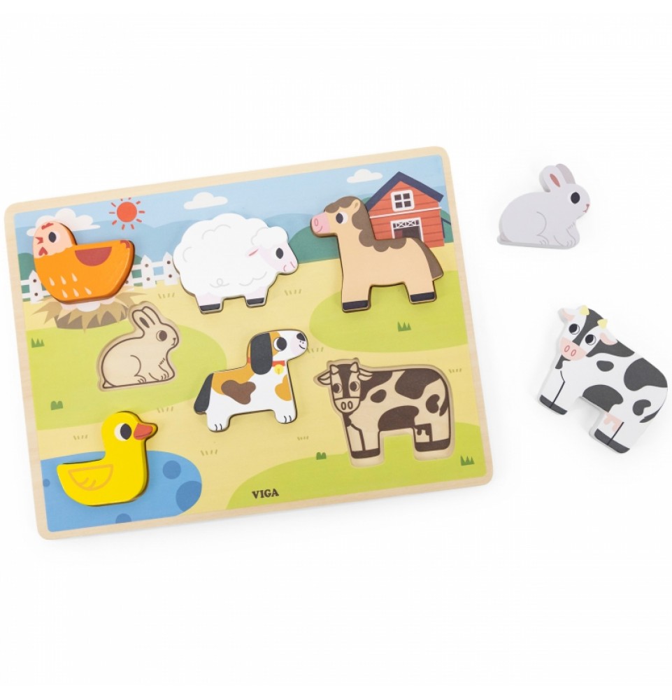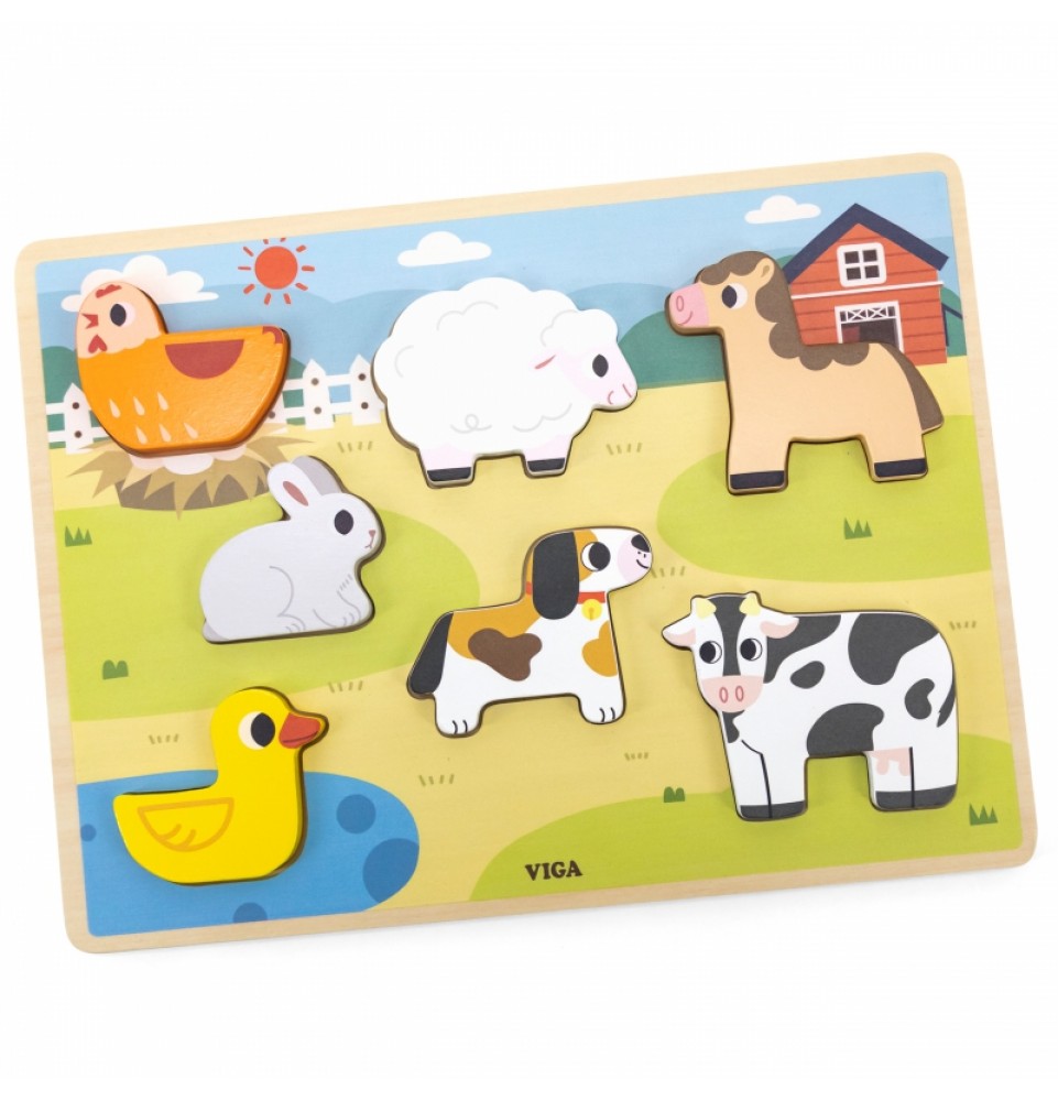 Medinė VIGA dėlionė ūkio tema. Rinkinį sudaro spalvinga lenta ir 7 detalės. Žaidimas susideda iš spalvingo pagrindo, ant kurio yra trūkstamų detalių piešiniai. Šis užsiėmimas padės lavinti tikslius rankų judesius , gerins akių ir rankų koordinaciją , taip pat lavins atmintį , loginį mąstymą ir susikaupimą . Dėl detalių storio dėlionę galima naudoti kaip figūrėles kituose žaidimuose.