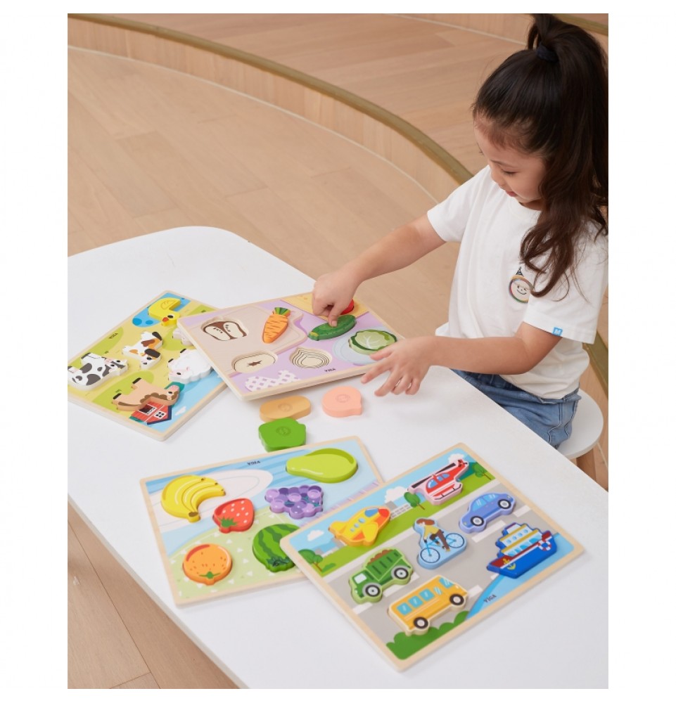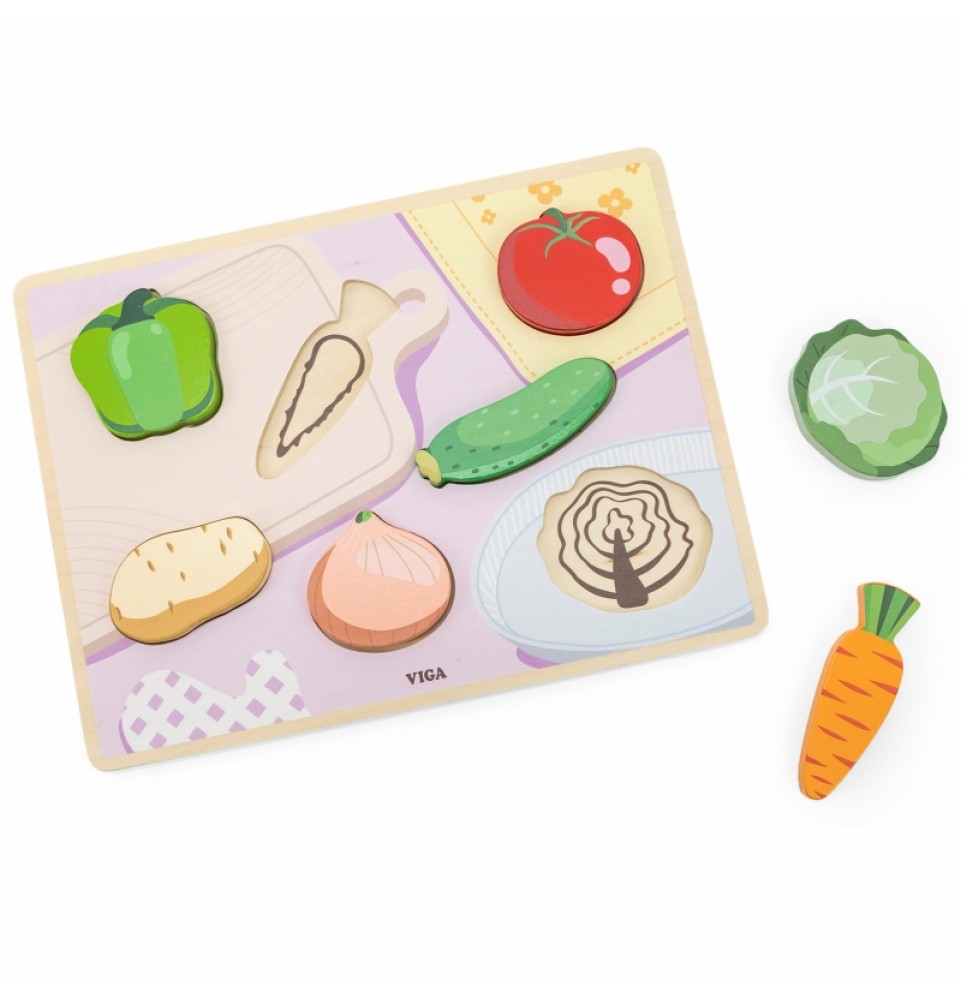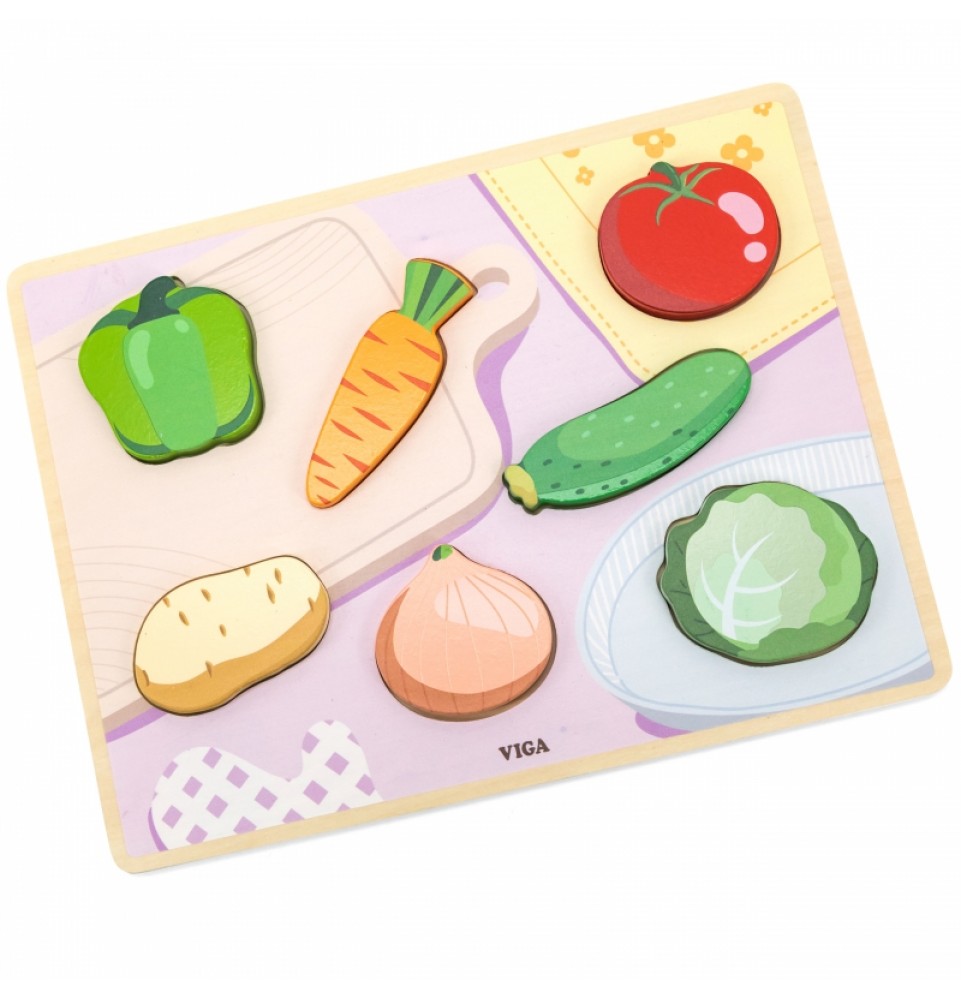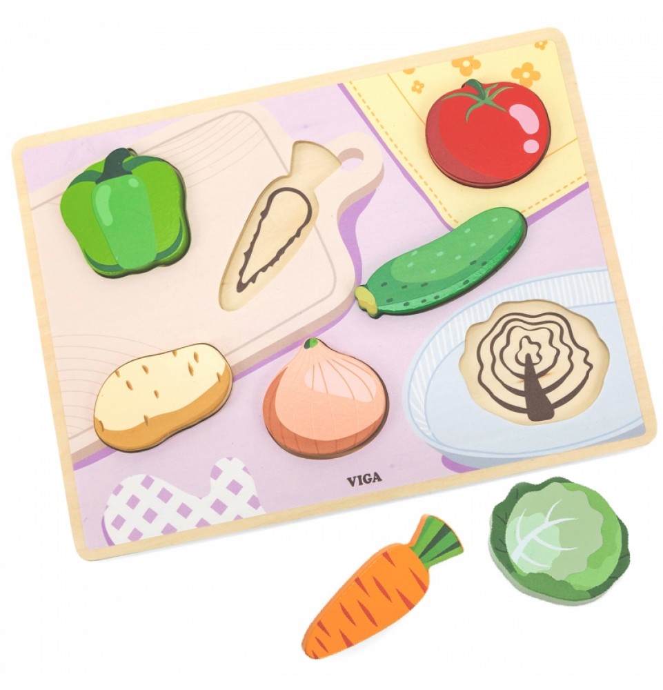 Medinė VIGA dėlionė su daržovių motyvu. Rinkinį sudaro spalvinga lenta ir 7 detalės. Žaidimas apima daržovių plytelių priderinimą prie atitinkamų vietų spalvingame pagrindui, ant kurio yra trūkstamų detalių piešiniai, kad būtų lengva jas rasti. Šis užsiėmimas padės lavinti tikslius rankų judesius , gerins akių ir rankų koordinaciją , taip pat lavins atmintį , loginį mąstymą ir susikaupimą . Dėl detalių storio dėlionę galima naudoti kaip figūrėles kituose žaidimuose.
