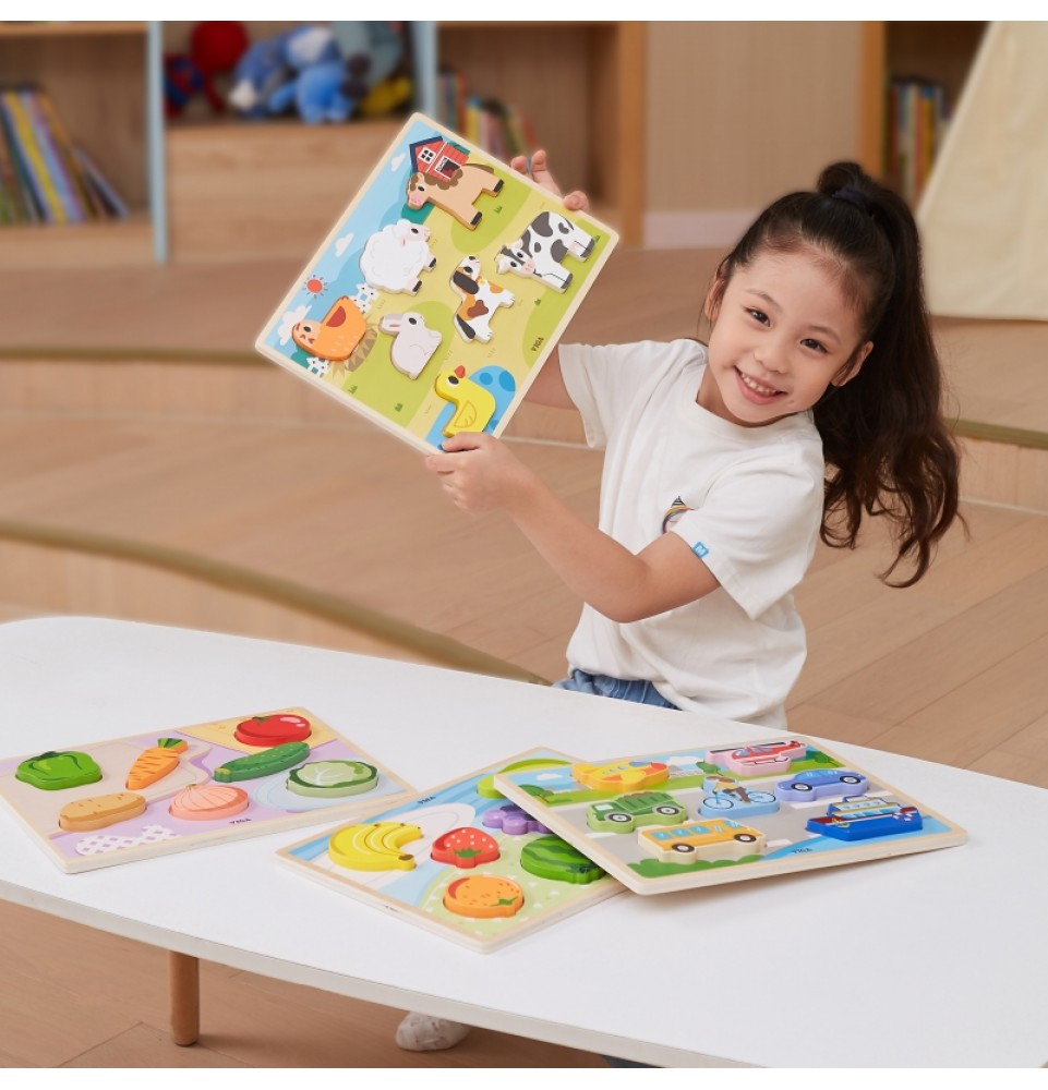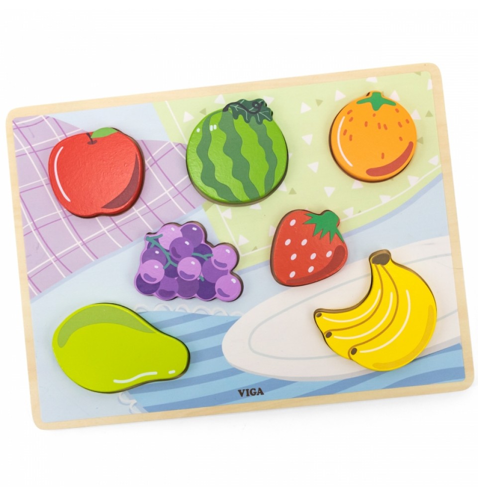 Medinė VIGA dėlionė su vaisių motyvu. Rinkinį sudaro spalvinga lenta ir 7 detalės. Žaidimas susideda iš spalvoto pagrindo, ant kurio yra trūkstamų detalių piešiniai. Šis užsiėmimas padės lavinti tikslius rankų judesius , gerins akių ir rankų koordinaciją , taip pat lavins atmintį , loginį mąstymą ir susikaupimą . Dėl detalių storio dėlionę galima naudoti kaip figūrėles kituose žaidimuose.