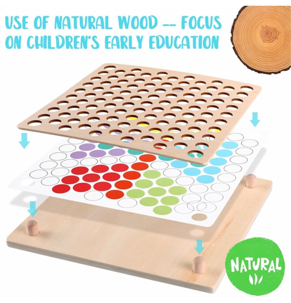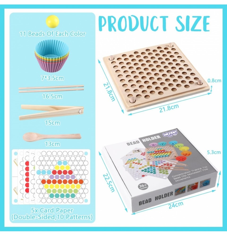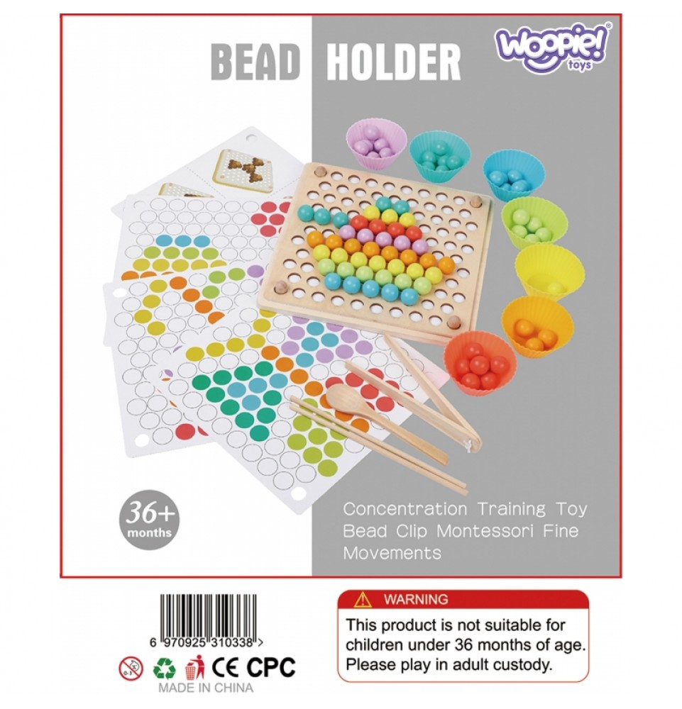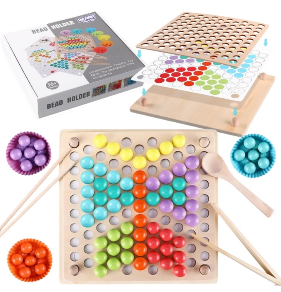 Spalvingi „ Woopie “ kamuoliukai – tai žaislas, kuris suteiks valandų valandas pramogų. Medinį rinkinį sudaro lenta ir šablonai su piešiniais, ant kurių vaikai gali priderinti kamuoliukus prie piešinio arba kurti savo raštus. Spalvingos formelės, atitinkančios kamuoliukų spalvas, palengvina rūšiavimą. Vaikai gali semti kamuoliukus šaukštu, žnyplėmis ar lazdelėmis , lavindami susikaupimą ir akių bei rankų koordinaciją. Raštų įvairovė ir galimybė kurti savo dizainus garantuoja valandų valandas pramogų ir žaidimo be nuobodulio.