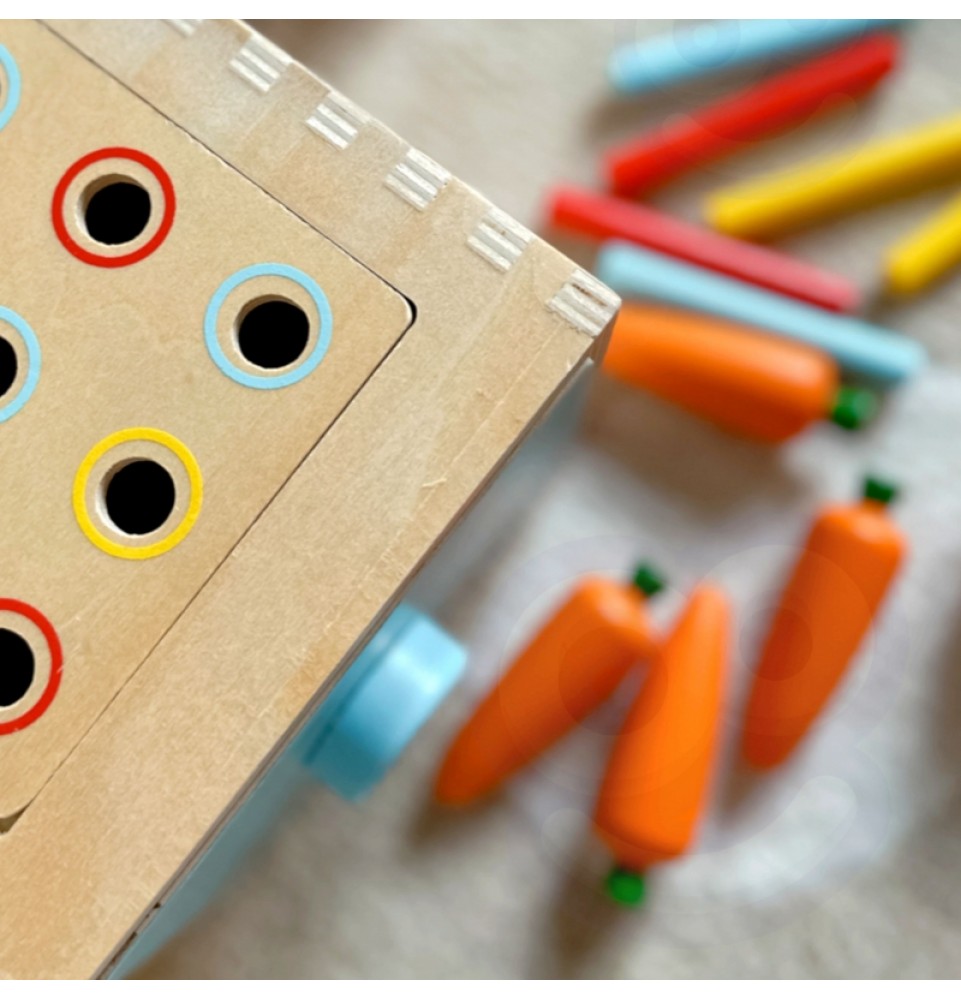 WOOPIE GREEN medinis edukacinis stalčius 4 viename Montessori morkų rūšiavimo žaidimas FSC