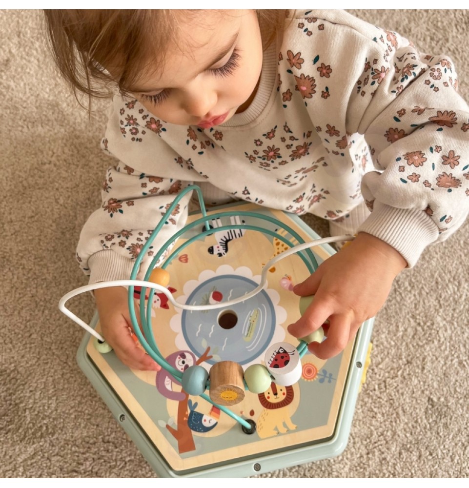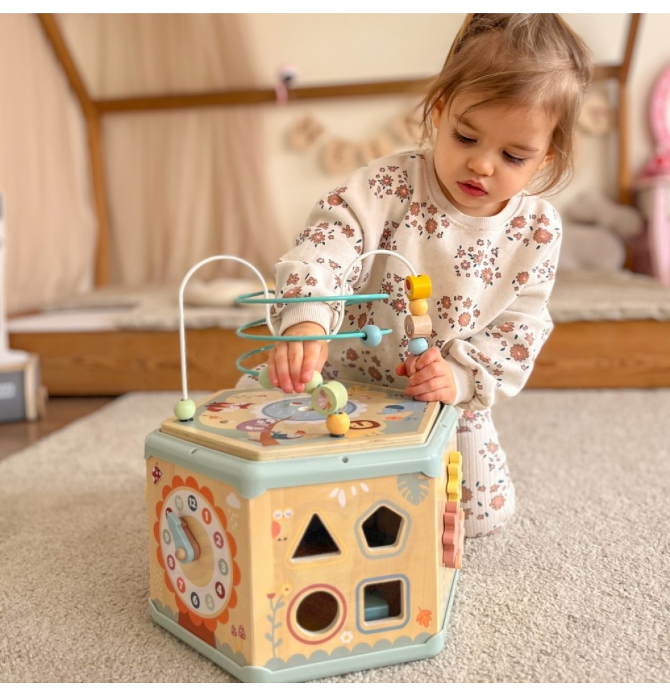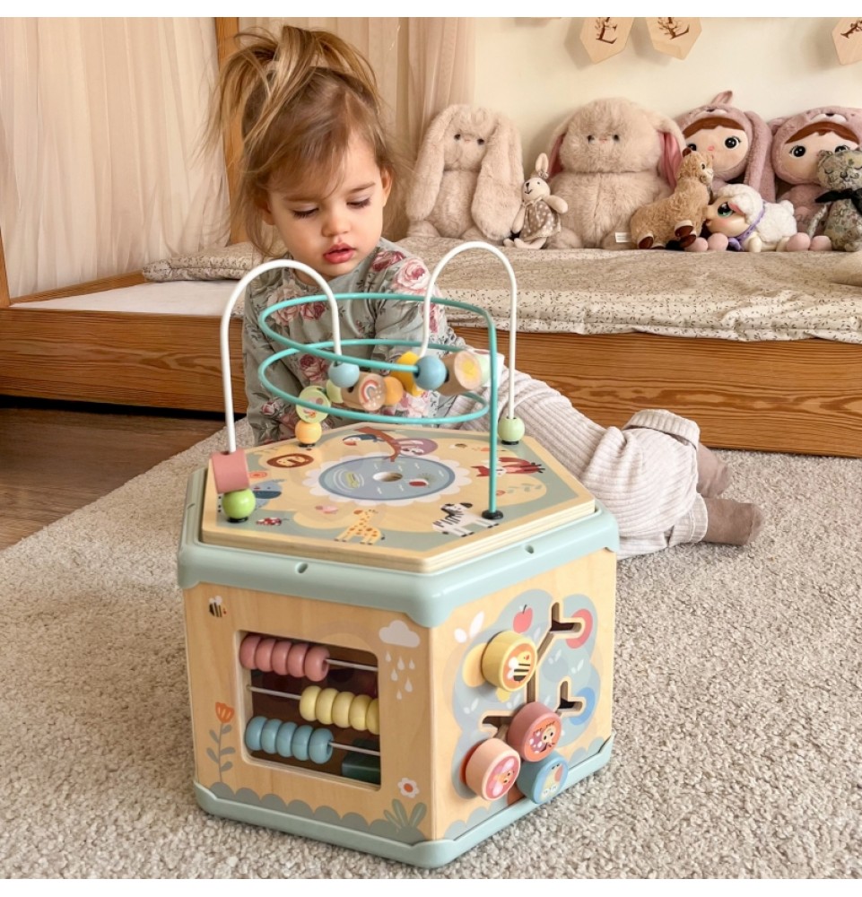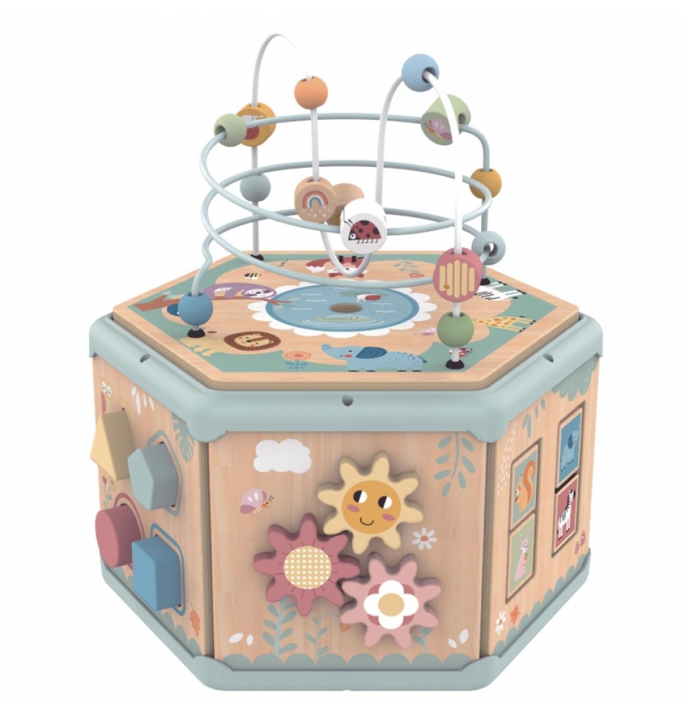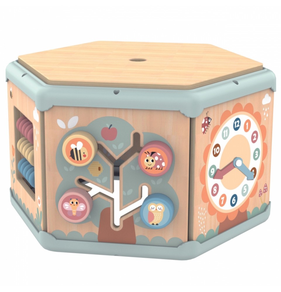 Šis medinis daugiafunkcis šešiakampis su 7 veiklomis iš TOOKY TOY yra interaktyvus lavinamasis žaislas, siūlantis daugybę žaidimo variantų kiekvienoje iš septynių jo pusių. Vaikai gali judinti karoliukus labirintuose, sukinėti krumpliaračius, derinti formas arba mokytis apie laikrodžių mechanizmą. Kruopštus žaislo meistriškumas skatina vaikus žaisti. Be to, viršus atsidaro, kad būtų galima laikyti mažylių žaislus.