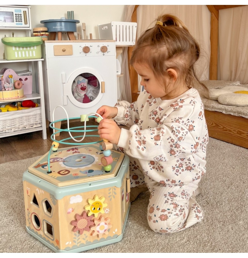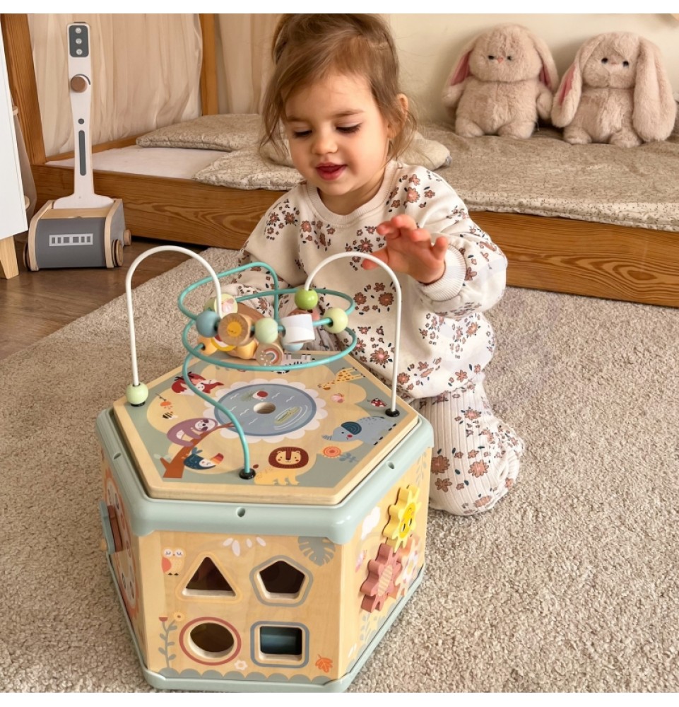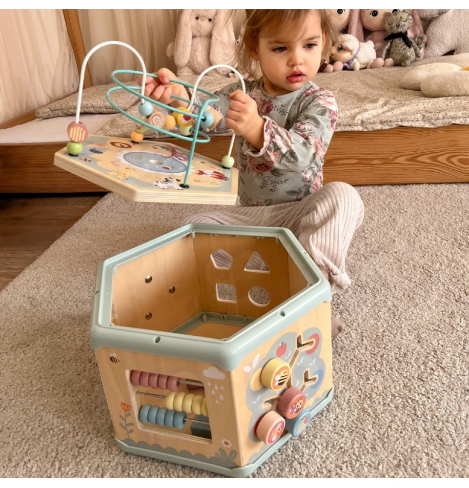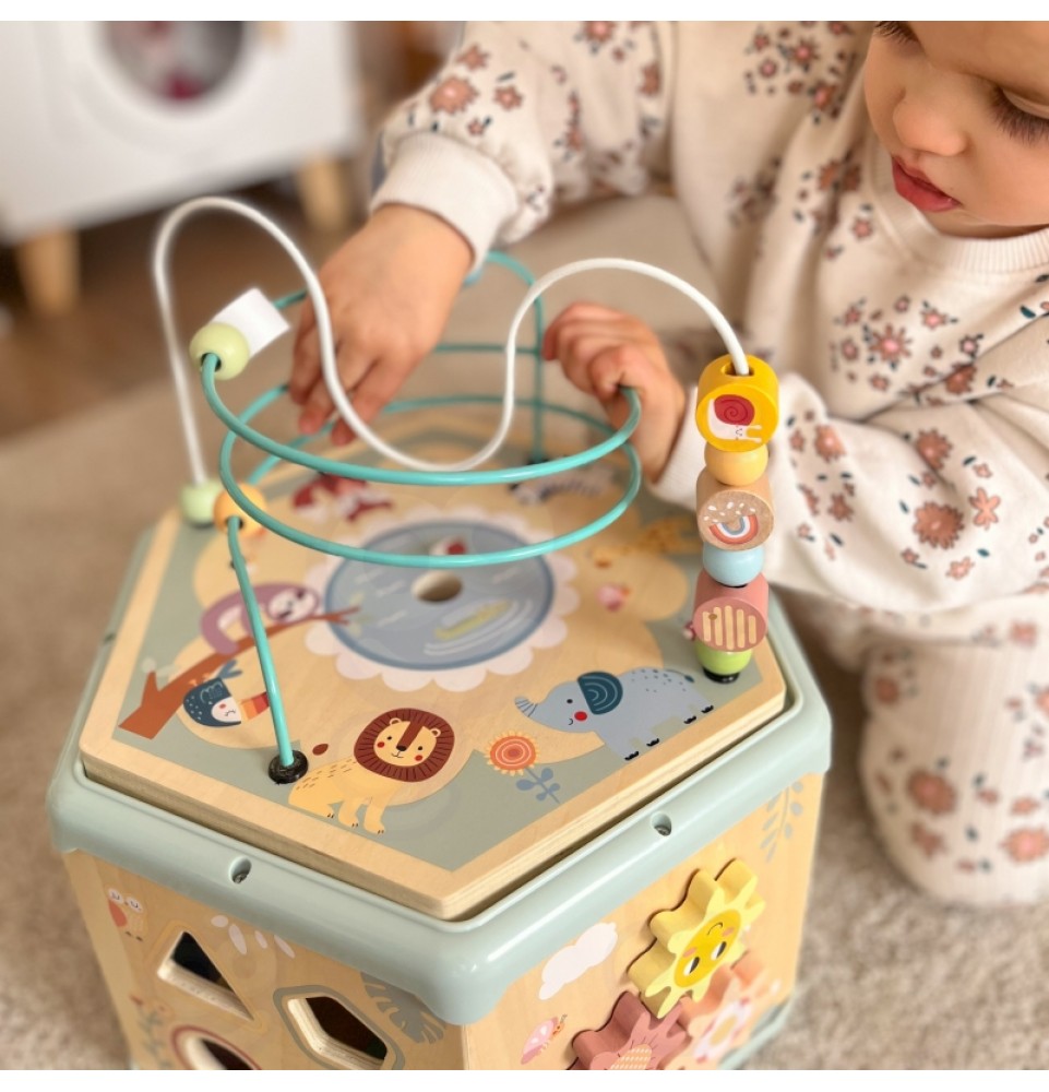 Šis medinis daugiafunkcis šešiakampis su 7 veiklomis iš TOOKY TOY yra interaktyvus lavinamasis žaislas, siūlantis daugybę žaidimo variantų kiekvienoje iš septynių jo pusių. Vaikai gali judinti karoliukus labirintuose, sukinėti krumpliaračius, derinti formas arba mokytis apie laikrodžių mechanizmą. Kruopštus žaislo meistriškumas skatina vaikus žaisti. Be to, viršus atsidaro, kad būtų galima laikyti mažylių žaislus.