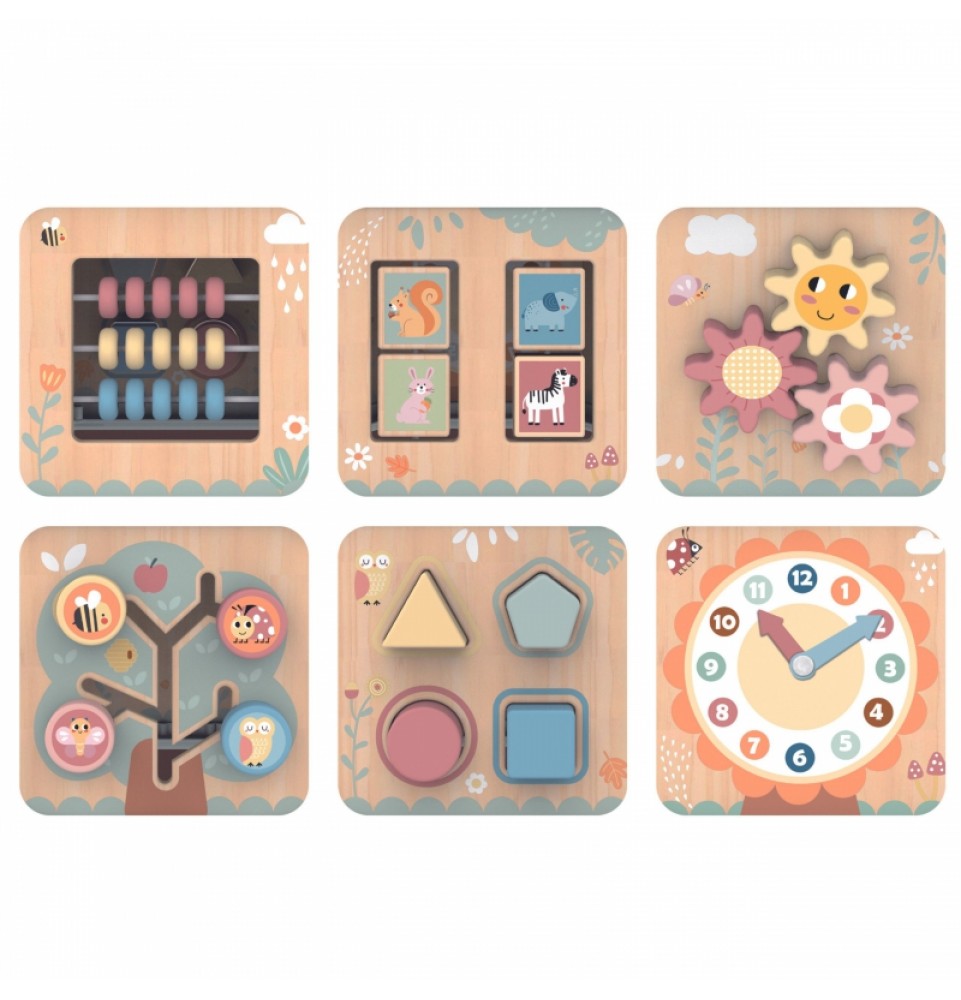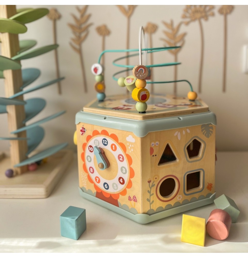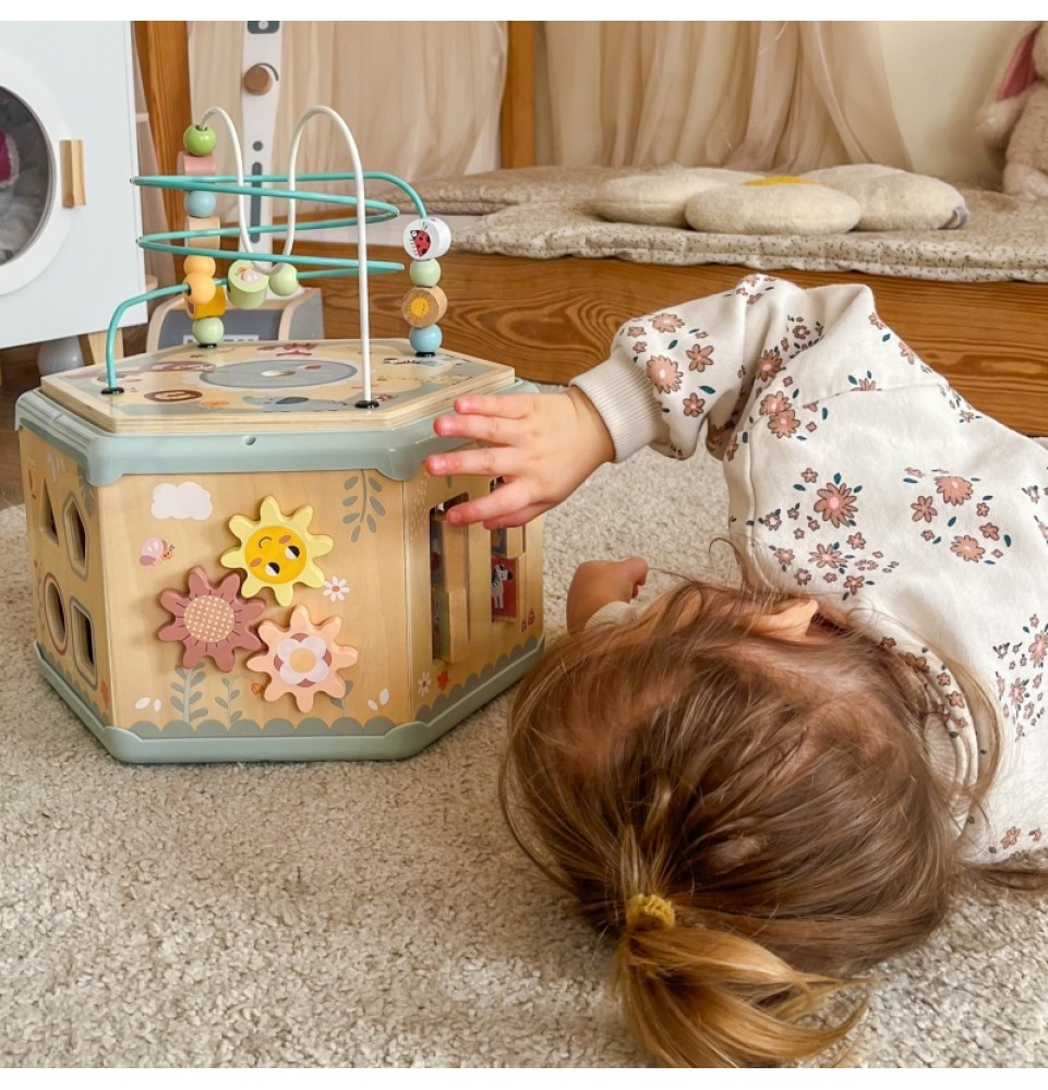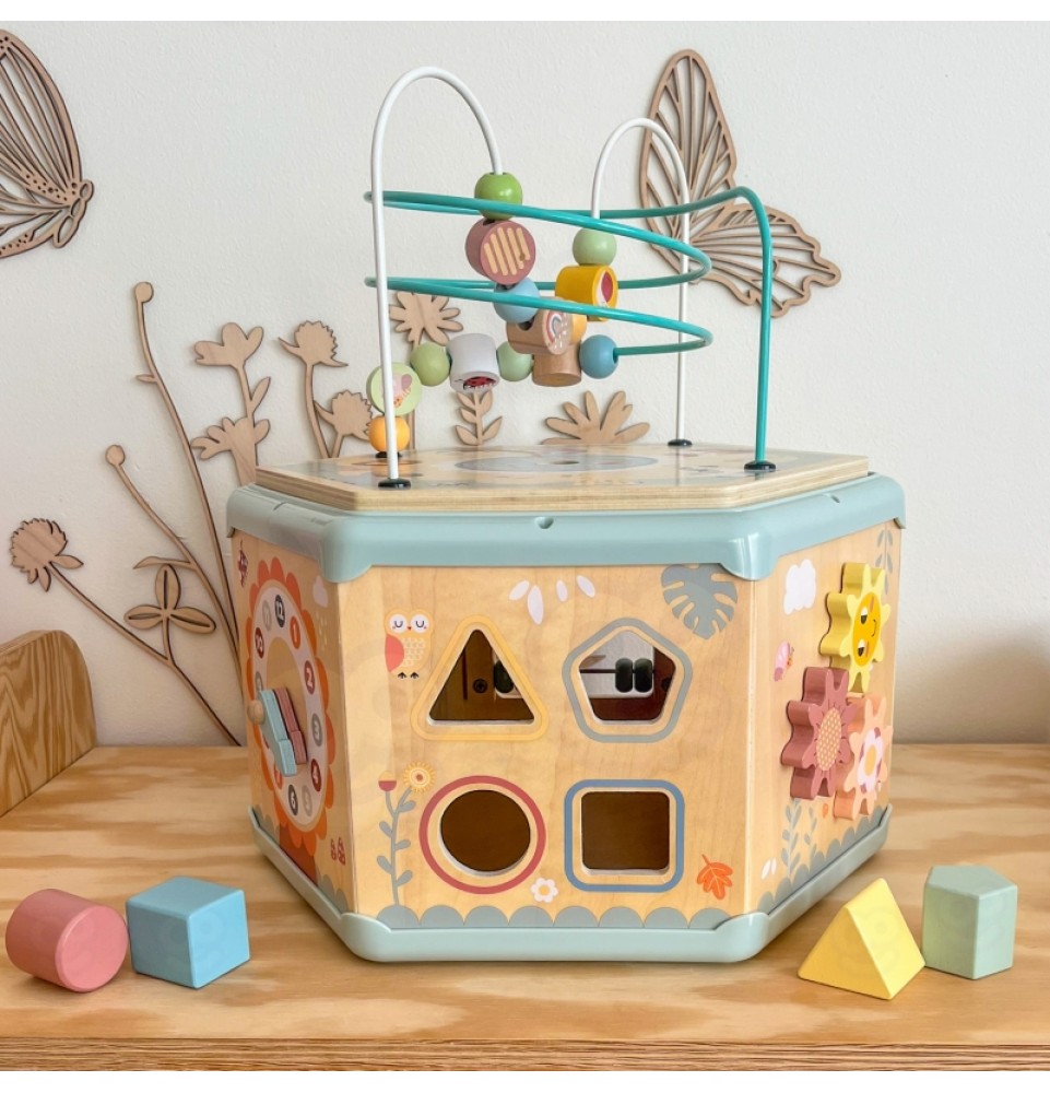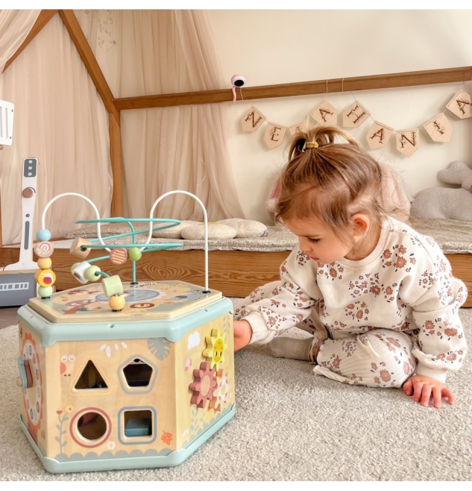 Šis medinis daugiafunkcis šešiakampis su 7 veiklomis iš TOOKY TOY yra interaktyvus lavinamasis žaislas, siūlantis daugybę žaidimo variantų kiekvienoje iš septynių jo pusių. Vaikai gali judinti karoliukus labirintuose, sukinėti krumpliaračius, derinti formas arba mokytis apie laikrodžių mechanizmą. Kruopštus žaislo meistriškumas skatina vaikus žaisti. Be to, viršus atsidaro, kad būtų galima laikyti mažylių žaislus.