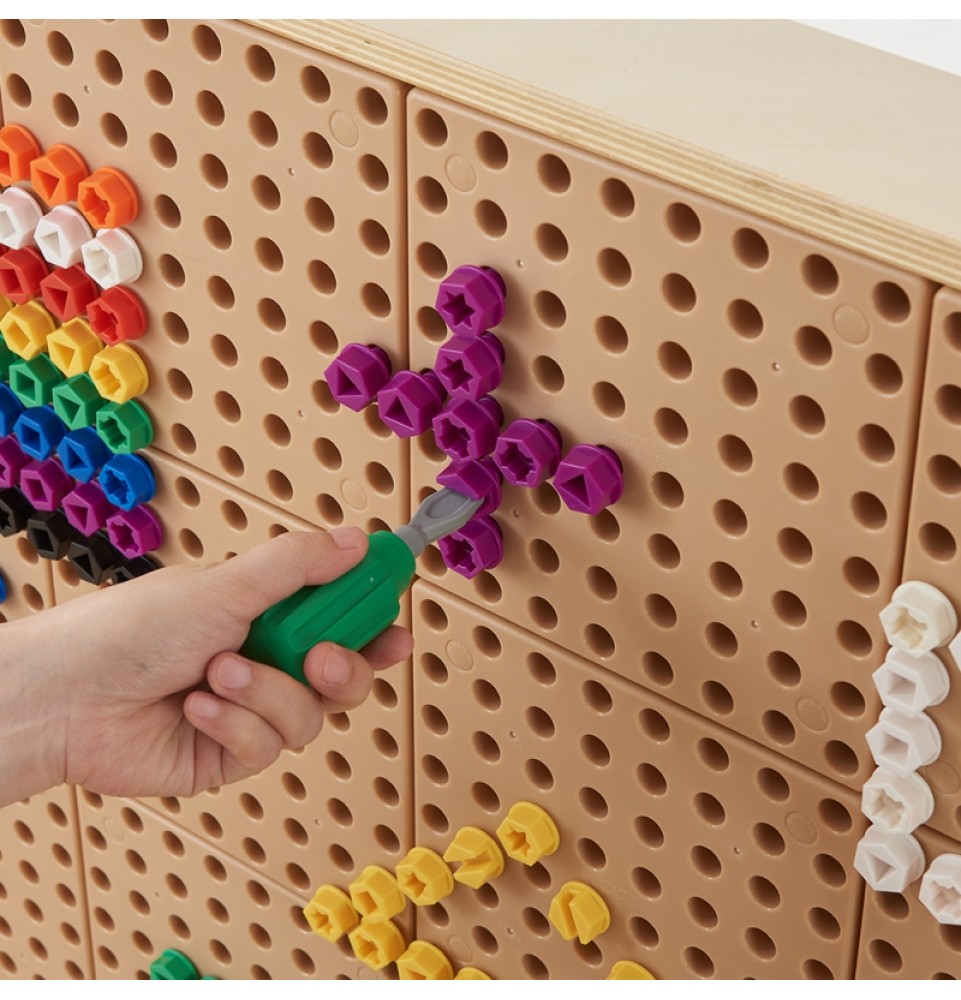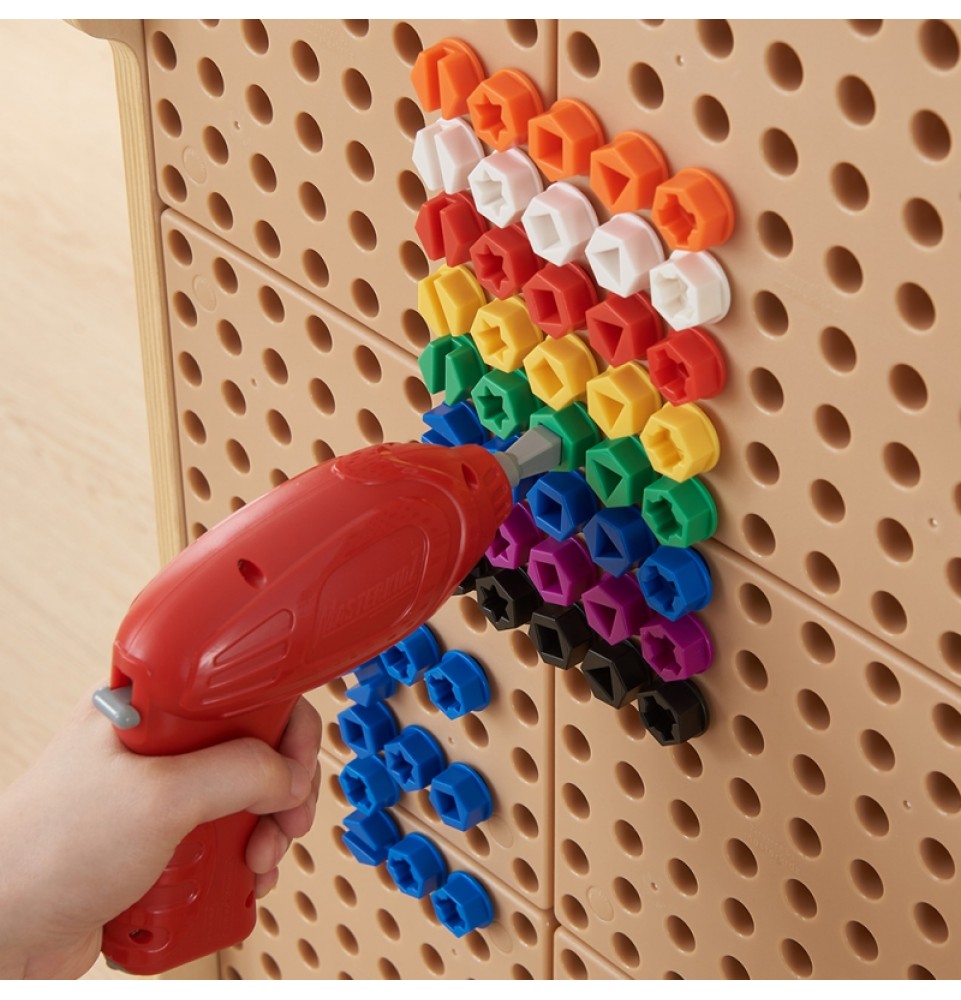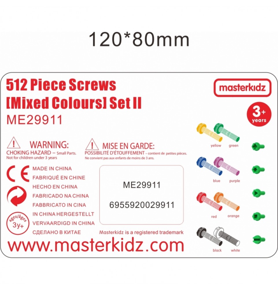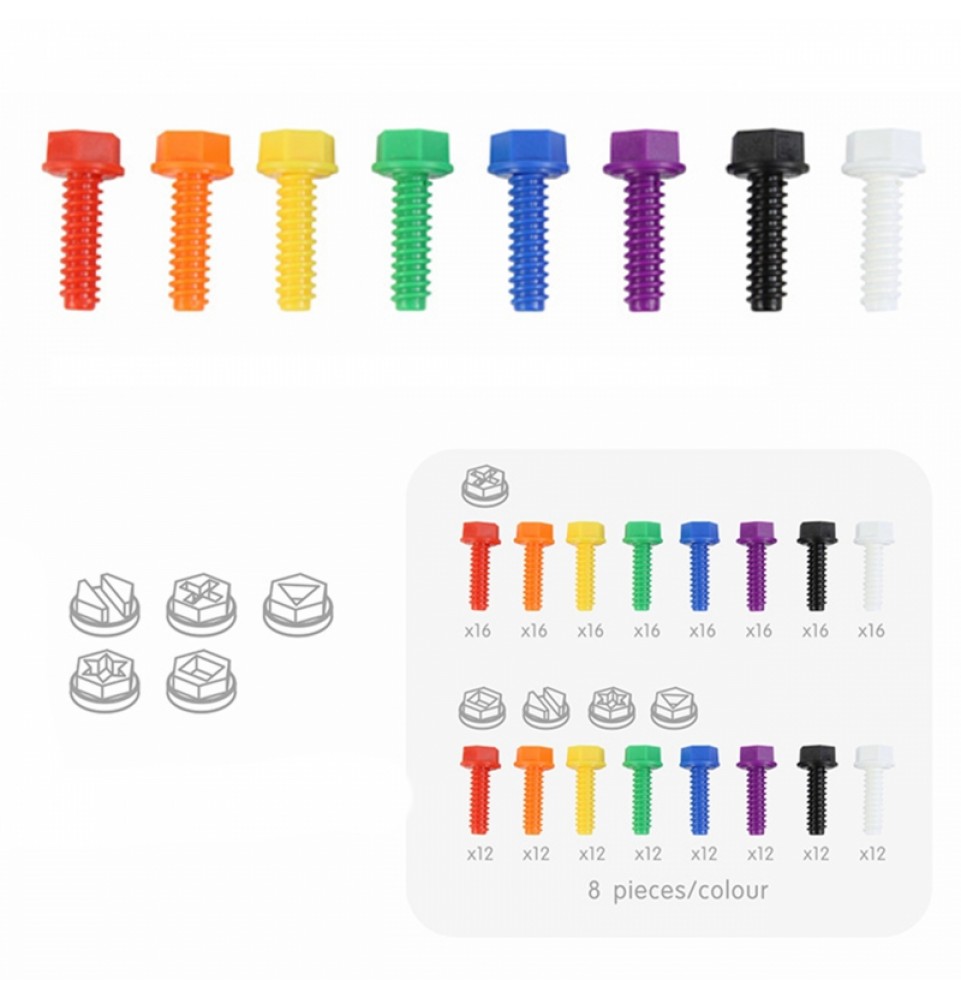 Spalvingi varžteliai, skirti įsukti į „Masterkidz STEM“ medinę edukacinę lentą, yra puikus priedas. Jūsų vaikas ne tik galės gražiai papuošti savo lentą ir kurti nuostabius piešinius, bet ir specialių įrankių (įsigyjamų atskirai) dėka išmoks naudotis rankiniais įrankiais bei elektriniu atsuktuvu. Šiame rinkinyje yra penkių tipų varžteliai aštuonių spalvų su skirtingomis įdubomis: 128 standartiniai „Phillips“ varžteliai ir dar keturių tipų varžteliai, kurių kiekvienas turi 96 įdubas: plokšti, trikampiai, žvaigždės formos ir kvadratiniai.