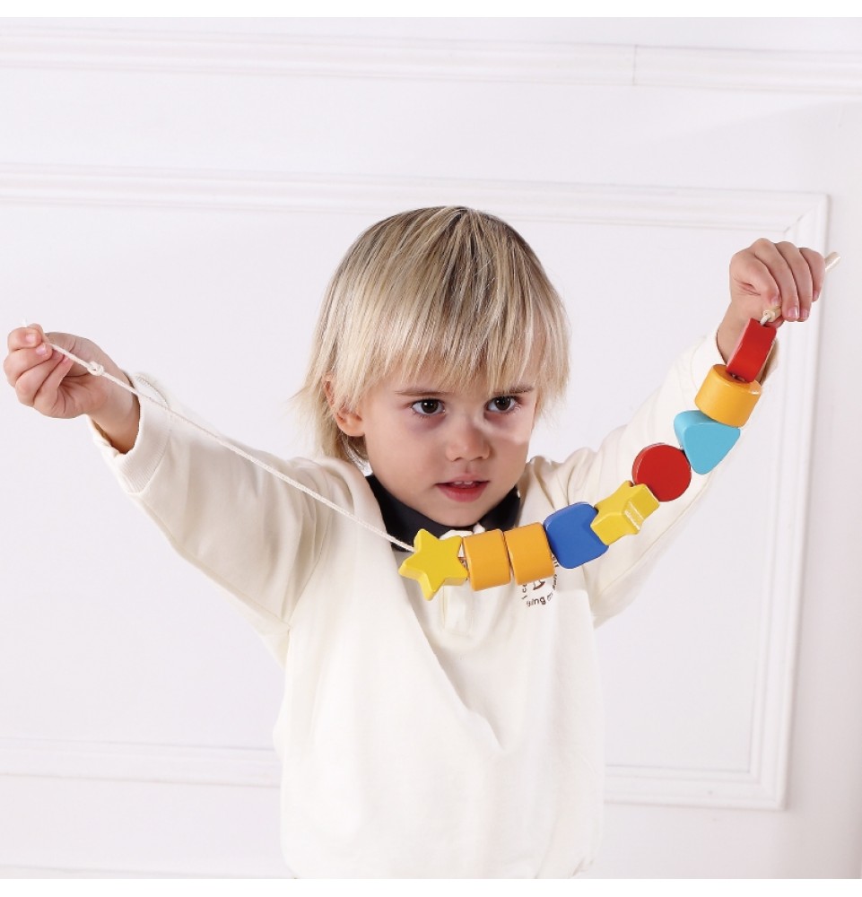 Rinkinį sudaro vienas laikymo krepšys, 11 įvairių formų kaladėlių ir vienas verimo siūlas. Verimo siūlas yra klasikinis medinių kaladėlių su skylutėmis rinkinys, pro kurias vaikai veria virvelę. Tai puiki veikla, stimuliuojanti smegenų sritis ir lavinanti rankinius įgūdžius – smulkiąją motoriką, pirštų miklumą ir akių bei rankų koordinaciją. Rinkinys skirtas padėti vaikams atpažinti formas ir spalvas.