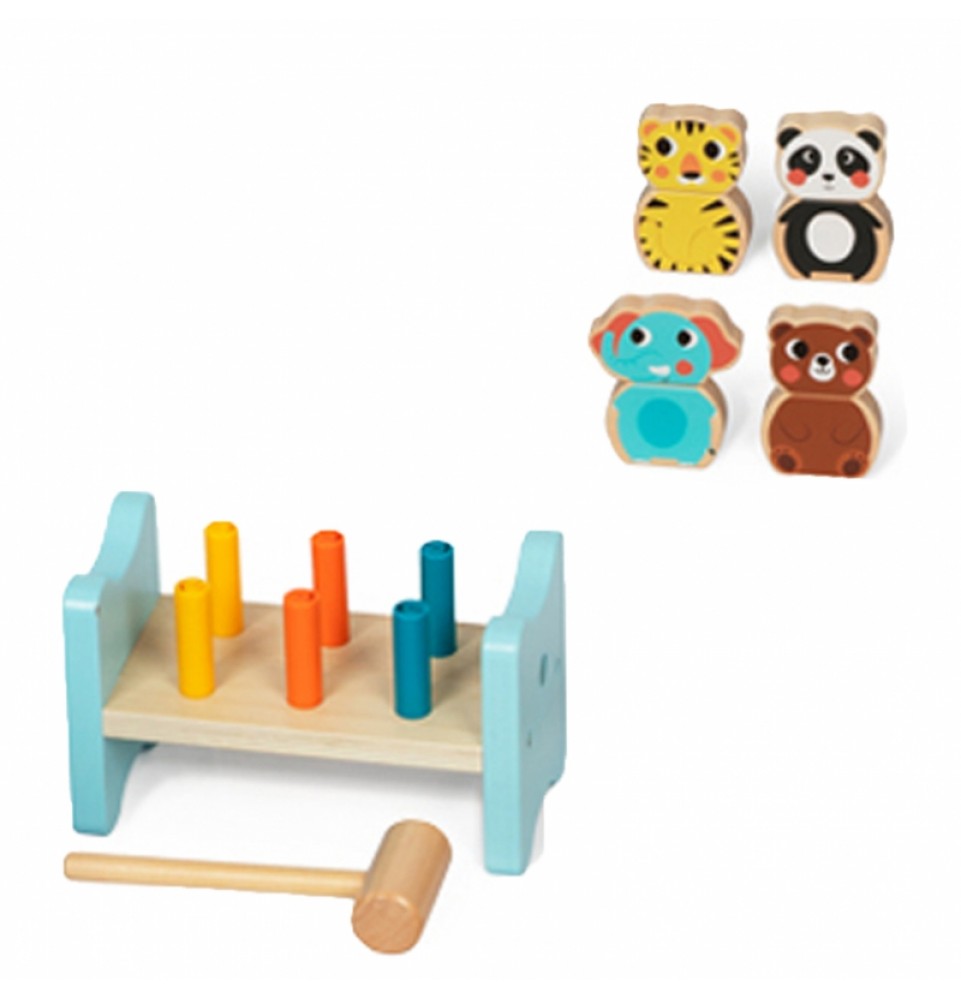Šis klasikinis žaislas patraukia mažylių dėmesį. Jo patvari medinė konstrukcija , šeši spalvingi kaiščiai ir plaktukas skatina vaikus įkalti visus kaiščius į skylutes, tada apversti žaislą ir kartoti procesą vėl ir vėl. Šis žaislas lavina spalvų atpažinimą, akių ir rankų koordinaciją, smulkiąją motoriką ir kūrybinį žaidimą. Jis prisidės prie smulkiosios motorikos , loginio mąstymo ir spalvų mokymosi lavinimo. Žaidimas su plaktuku padės vaikams lavinti tikslius rankų judesius, o tai vėliau palengvins rašymo mokymąsi .