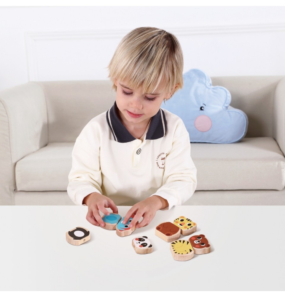 Šis medinių dėlionių su magnetais rinkinys vaizduoja įvairius gyvūnus: lokį, tigrą, dramblį ir pandą. Dėlionės pagamintos iš didelių dalių, kurios yra pakankamai didelės, kad jas būtų galima praryti, tačiau lengvai suimamos. Kraštai yra švelniai poliruoti ir suapvalinti, kad apsaugotų mažas rankytes. Magnetai yra įmontuoti, todėl nėra baimės, kad jie atsilaisvins surinkimo metu, todėl žaidimas tampa dar įdomesnis. Kiekvienas gyvūnas yra tvarkingai padalintas į dvi dalis, o vaikai turi naudoti savo miklias rankas, kad atkurtų jų pradinę formą! Surinkdami jas poromis (viena galva ir viena kūnas), vaikai lavina smulkiąją motoriką ir vaizduotę, gerina rankų miklumą ir gerina akių ir rankų koordinaciją.