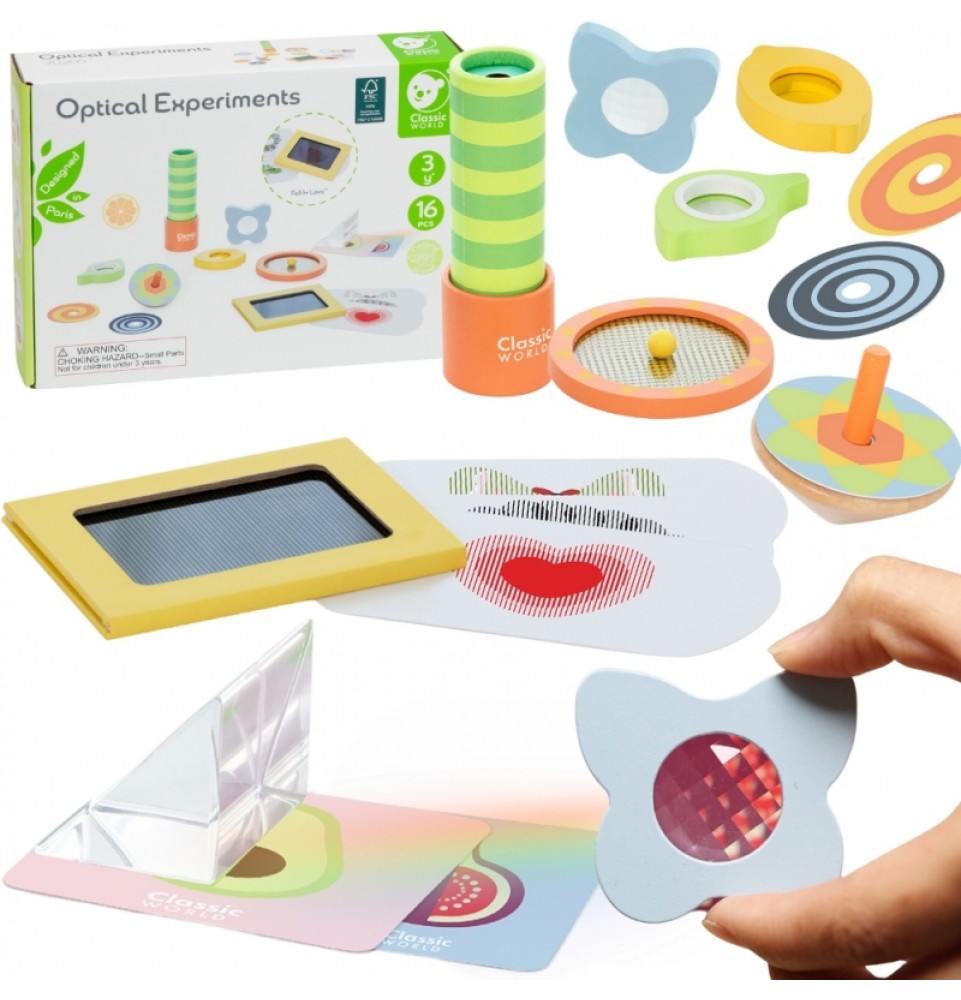 „Classic World“ optinių eksperimentų rinkinys – puiki dovanos idėja jūsų vaikui. Aukštos kokybės gaminiai, kruopščiai atrinkti kiekviename gamybos etape, supažindins vaikus su magišku optinių iliuzijų pasauliu . Rinkinį sudaro 16 skirtingų detalių, ir kiekviena iš jų nustebins jūsų vaiką! Skatinantis tyrinėjimą, kūrybiškumą ir praktinį mokymąsi, tai neįkainojama priemonė pradedantiesiems mokslininkams ir jauniems studentams, įskiepijanti meilę atradimams! Šis žaislas sklandžiai derina estetiką su moksliniais tyrimais, todėl yra vizualiai žavus ir intelektualiai stimuliuojantis.