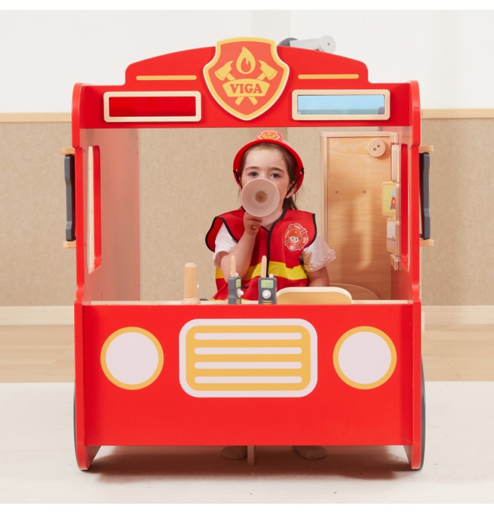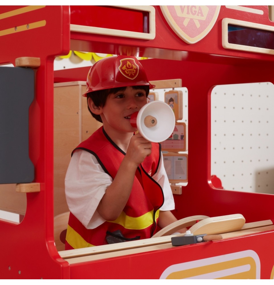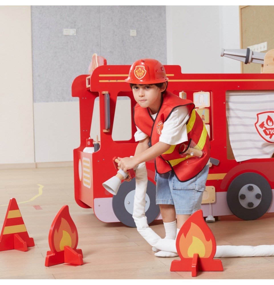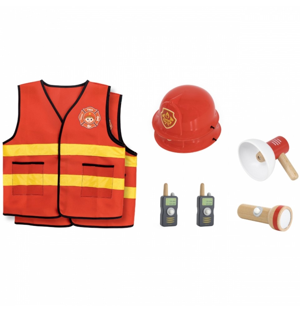 VIGA ugniagesio kostiumo ir aksesuarų rinkinys yra puiki dovana vaikams, svajojantiems tapti ugniagesiais. Šį rinkinį sudaro dvi šviesą atspindinčios liemenės, du raudoni šalmai, dvi medinės racijos, megafonas ir žibintuvėlis. Liemenės turi kišenes ir užsegimus lipdukais.