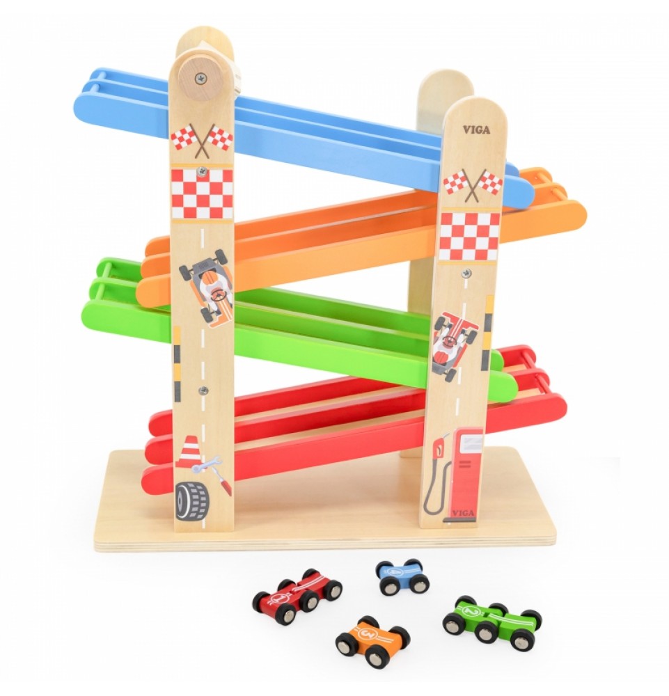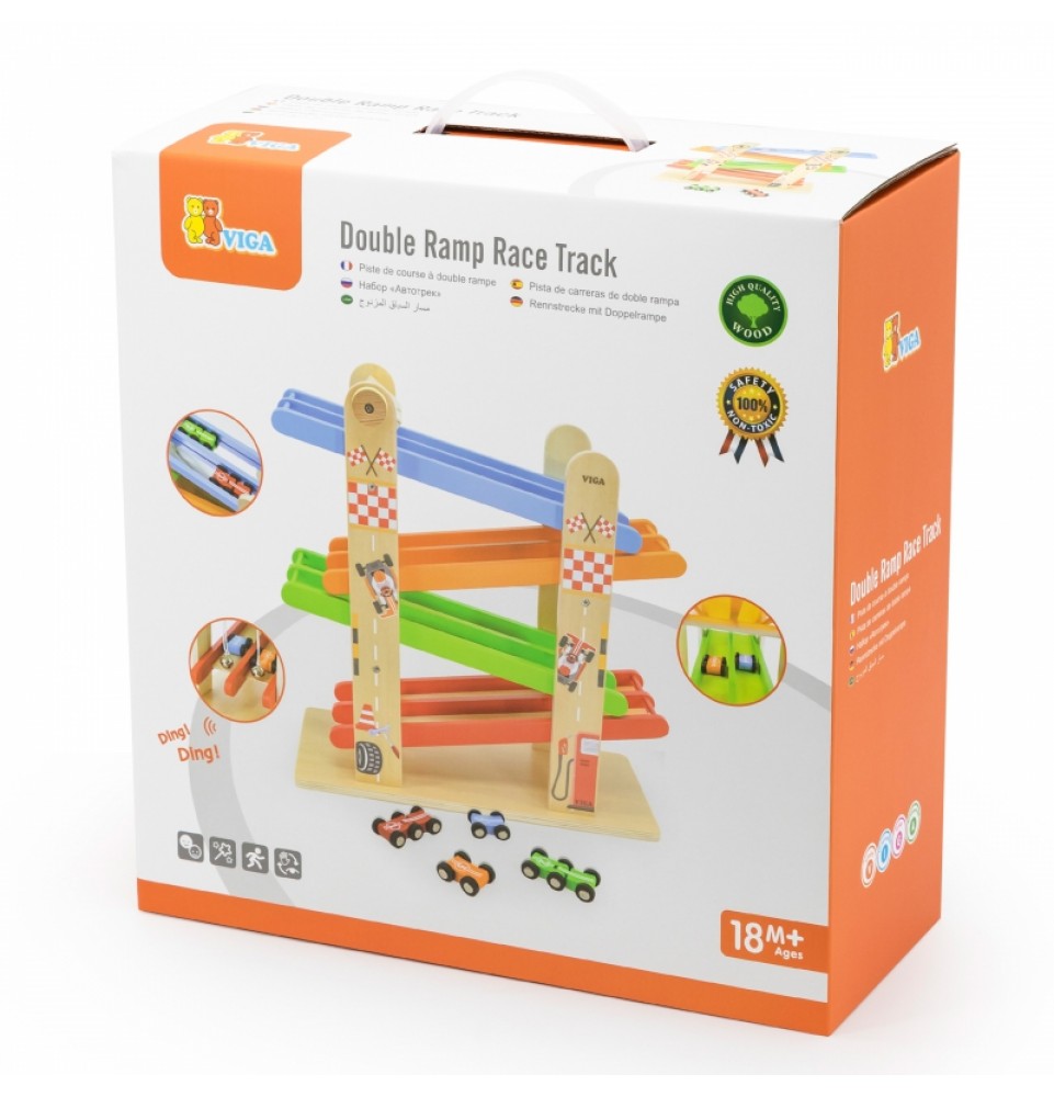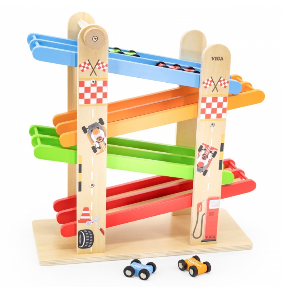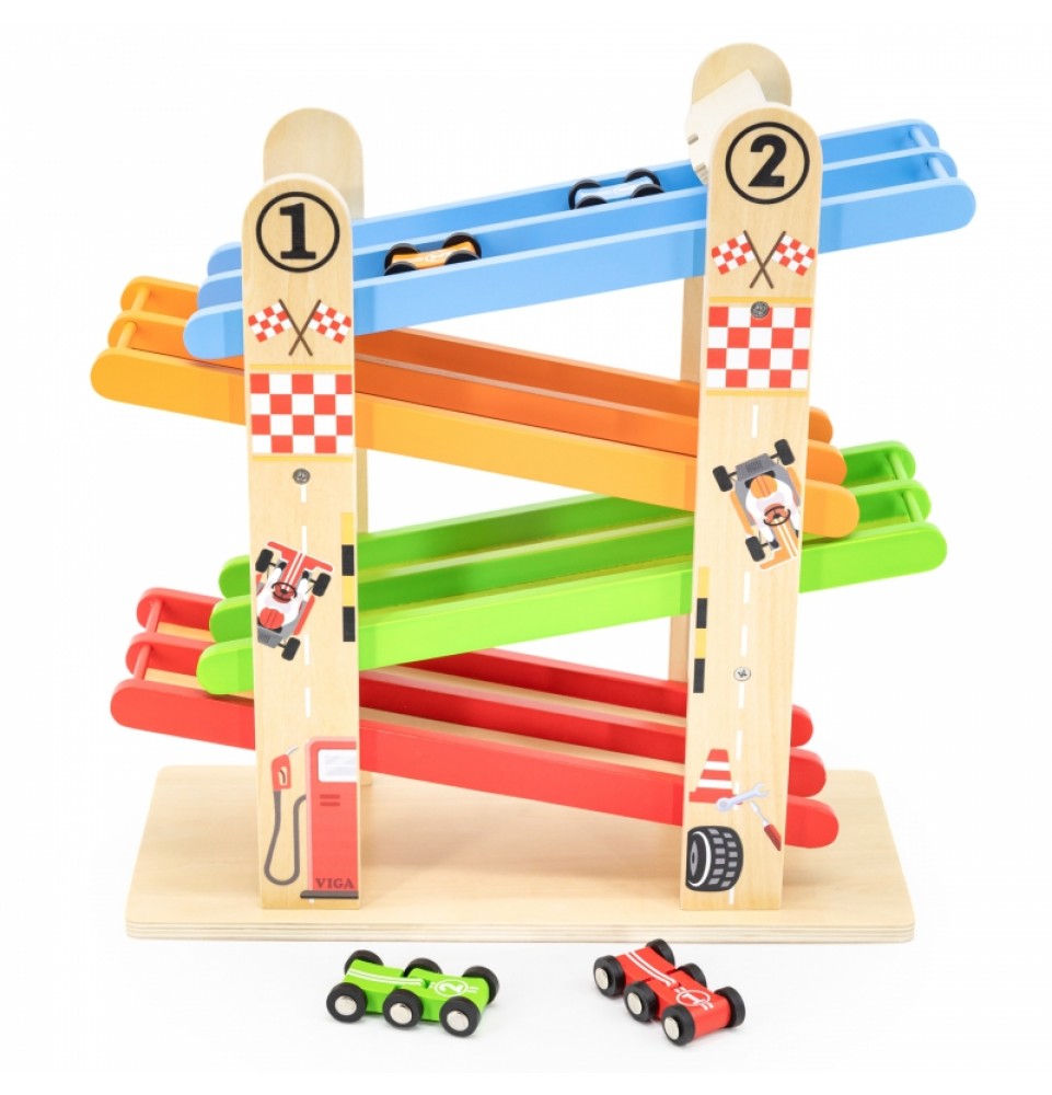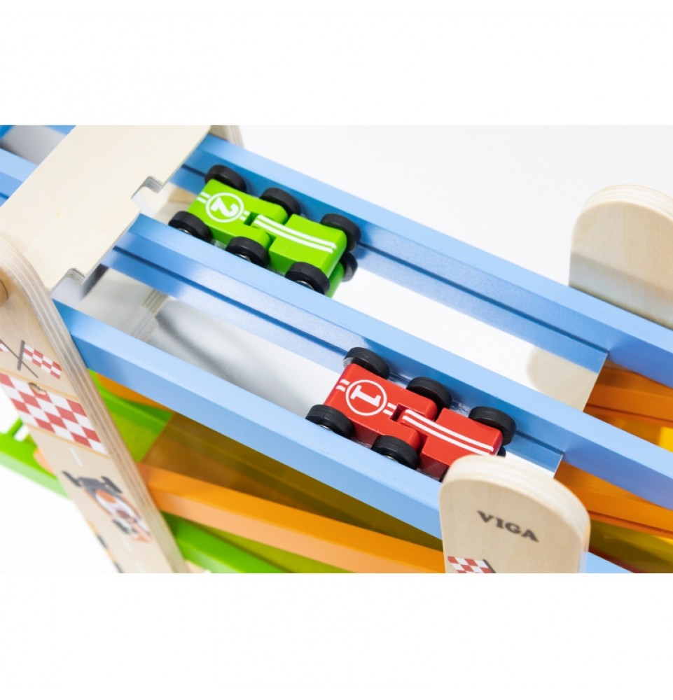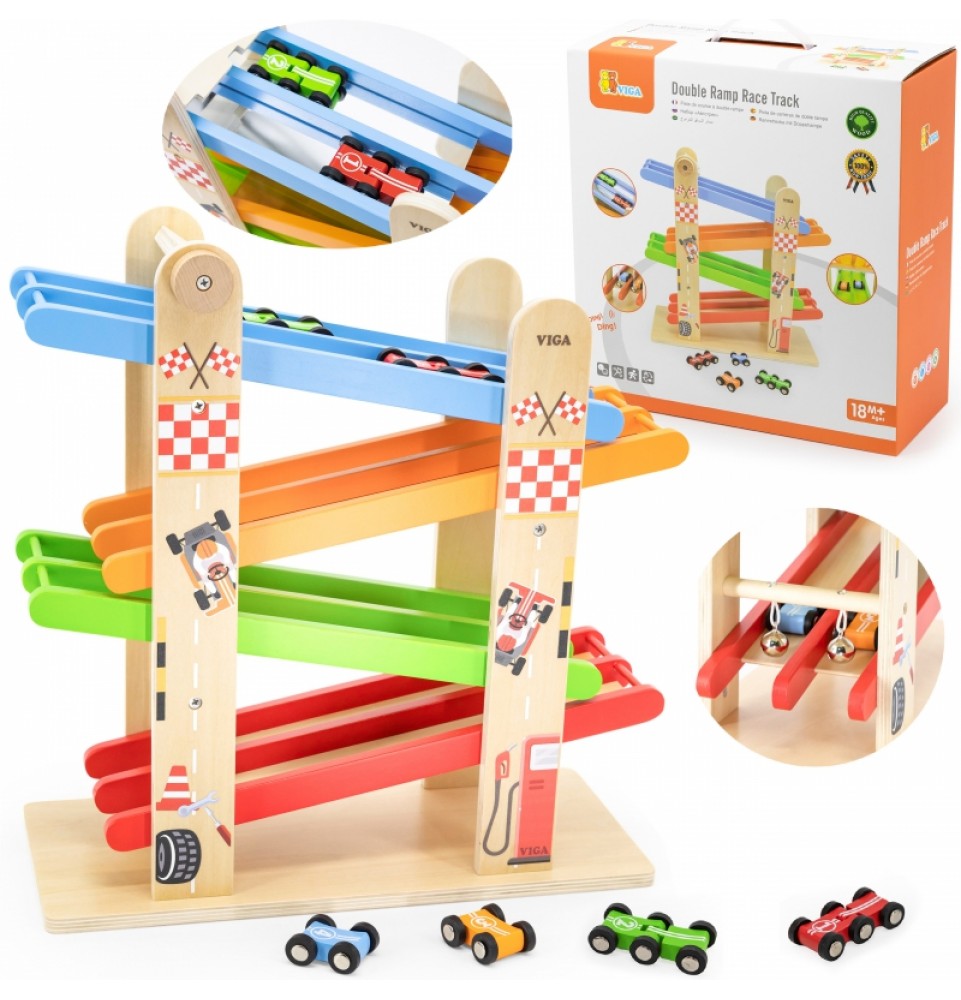 VIGA medinė dviguba čiuožykla žaislinių automobilių lenktynių trasai