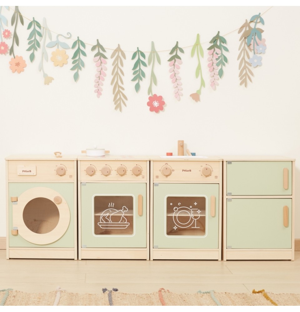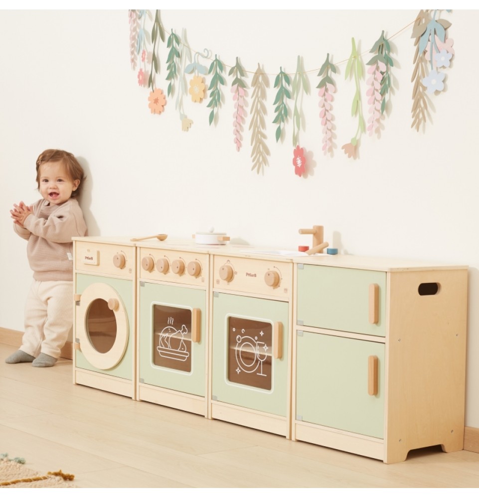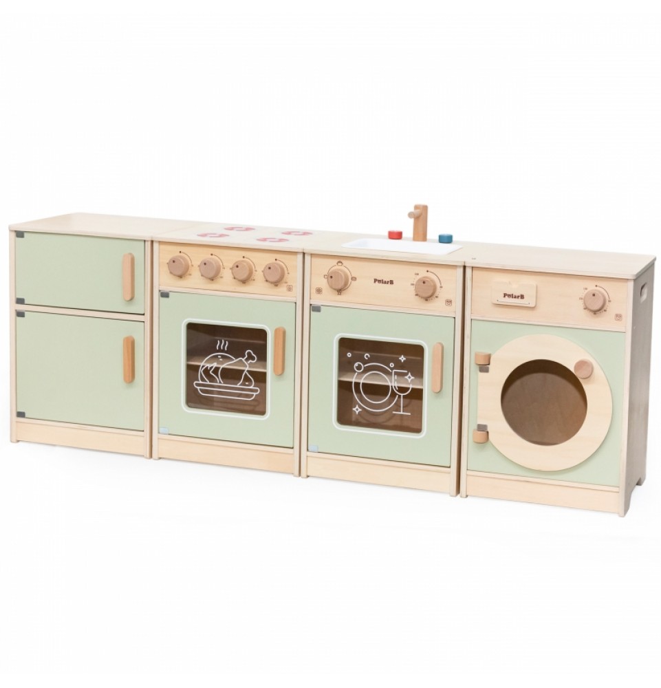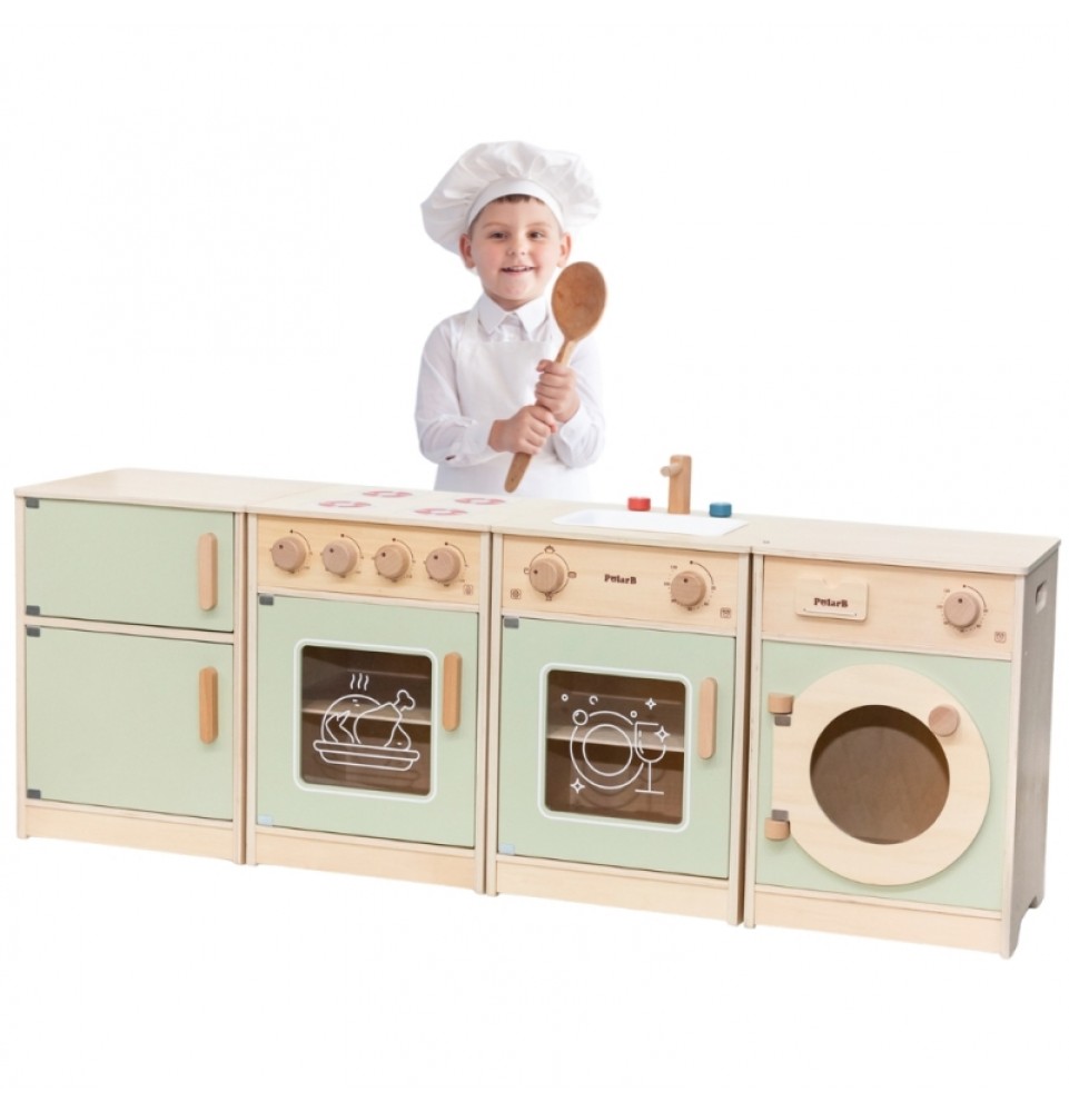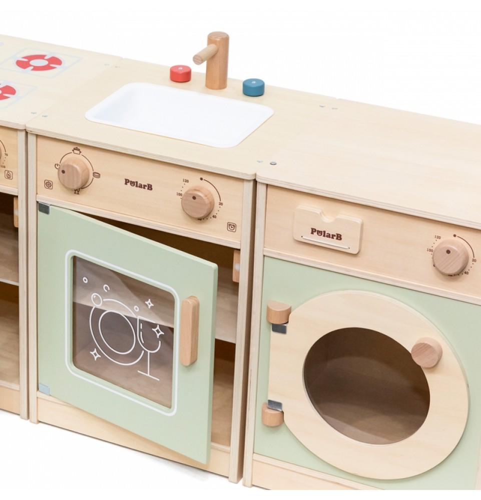 Šis didelis medinis „Viga“ virtuvės komplektas mažyliams yra specialiai sukurtas rinkinys, kuris suteiks jūsų vaikui nepamirštamų žaidimo akimirkų! Rinkinį sudaro šaldytuvas, viryklė su orkaite, kriauklė, indaplovė ir skalbimo mašina. Storos rankenos leidžia lengvai atidaryti ir uždaryti dureles, o visos rankenėlės pasukus skleidžia spragtelėjimo garsą . Gražios pastelinės spalvos traukia vaikų dėmesį ir kartu yra žavinga kambario puošmena. Komplektas yra visiškai saugus mažiems vaikams, be aštrių briaunų ar kampų. Ši žaislinė virtuvė yra kūrybinio žaidimo centras , lavinantis vaizduotę, bendradarbiavimo įgūdžius ir motorinius įgūdžius. Mažyliai gali atkurti suaugusiųjų gyvenimo scenas, ruošti maistą artimiesiems ir lavinti savarankiškumą. Tai puikus būdas interaktyviai mokyti vaikus apie maistą, maisto gaminimą, skaičiavimą, spalvas ir formas. Be to, šis žaislas gali augti kartu su jūsų vaiku, o įvairūs priedai suteikia daugiau linksmybių!