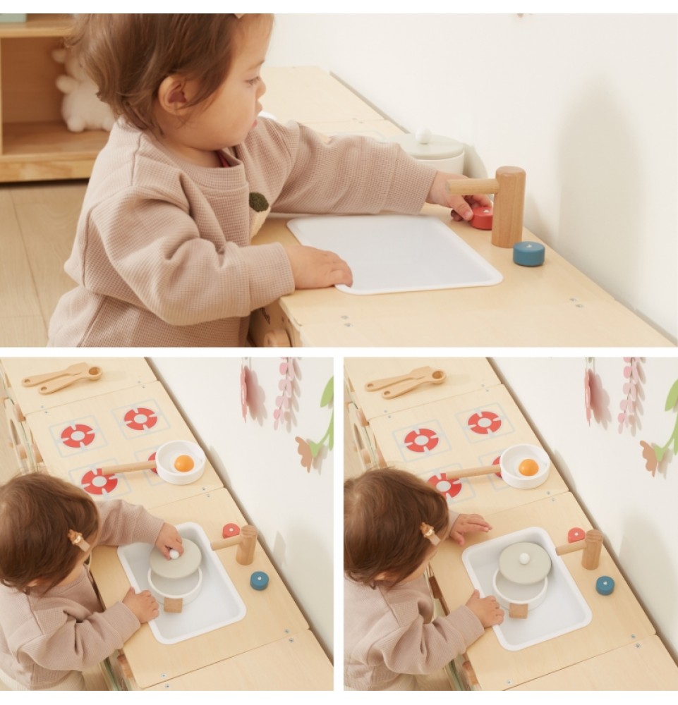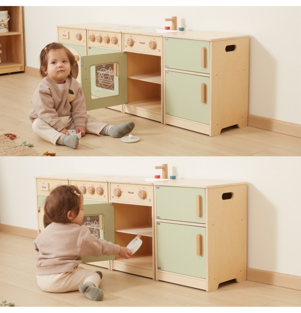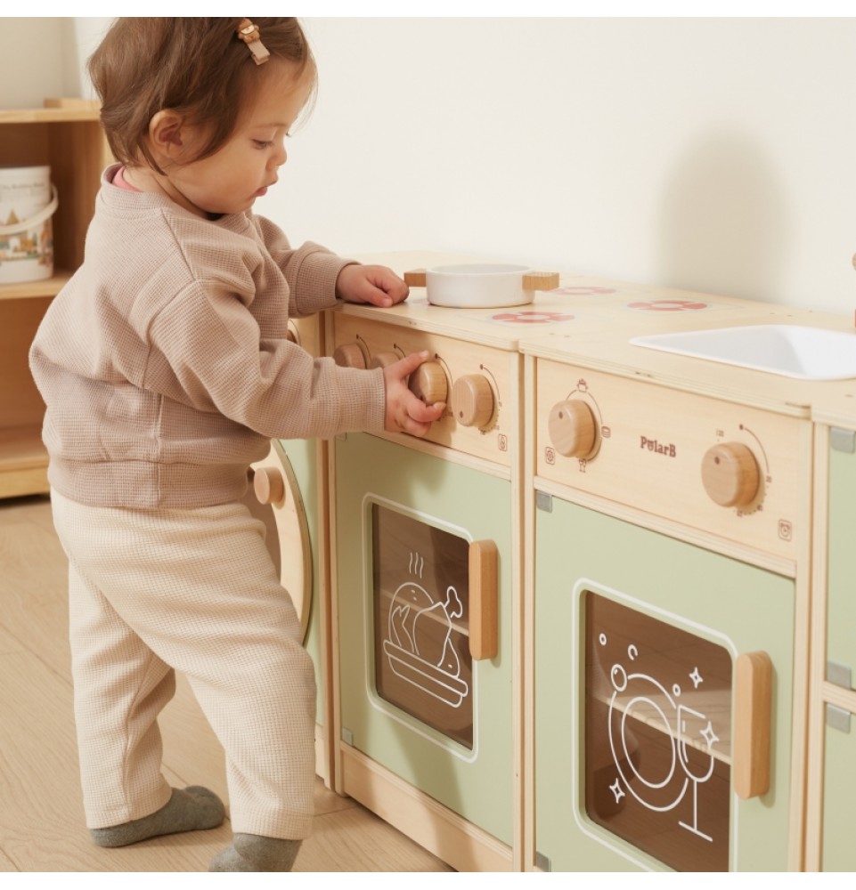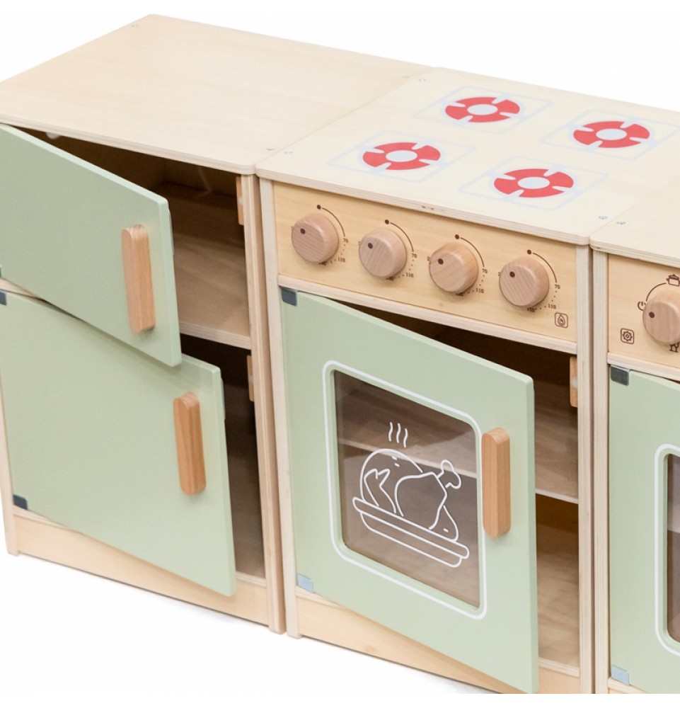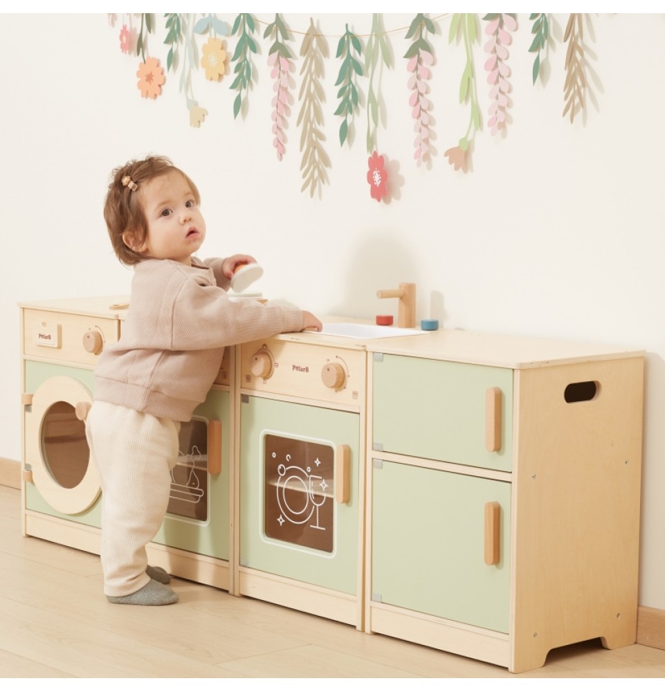 Šis didelis medinis „Viga“ virtuvės komplektas mažyliams yra specialiai sukurtas rinkinys, kuris suteiks jūsų vaikui nepamirštamų žaidimo akimirkų! Rinkinį sudaro šaldytuvas, viryklė su orkaite, kriauklė, indaplovė ir skalbimo mašina. Storos rankenos leidžia lengvai atidaryti ir uždaryti dureles, o visos rankenėlės pasukus skleidžia spragtelėjimo garsą . Gražios pastelinės spalvos traukia vaikų dėmesį ir kartu yra žavinga kambario puošmena. Komplektas yra visiškai saugus mažiems vaikams, be aštrių briaunų ar kampų. Ši žaislinė virtuvė yra kūrybinio žaidimo centras , lavinantis vaizduotę, bendradarbiavimo įgūdžius ir motorinius įgūdžius. Mažyliai gali atkurti suaugusiųjų gyvenimo scenas, ruošti maistą artimiesiems ir lavinti savarankiškumą. Tai puikus būdas interaktyviai mokyti vaikus apie maistą, maisto gaminimą, skaičiavimą, spalvas ir formas. Be to, šis žaislas gali augti kartu su jūsų vaiku, o įvairūs priedai suteikia daugiau linksmybių!