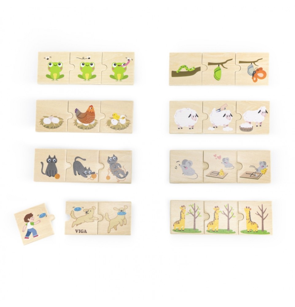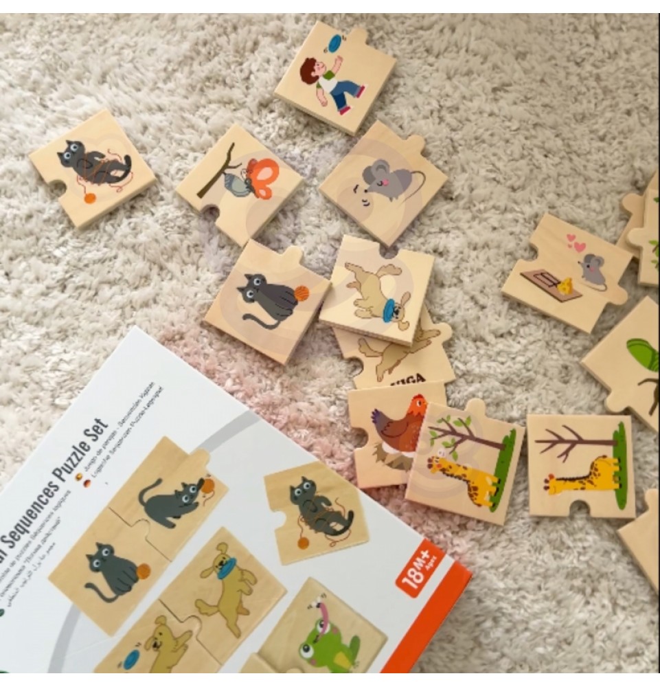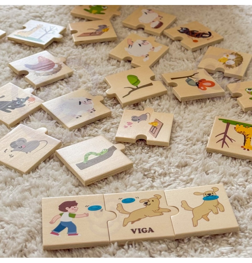 Medinis VIGA „Suderinti veiksmus“ dėlionė skatina vaikus suderinti aštuonis spalvingų dėlionės detalių rinkinius su gyvūnų veiksmais, pavyzdžiui, šuns, atnešančio gyvūnus , arba žirafos, ėdančios augalus nuo medžių. Tai puikus žaislas vaikams, leidžiantis jiems mokytis ir įtvirtinti žinias apie konkrečių veiksmų atpažinimą ir aprašymą. Šis dėlionių rinkinys suteikia daug galimybių užmegzti santykius su savo vaikais . Padėkite vaikams suprasti kasdienės veiklos seką ir lavinti loginio mąstymo bei pasakojimo įgūdžius. Tai puikus būdas lavinti naują žodyną, susikaupimą ir smulkiąją motoriką mažiems vaikams, taip pat kurti asociacijas ir santykius . Pagrindinė šios dėlionės funkcija yra ne tik mokymasis. Ji taip pat lavina stebėjimą, susikaupimą, smulkiąją motoriką ir akių koordinaciją . Tai neįtikėtinai lavinamasis žaislas!