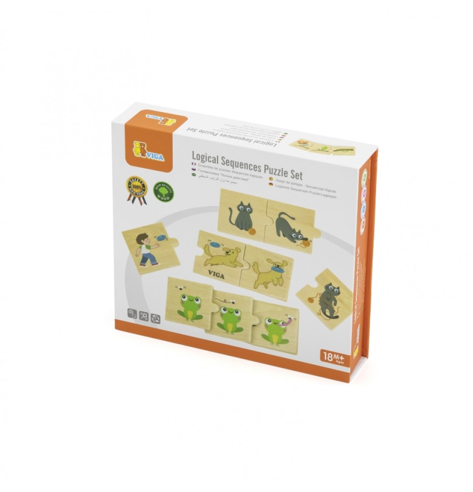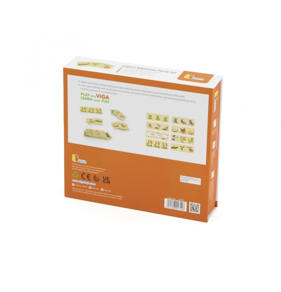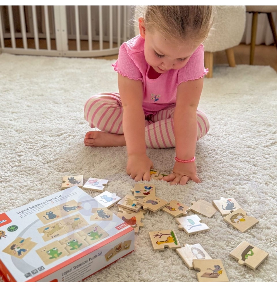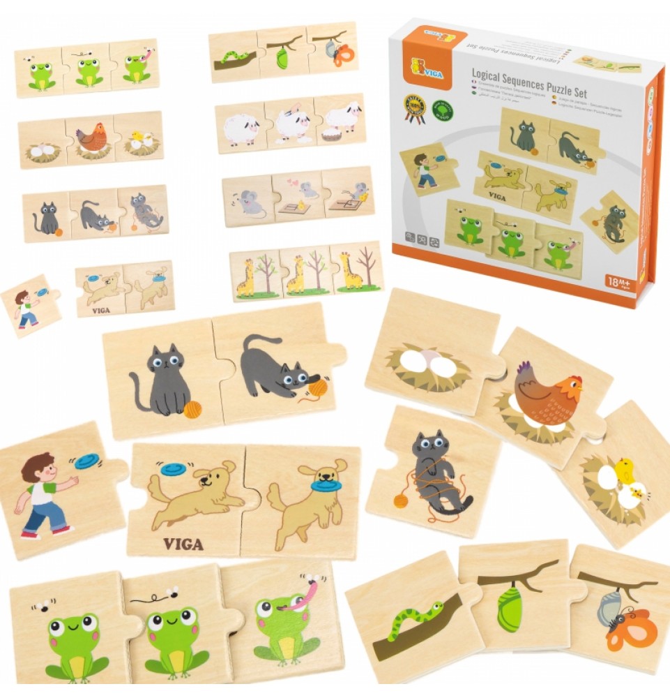 Medinis VIGA „Suderinti veiksmus“ dėlionė skatina vaikus suderinti aštuonis spalvingų dėlionės detalių rinkinius su gyvūnų veiksmais, pavyzdžiui, šuns, atnešančio gyvūnus , arba žirafos, ėdančios augalus nuo medžių. Tai puikus žaislas vaikams, leidžiantis jiems mokytis ir įtvirtinti žinias apie konkrečių veiksmų atpažinimą ir aprašymą. Šis dėlionių rinkinys suteikia daug galimybių užmegzti santykius su savo vaikais . Padėkite vaikams suprasti kasdienės veiklos seką ir lavinti loginio mąstymo bei pasakojimo įgūdžius. Tai puikus būdas lavinti naują žodyną, susikaupimą ir smulkiąją motoriką mažiems vaikams, taip pat kurti asociacijas ir santykius . Pagrindinė šios dėlionės funkcija yra ne tik mokymasis. Ji taip pat lavina stebėjimą, susikaupimą, smulkiąją motoriką ir akių koordinaciją . Tai neįtikėtinai lavinamasis žaislas!