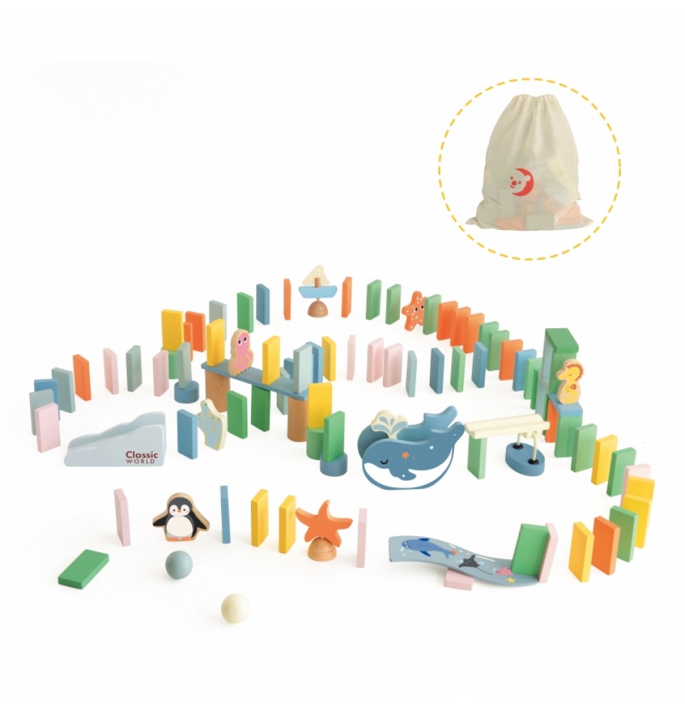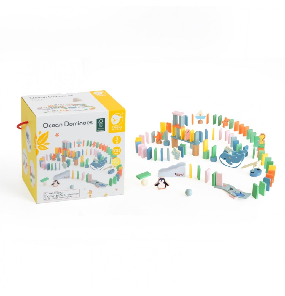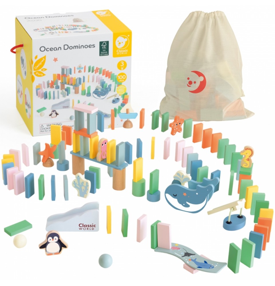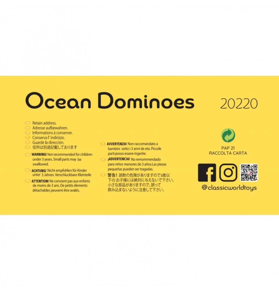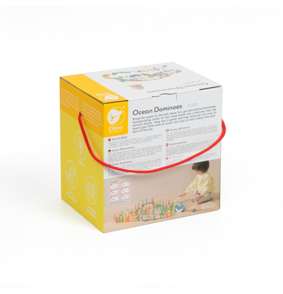 Įkvepkite vandenyną gyvybės su šiais smagiais ir lavinančiais CLASSIC WORLD domino kubeliais. Kiekvienas kubelis vaizduoja vieną mylimiausių jūros būtybių pasaulyje, todėl jie puikiai tinka mokyti skaičiuoti ir tyrinėti povandeninio pasaulio stebuklus.