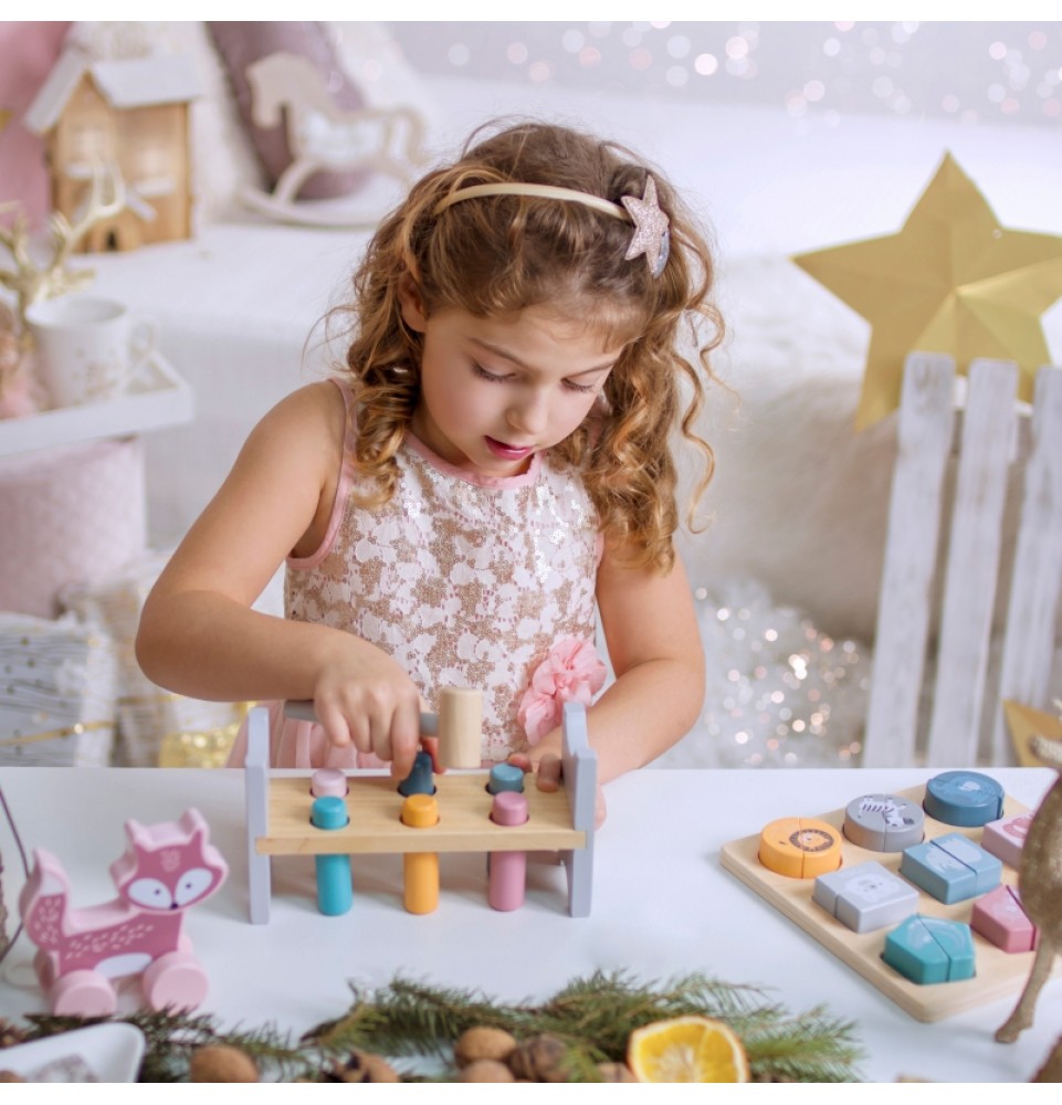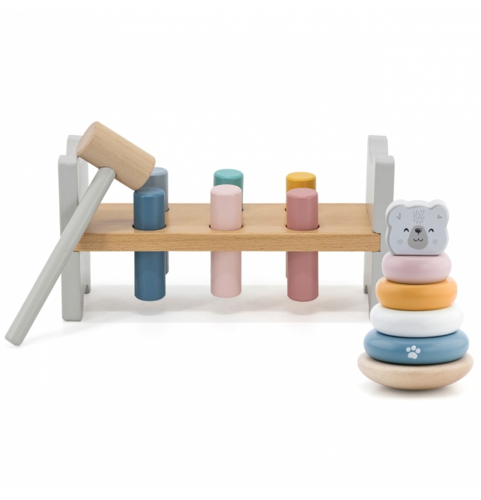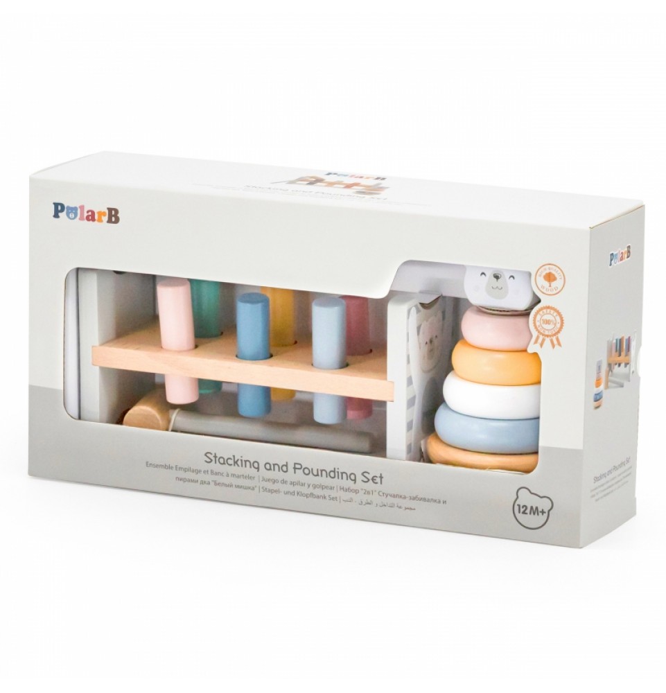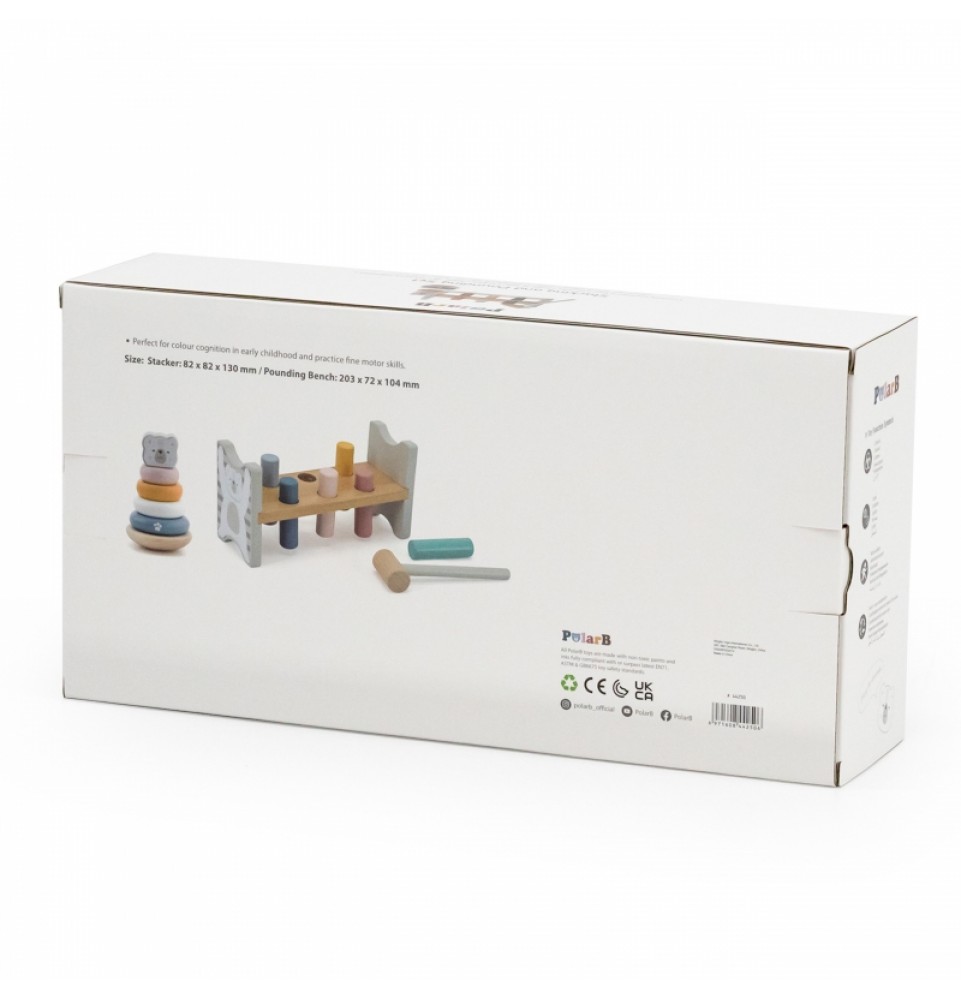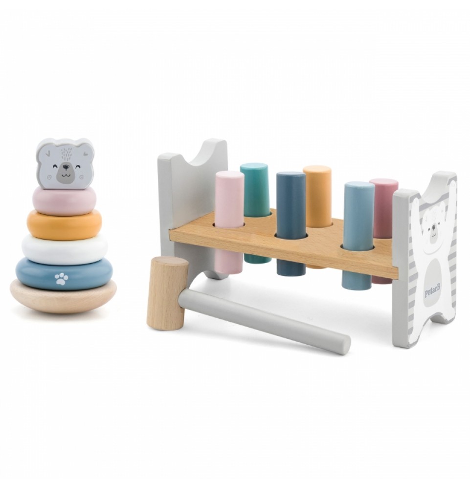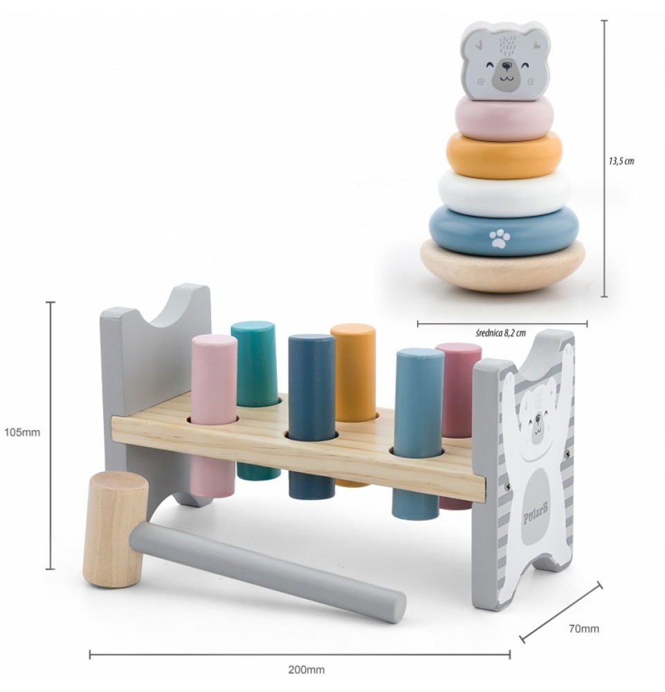 Šiame „ Viga“ „PolarB“ serijos rinkinyje yra du pastelinių spalvų mediniai žaislai: lavinamoji piramidė ir plaktukas su skylamušiu. Abu žaislai ne tik pralinksmins jūsų vaiką , bet ir prisidės prie smulkiosios motorikos, loginio mąstymo ir spalvų mokymosi lavinimo . Laikas, praleistas su šiais žaislais, padės jūsų vaikui lavinti tikslius rankų judesius, o tai vėliau palengvins rašymo mokymąsi .