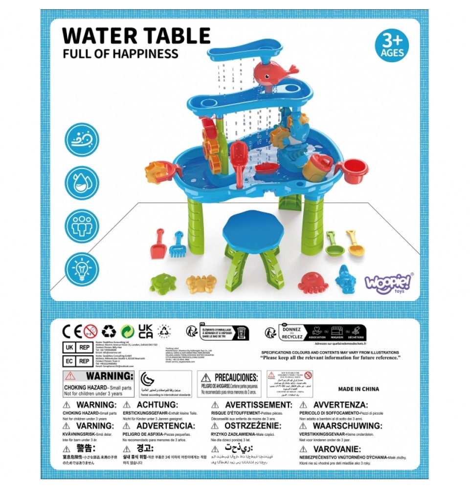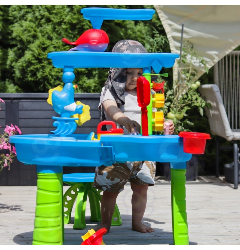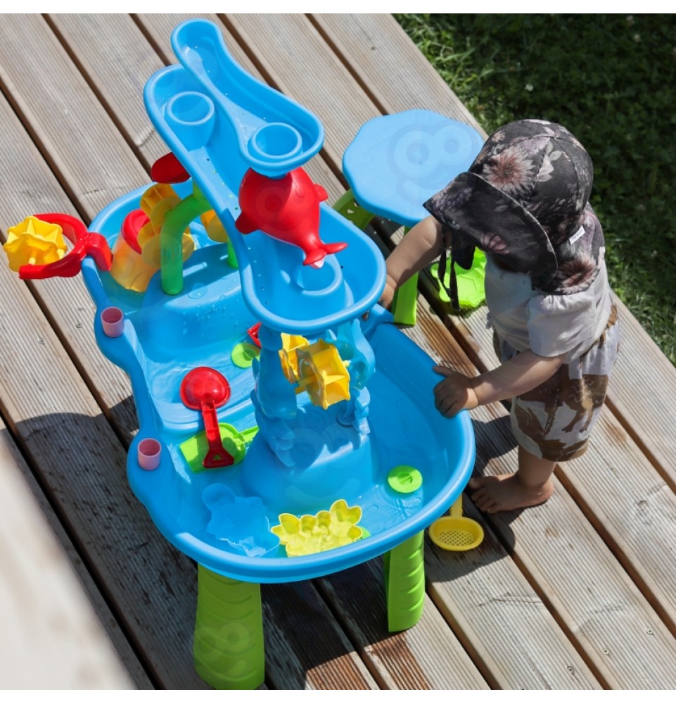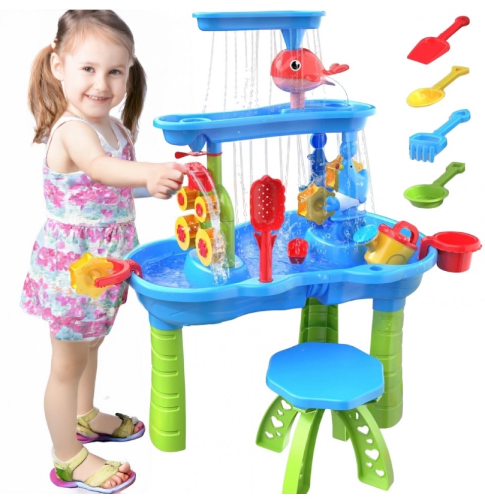Unikalus WOOPIE vandens staliukas – puikus būdas smagiai praleisti laiką ištisus metus, nepriklausomai nuo oro sąlygų. Tai ne tik fantastiška pramoga karštomis dienomis, bet ir puikus būdas įveikti nuobodulį atvėsus orams. Šis unikalus staliukas pasižymi pažangia, trijų pakopų vandens sistema, kuri tikrai pradžiugins bet kurį vaiką! Mažieji tyrinėtojai gali naudoti laistytuvą vandeniui pilti į viršutinę kamerą ir stebėti, kaip krioklys teka į apatinį rezervuarą, įjungdamas vandens ratą. Be to, su pridėtais priedais šis staliukas taip pat gali būti naudojamas žaidimams smėlyje , tiek įprastiems , tiek kinetiniams , todėl tai universalus žaislas bet kokiai progai.