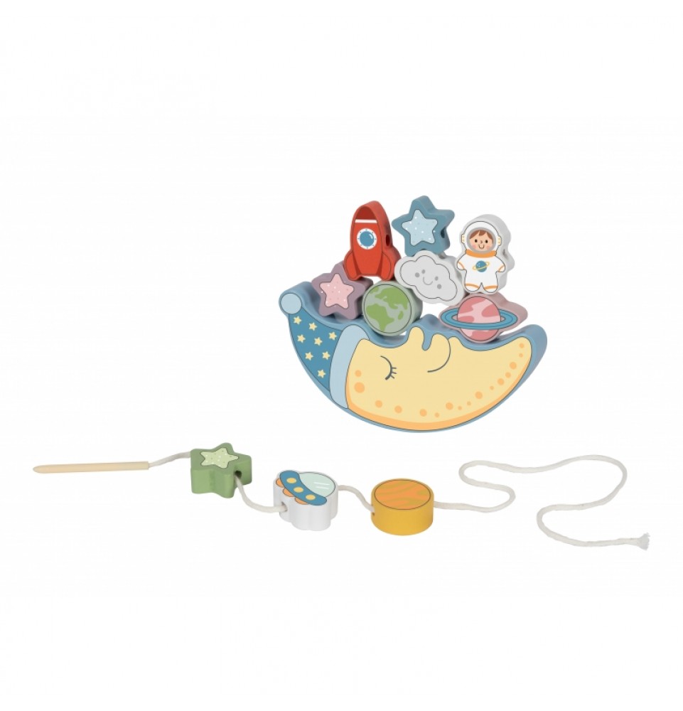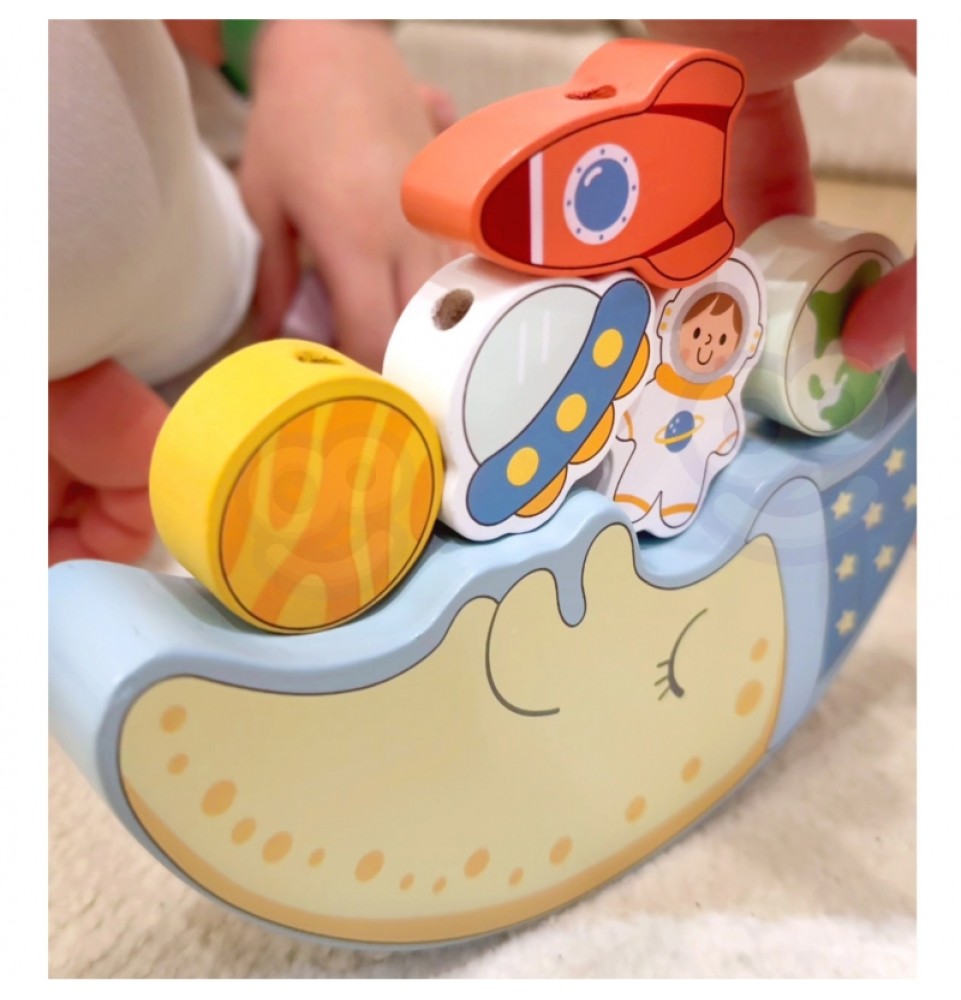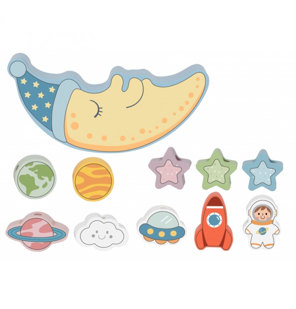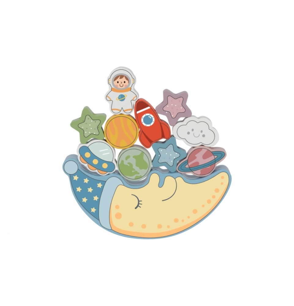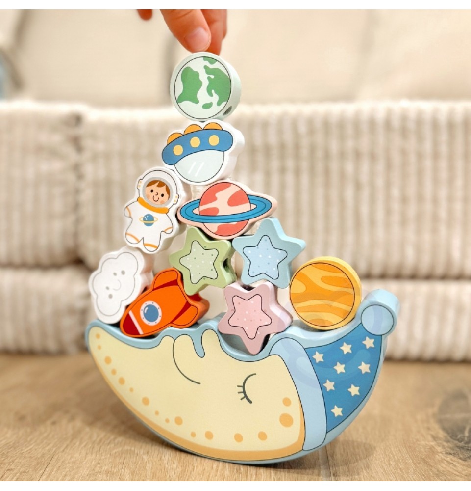 Pirmoji rinkinio dalis yra pusiausvyros iššūkis: vaikai bando padėti 10 spalvingų kaladėlių – raketą, astronautą, žvaigždes, NSO, planetas ir linksmą debesį – ant miegančio mėnulio veido, stengdamiesi neleisti konstrukcijai apvirsti. Tai puiki proga lavinti tikslumą ir kantrybę.