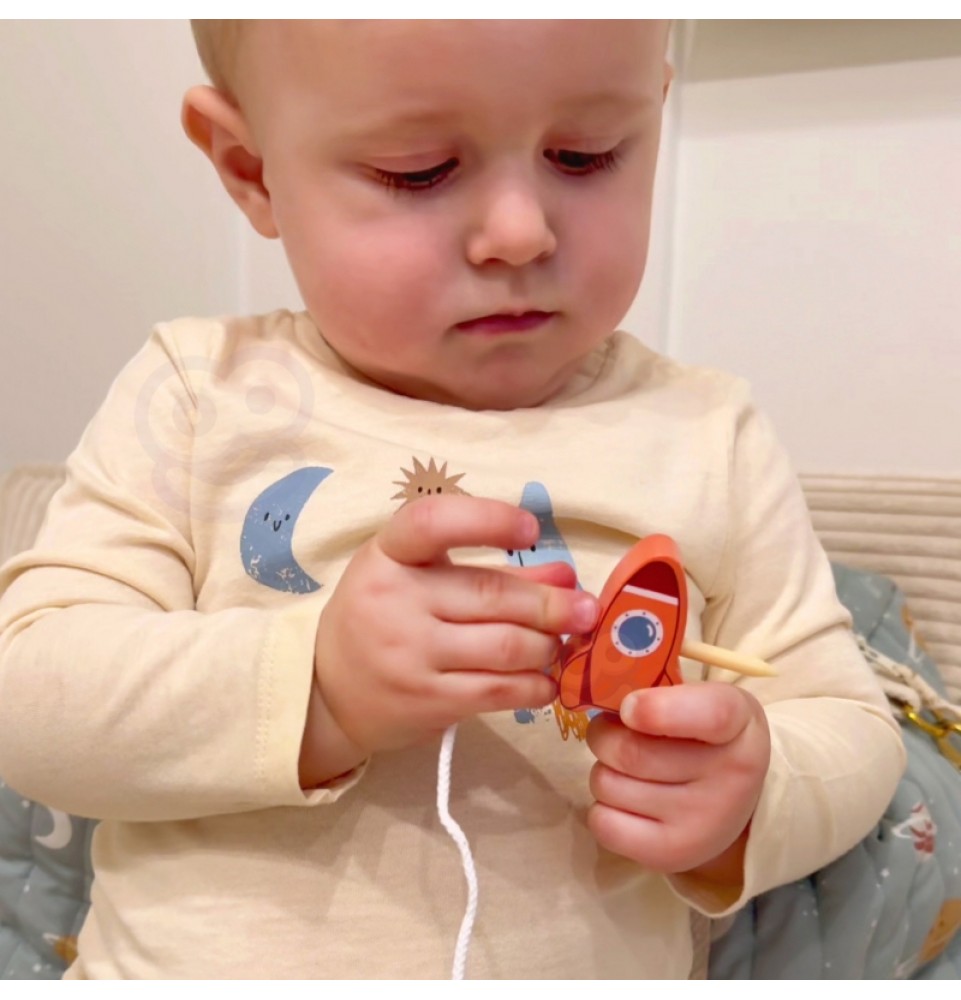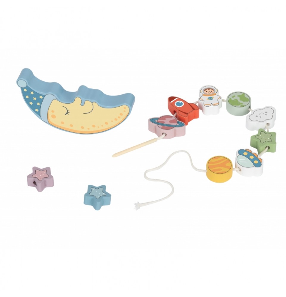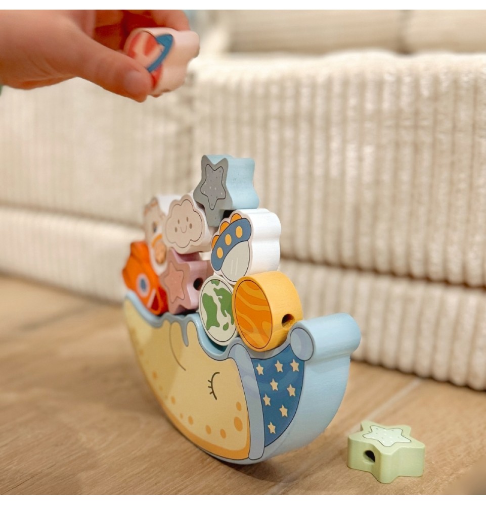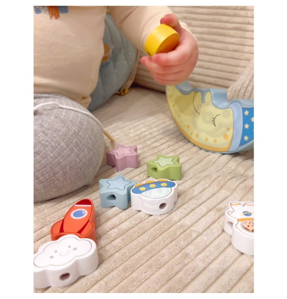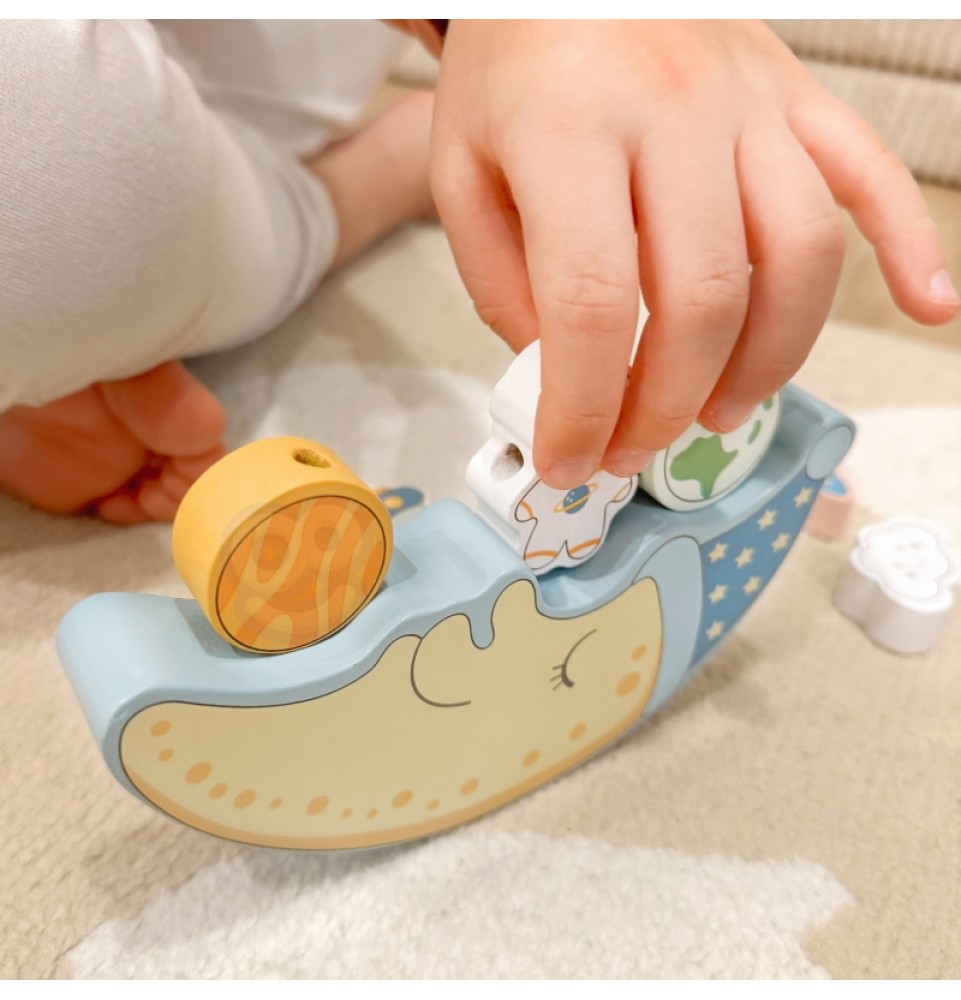 „Tooky Toy“ miegantis mėnulis leidžia vaikams tyrinėti kosmoso nuotykius balansuojant ir virvelėmis veriant. Šis universalus žaislas yra puikus pramogų ir mokymosi derinys, lavinantis smulkiosios motorikos įgūdžius ir problemų sprendimo įgūdžius.