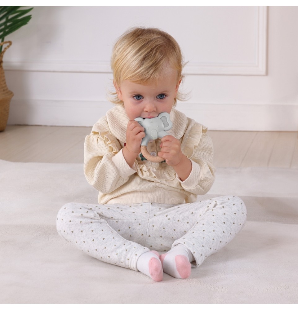 Šis žavus dramblys taps geriausiu jūsų vaiko draugu. Jis visiškai saugus , lengvai valomas , o natūrali mediena yra antibakterinė , dėl savo tekstūros suteikdama naują jutiminę patirtį. Minkštas silikonas ramina jautrias jūsų mažylio dantenas , o tai labai svarbu dygstant dantukams. Be to, dramblys puikiai telpa į mažas kūdikio rankytes, lavindamas vaizduotę.