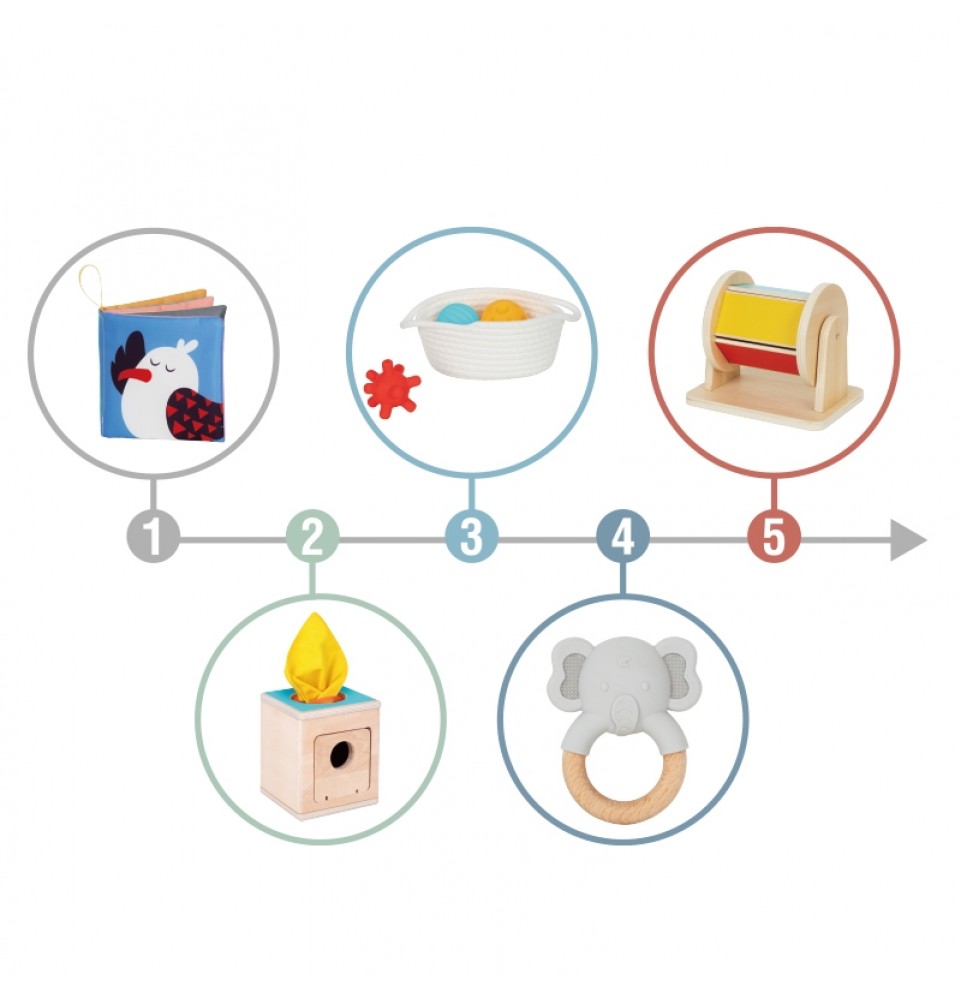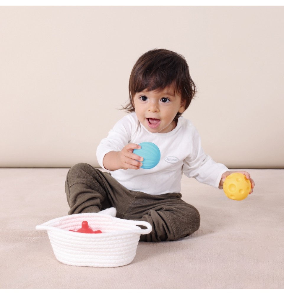 Rinkinį sudaro trys sensoriniai kamuoliukai su skirtingais paviršiais ir pintas krepšelis , kuriame kamuoliukus galima laikyti po žaidimo. Dėl įvairių paviršių kamuoliukai yra puikus sensorinis žaislas, skatinantis mažylių vystymąsi. Spalvingi kamuoliukai skatina kūdikius juos suimti ir manipuliuoti, kai jie guli ant pilvuko, o tai padeda stiprinti rankų ir kojų raumenis ir paruošia juos ropojimui. Rinkinyje taip pat yra pintas krepšelis, leidžiantis kūdikiams išimti ir įdėti kamuoliukus, kartu mokant juos „tuščia“ ir „pilna“ sąvokų. Žaislas skatina natūralų vaikų smalsumą ir motorinės koordinacijos vystymąsi smagiu ir saugiu būdu.