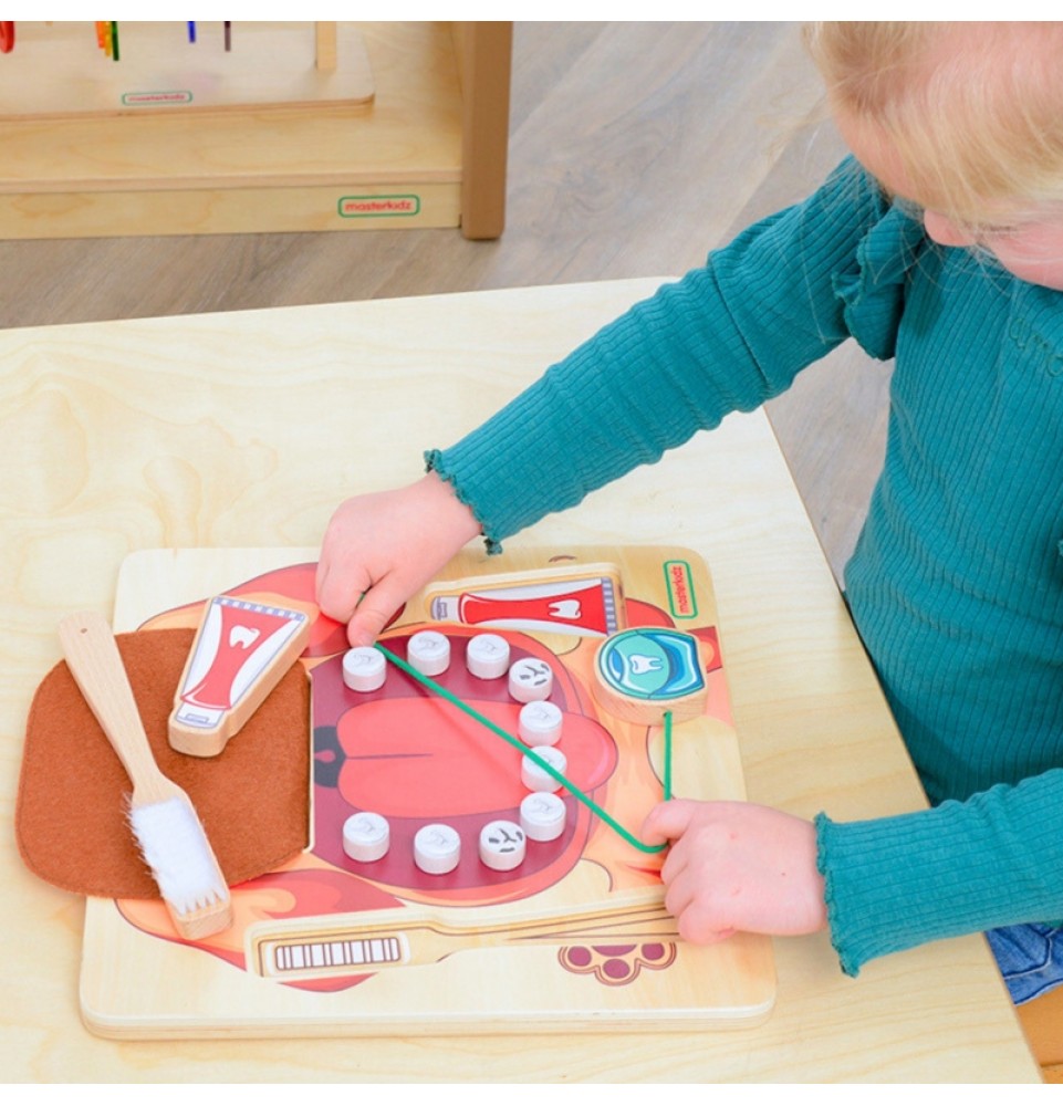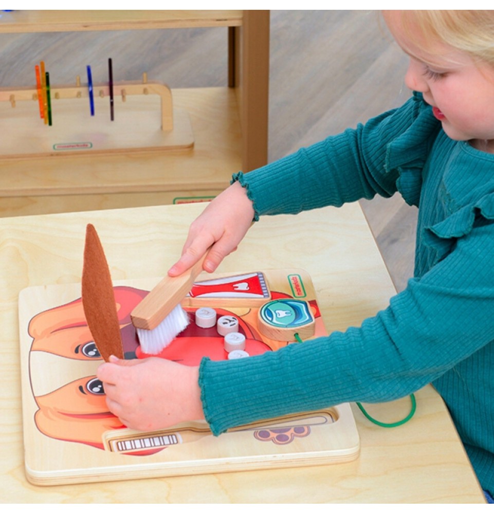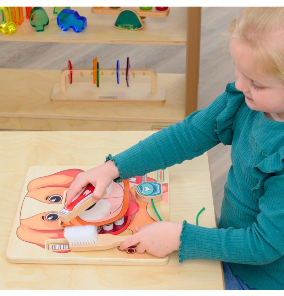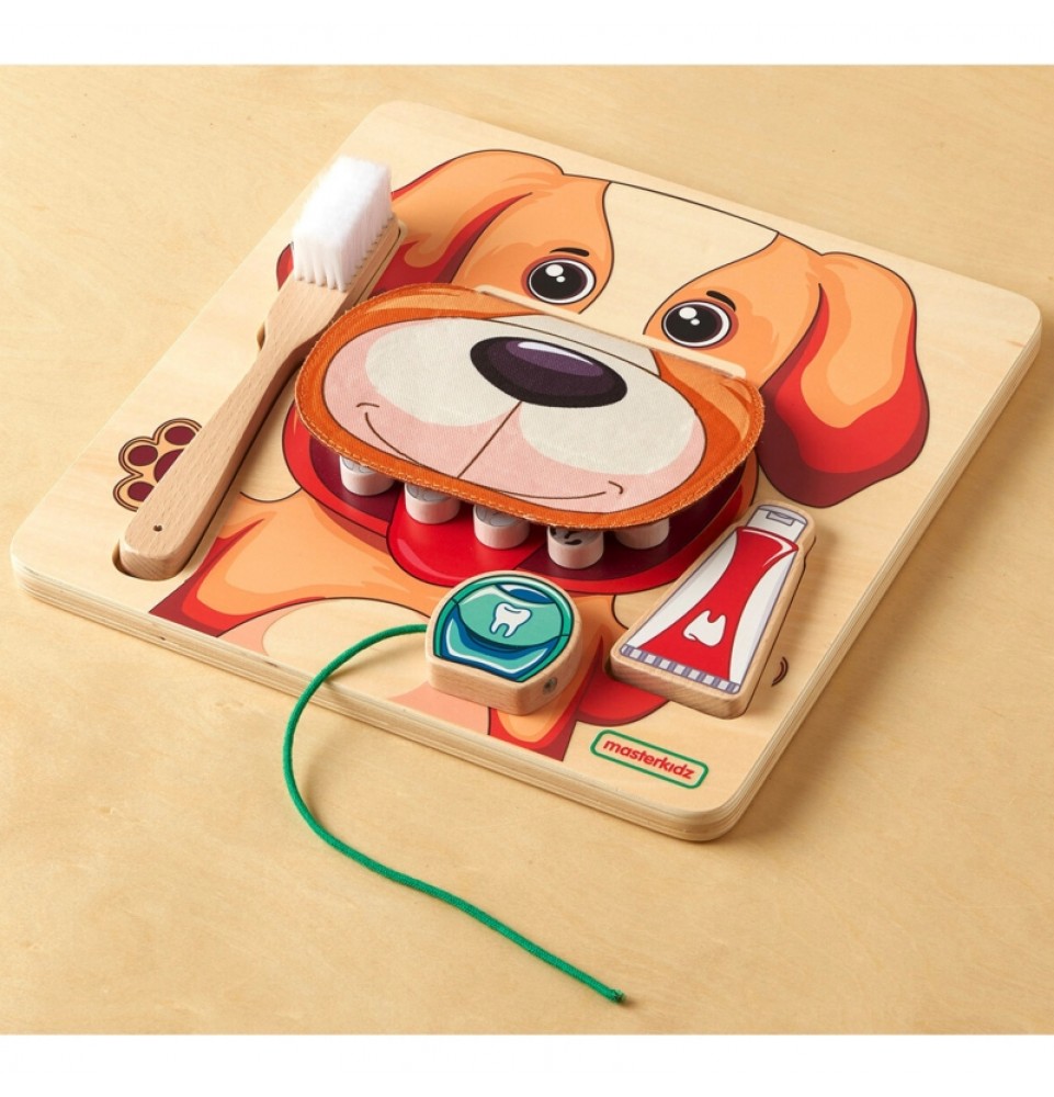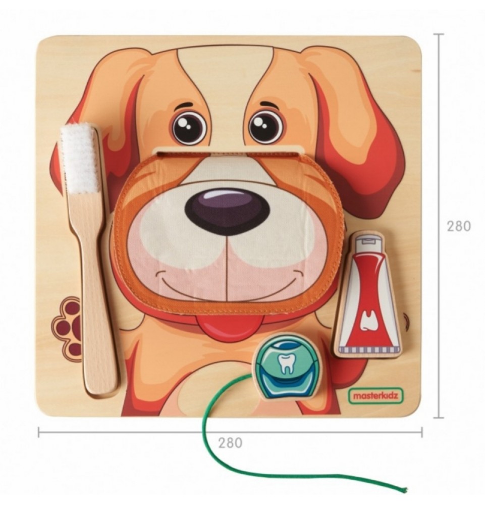 Ši edukacinė lenta sujungia šuns dantų valymo malonumą su burnos higienos mokymusi. Joje pavaizduotas draugiškas šuo, kurio burna atsidaro ir atidengiama 10 dantų . Rinkinį sudaro žaislinė dantų pasta , šepetėlis ir dantų siūlas. Vaikai gali žaismingai valyti savo šuns dantis, spausdami dantų pastą ant šepetėlio, šveičiant ir naudojant dantų siūlą, taip lavindami smulkiąją motoriką ir tikslumą. Žaislas skatina pokalbius apie savo dantų priežiūrą ir leidžia žaisti individualiai arba poromis.