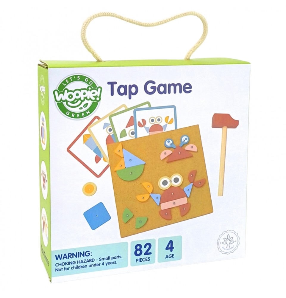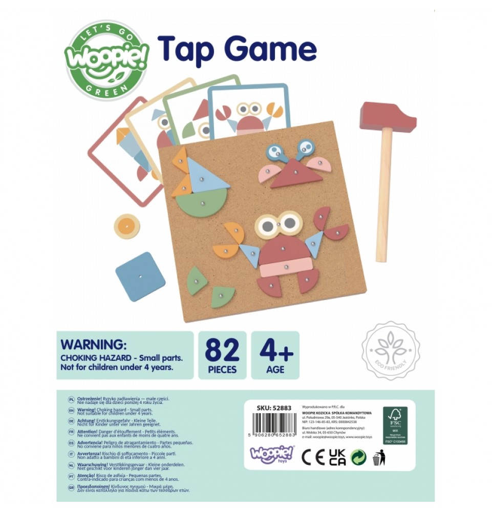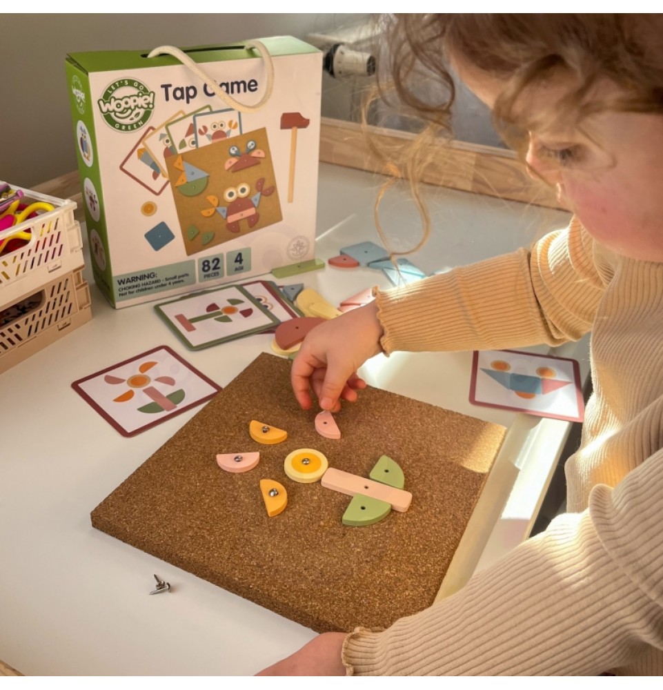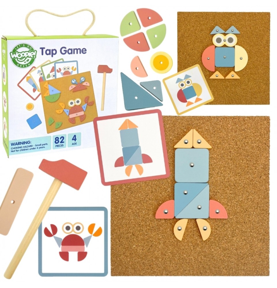 WOOPIE GREEN medinis dėlionės plaktukas su vinimis, 20 raštų, 82 vnt.