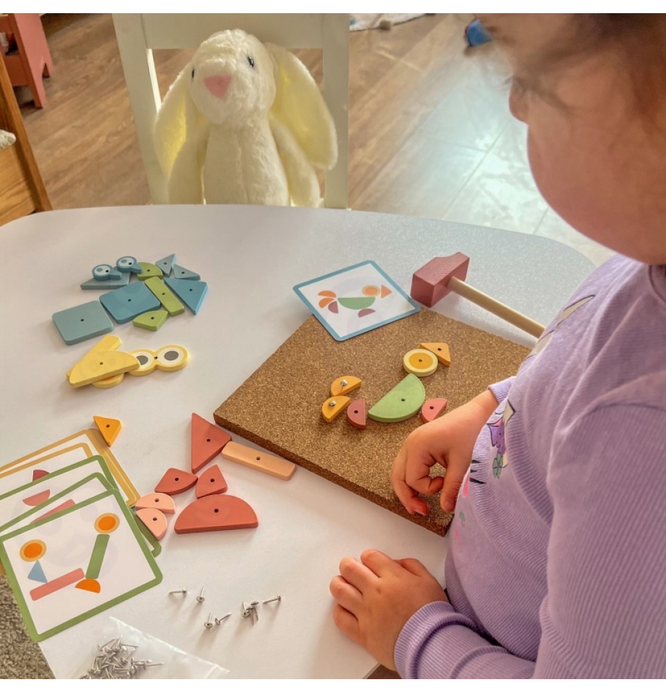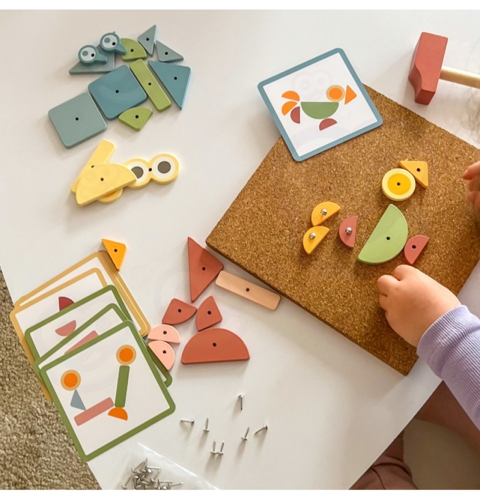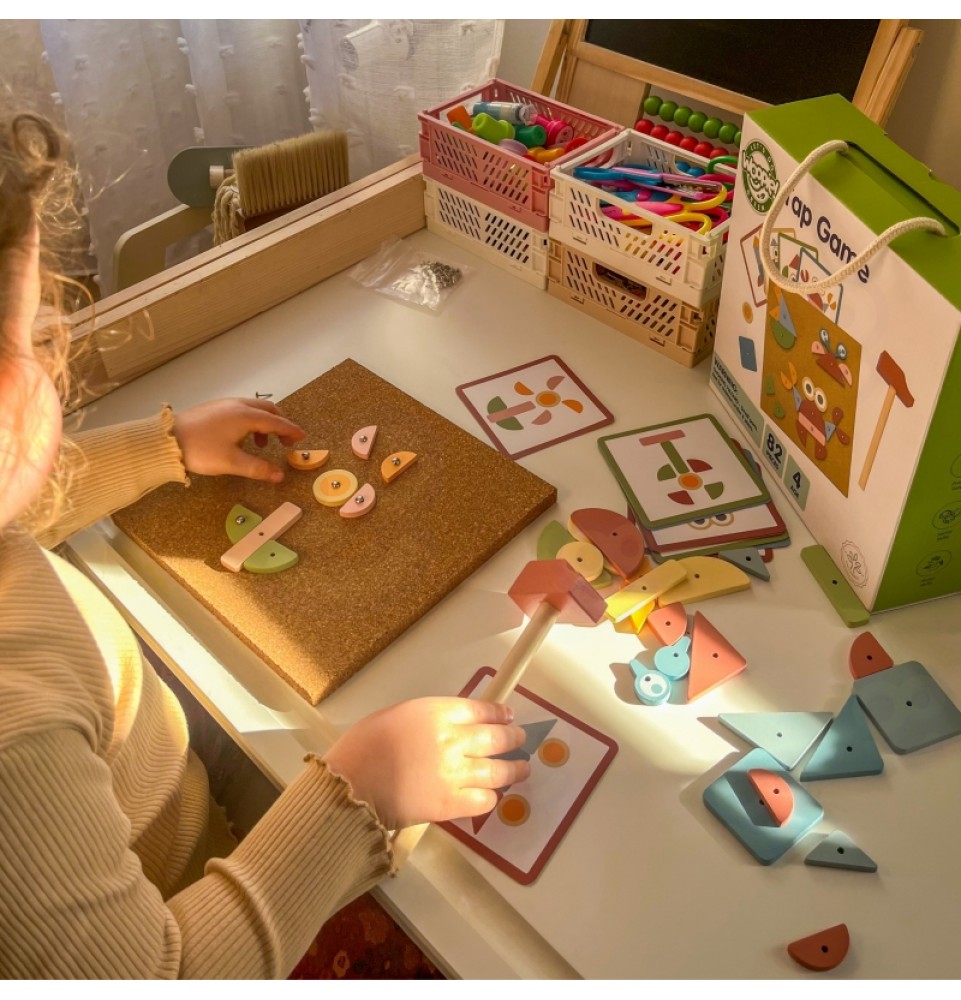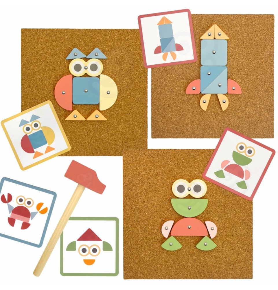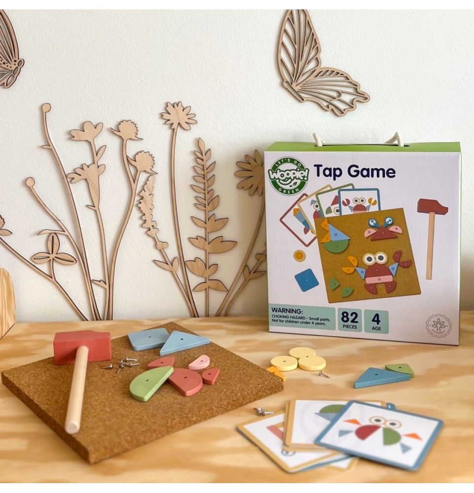 WOOPIE GREEN medinis dėlionės plaktukas su vinimis, 20 raštų, 82 vnt.