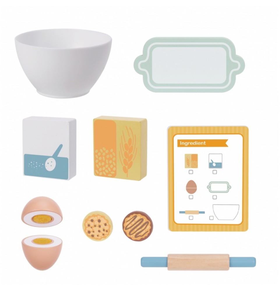 Rinkinį sudaro 11 dalių , įskaitant maišytuvą, dubenį, miltus, cukrų, kiaušinį su lipdukais, sausainius ir daugybę kitų priedų, kurie paįvairins bet kokį žaidimo laiką ir paskatins jūsų vaiką žaisti vaidmenimis. Tai užtikrina, kad nuobodulys niekada nedings!