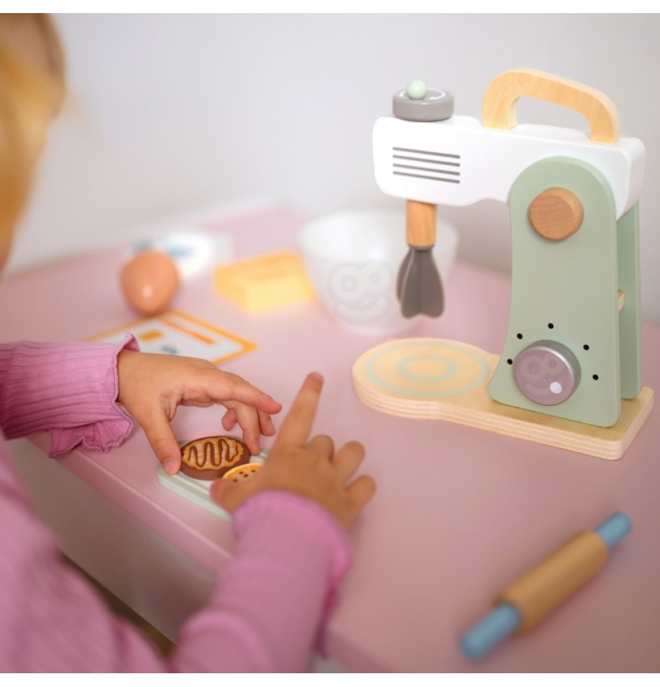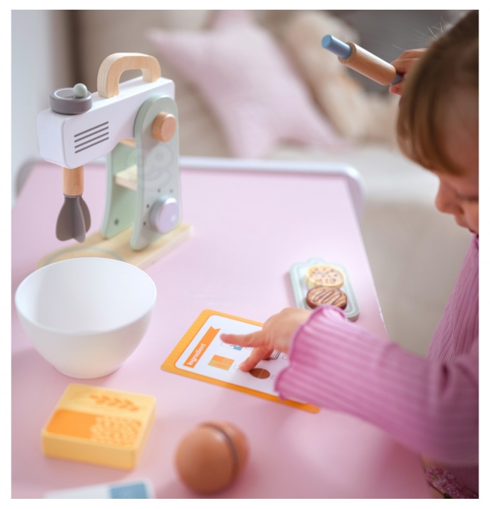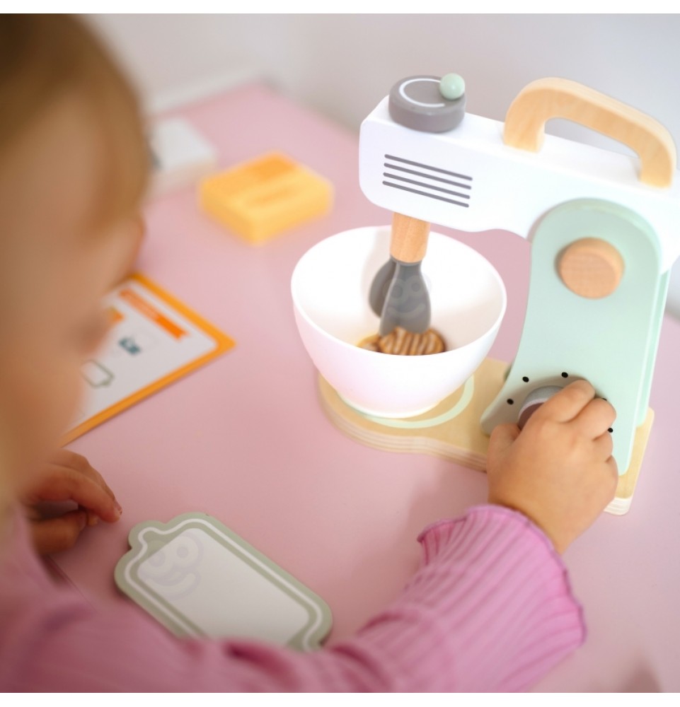 Laikas kažkam saldaus! Šį kartą jūsų vaikas paruoš desertą visai šeimai. Žaidimas su maišytuvu lavina vaizduotę , lavina kūrybiškumą ir gebėjimą mėgdžioti suaugusiuosius – tai, ką vaikai mėgsta labiausiai. Mediniai elementai yra saugūs ir malonūs liesti, o pastelinės spalvos suteikia žavesio bet kurios vaiko virtuvei.